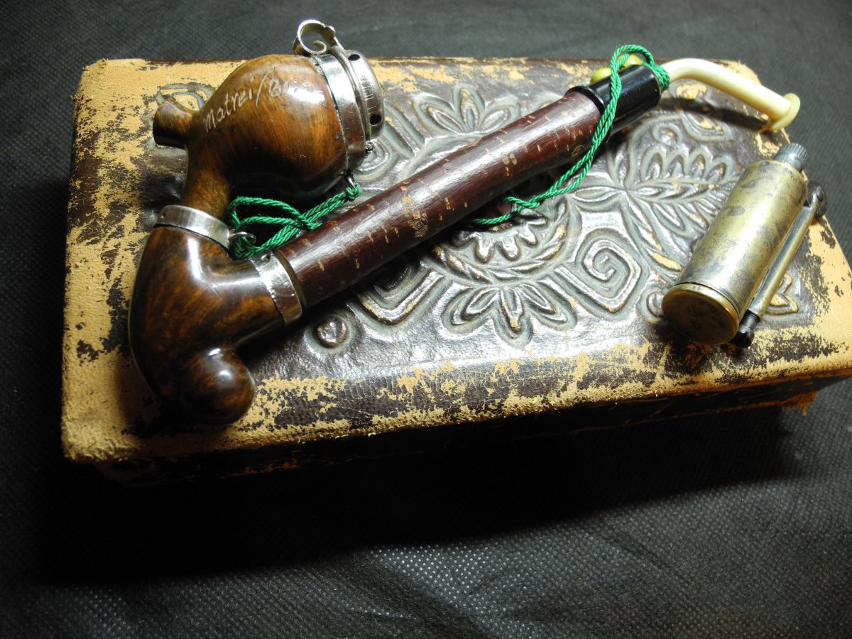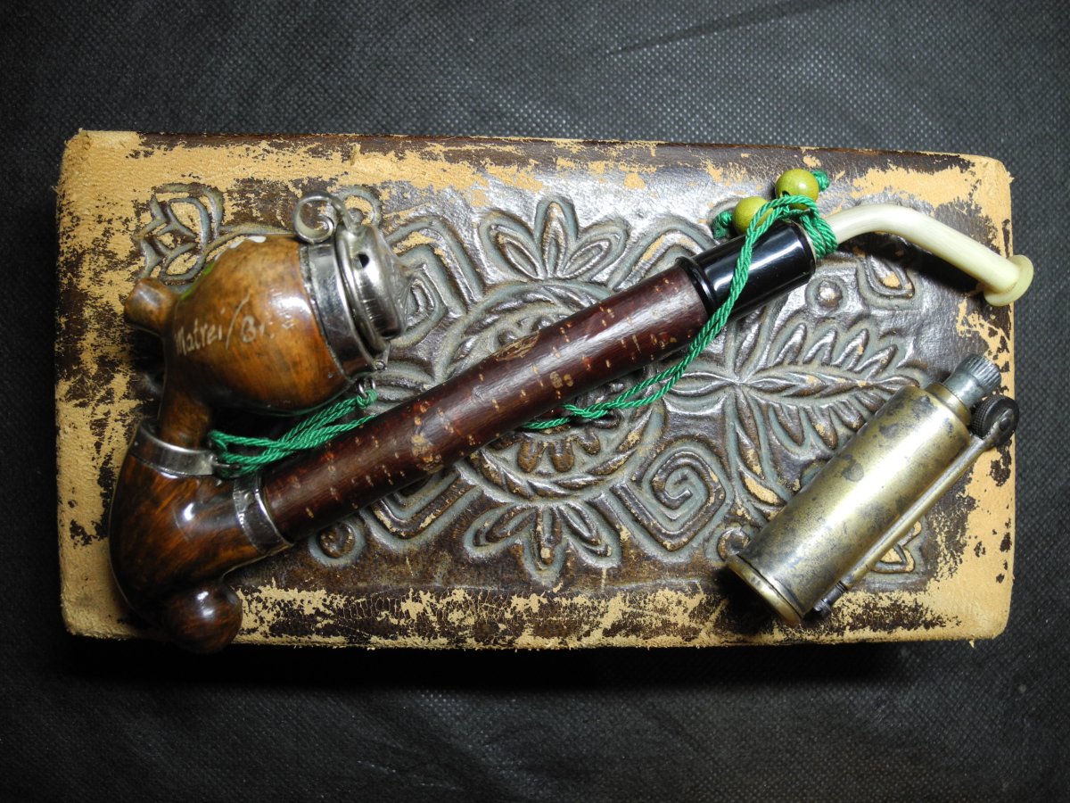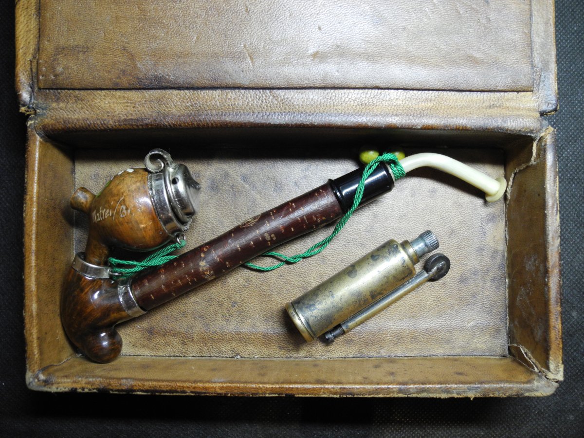 кожаная коробка, зажигалка, егерьская трубка - набор курильщика на ПМВ.