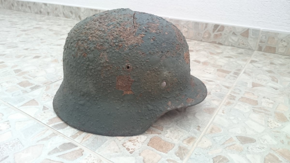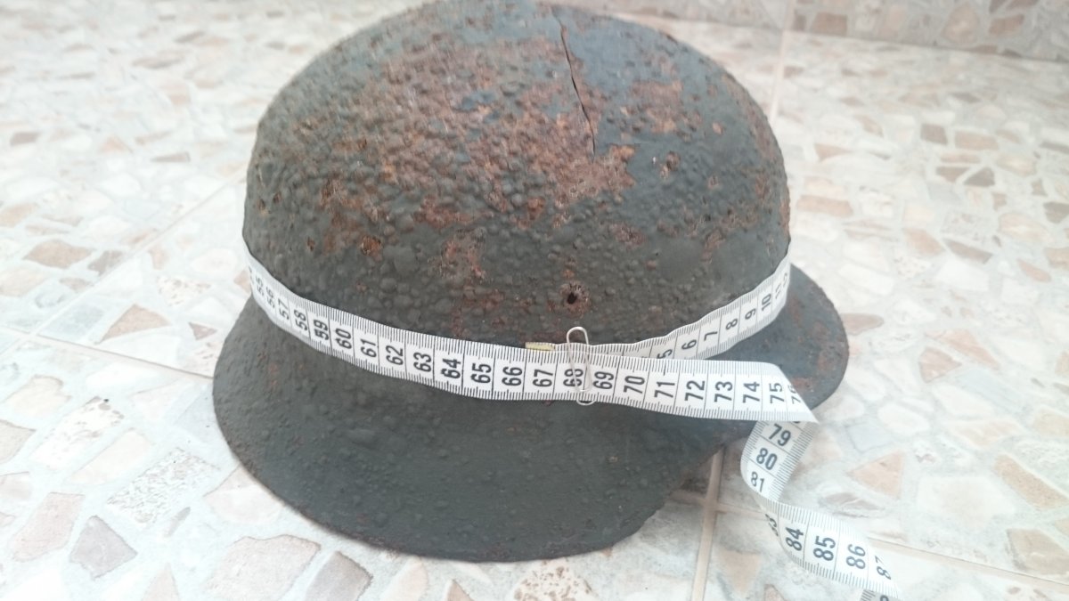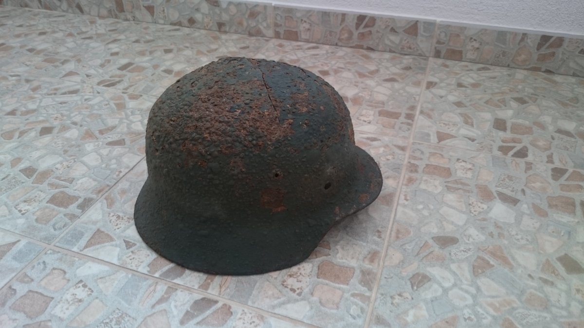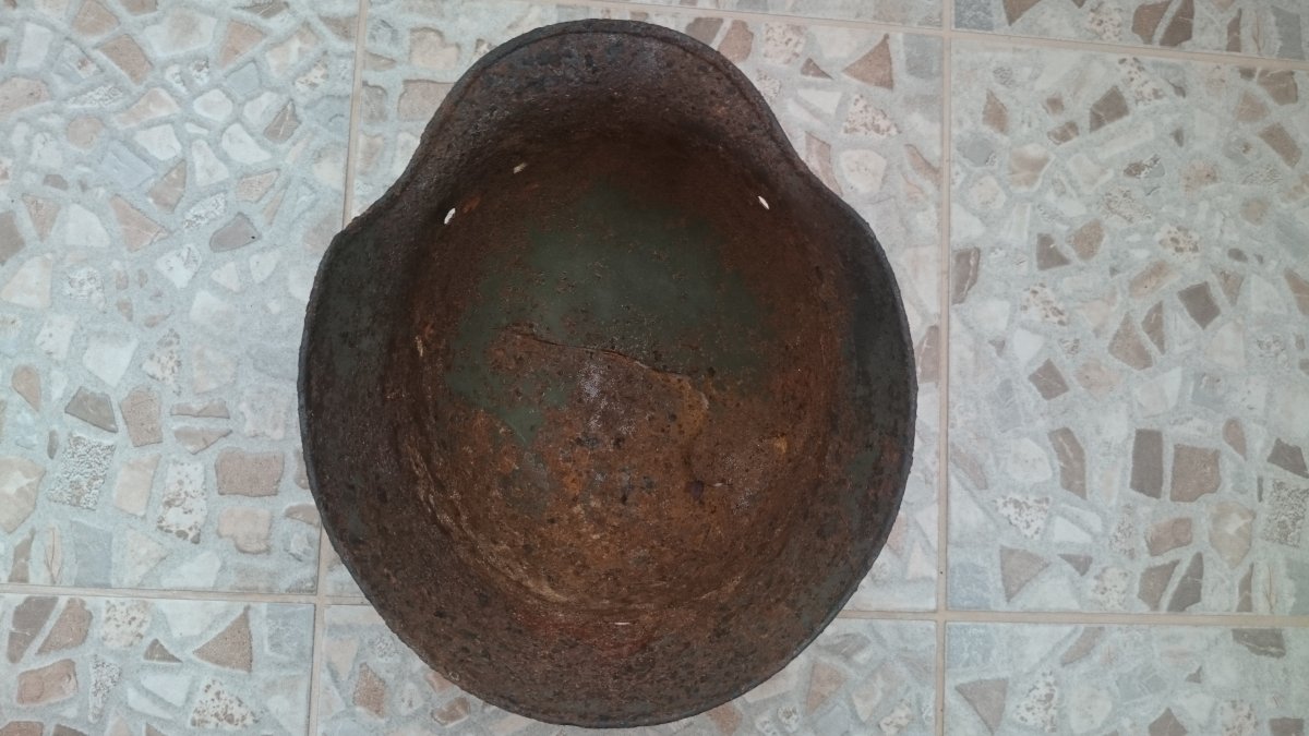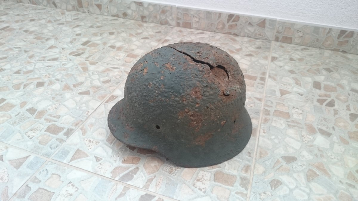 Антуражна каска з осколковим попаданням. Метал загалом міцний, але є кілька свищів. Пили немає. Проглядається клеймо ЕТ64. Каска легенько покислочена і змащена ВД-40. Бонусом додаю кріплення для підбородкового ремінця.