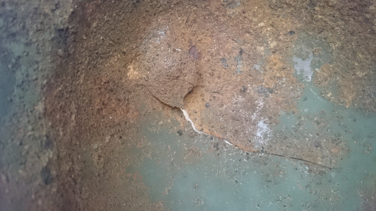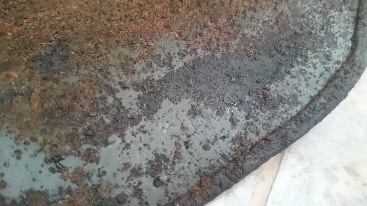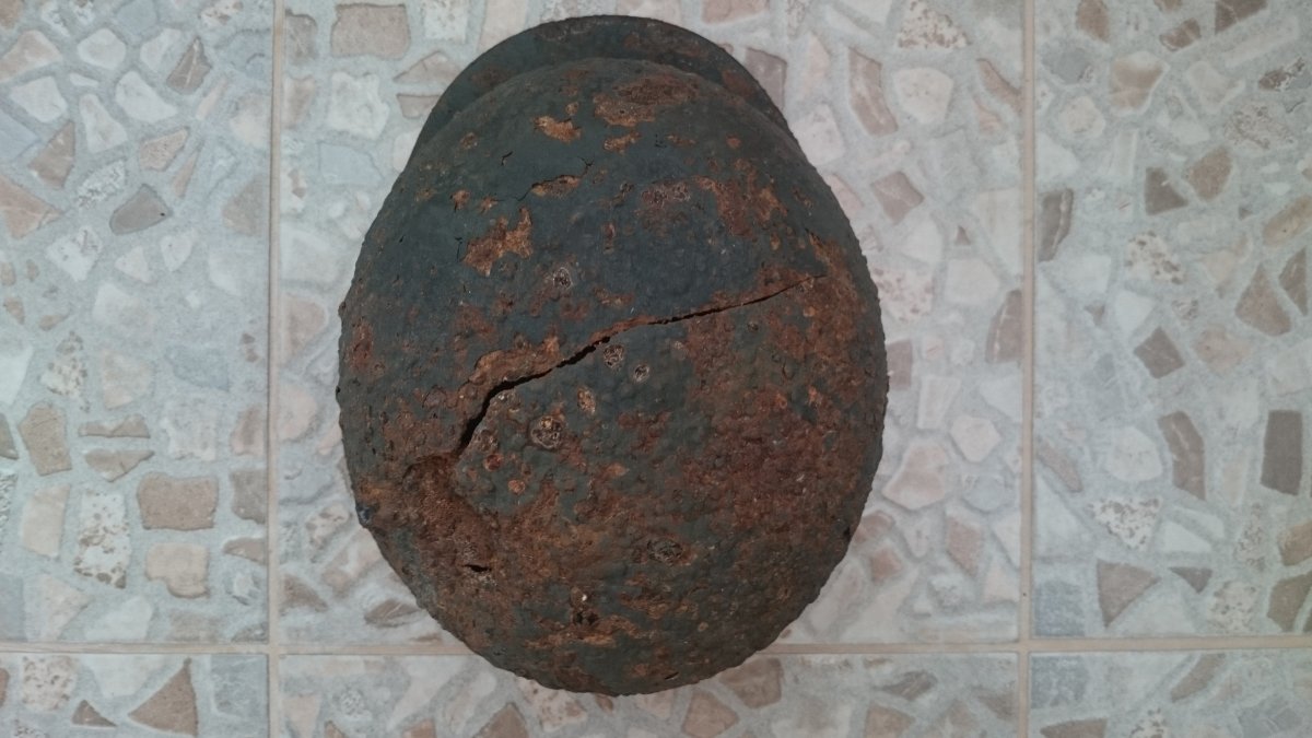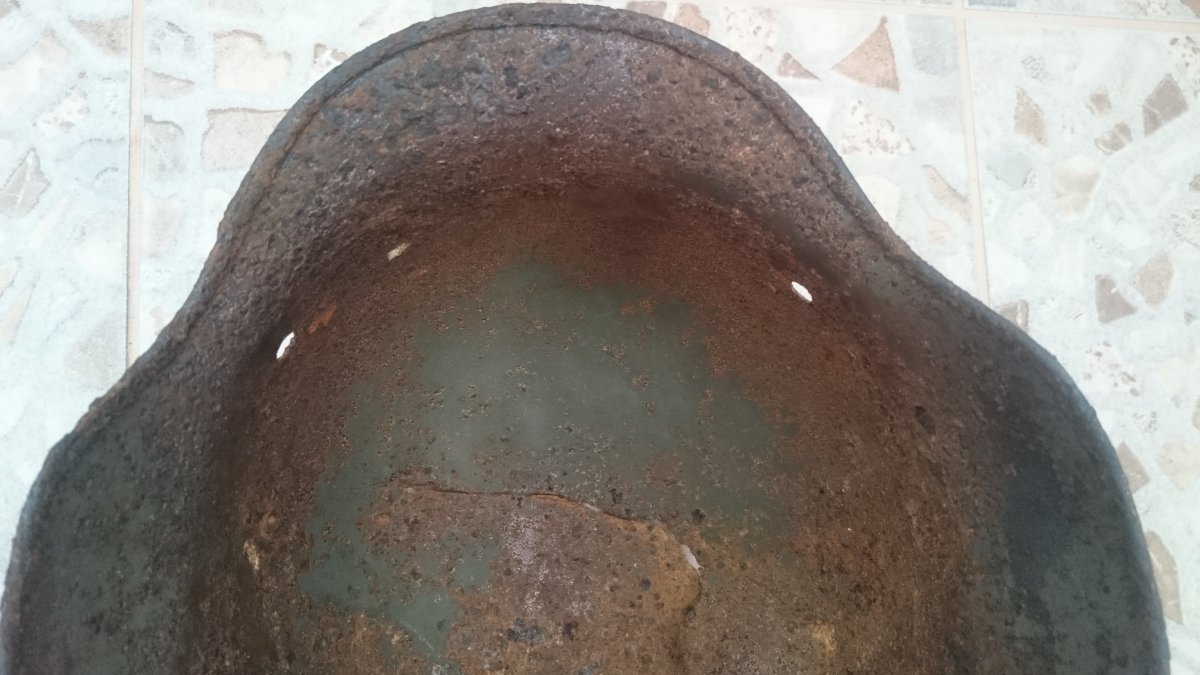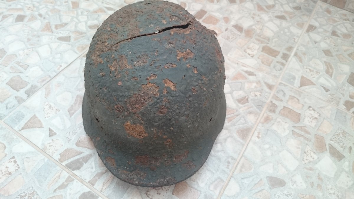 Антуражна каска з осколковим попаданням. Метал загалом міцний, але є кілька свищів. Пили немає. Проглядається клеймо ЕТ64. Каска легенько покислочена і змащена ВД-40. Бонусом додаю кріплення для підбородкового ремінця.