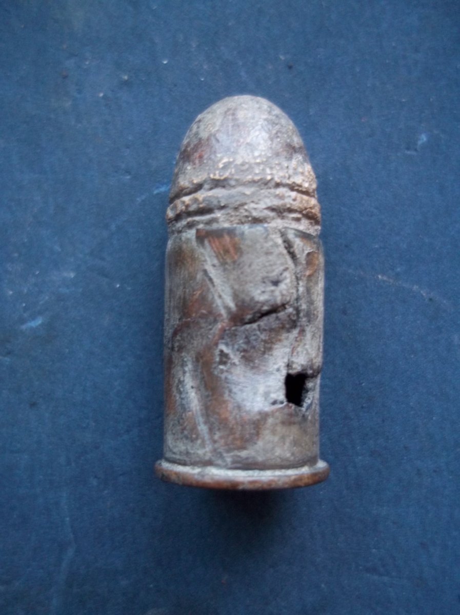 гільза деформована(видно на фото),куля не виймалась,тримається міцно,через отвір в гільзі висипається залишок пороху.патрон не митий, не чищений хімією,-лише суха чистка зубщіткою