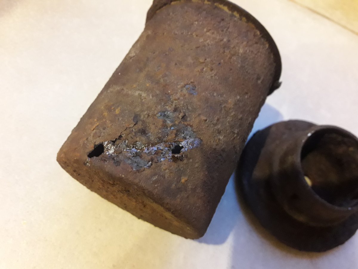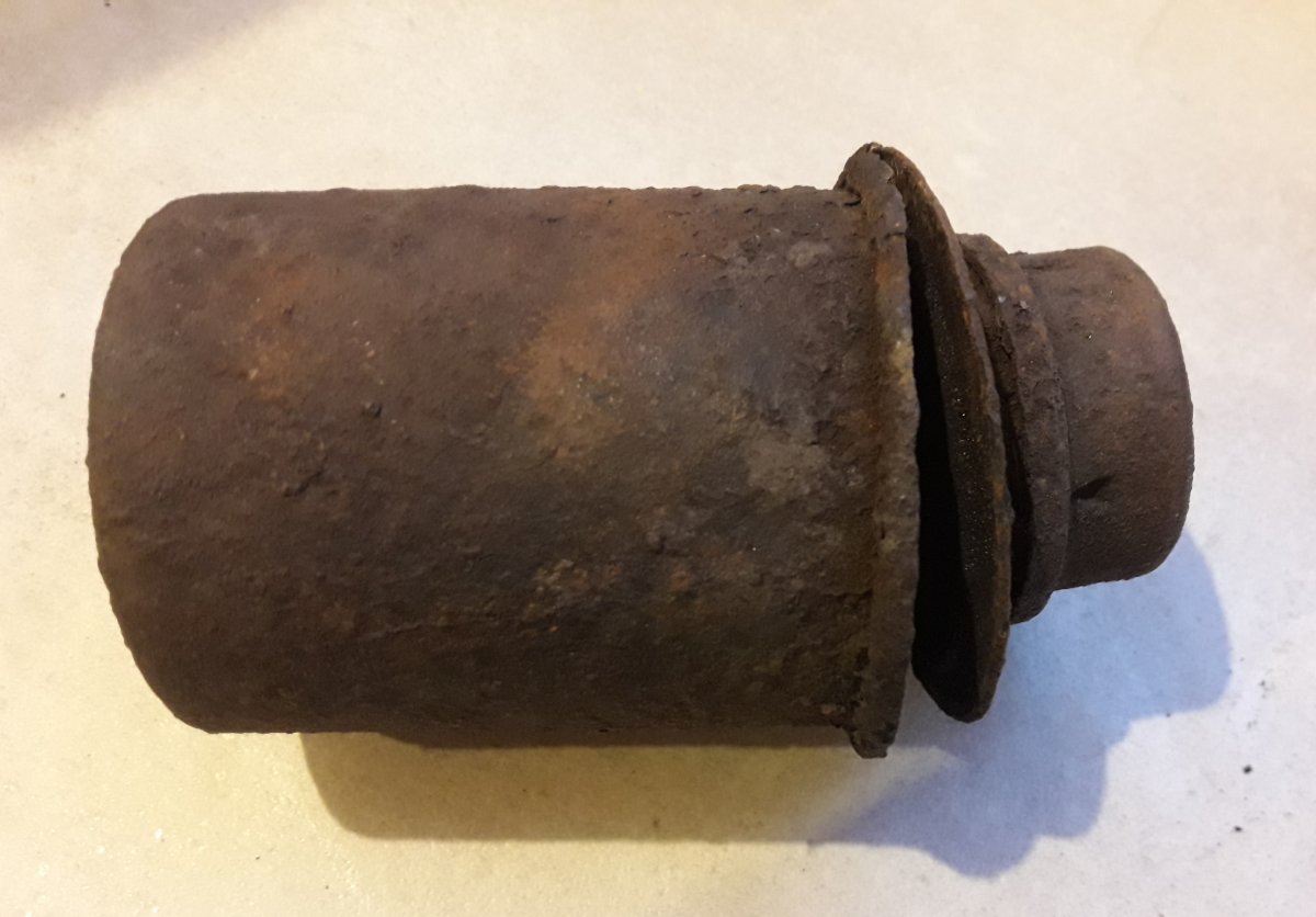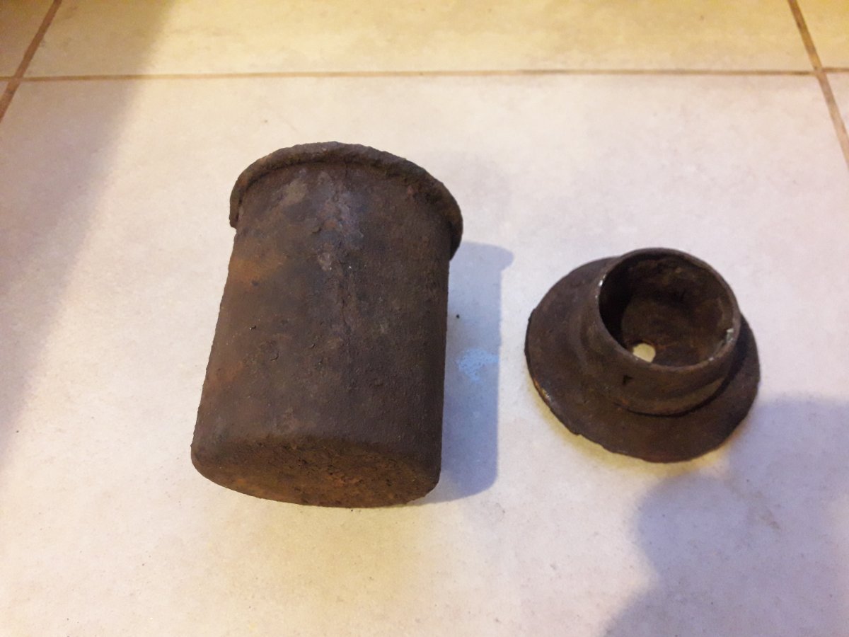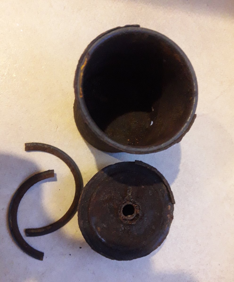 В лот входит банка Stielhandgranate м-24 (колотуха), утавшая и крышки (пробка с закруткой) на дымовые Blendkorper 2H, тоже потрепаные. По Blendkorper 2H - была наружная колба, в нее вставлена внутренняя и залеплено чем-то. Сами колбы разбились, а горлышки остались, может кому надо, или просто в нагрузку к колотухе.