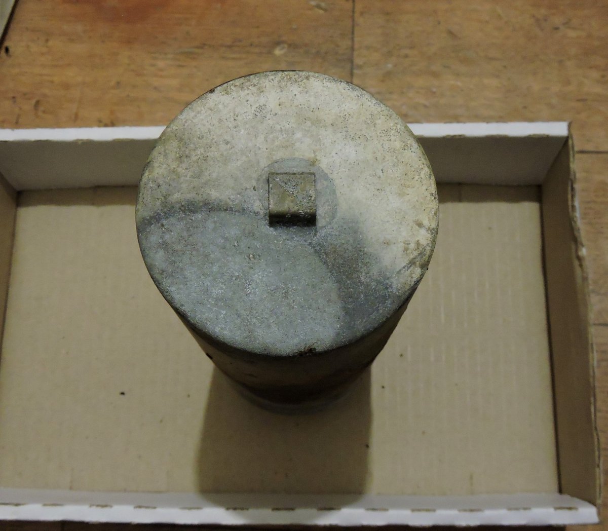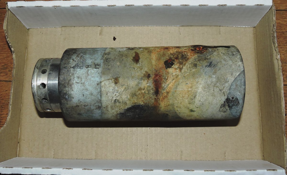 Дымовая граната с техники, была с пулевым или околочным ранением, шашка выгорела, часть корпуса расплавилось, обточил все что выступало. Пороха в вышебном тоже не было. Гранатка малость убитая но уже какая есть