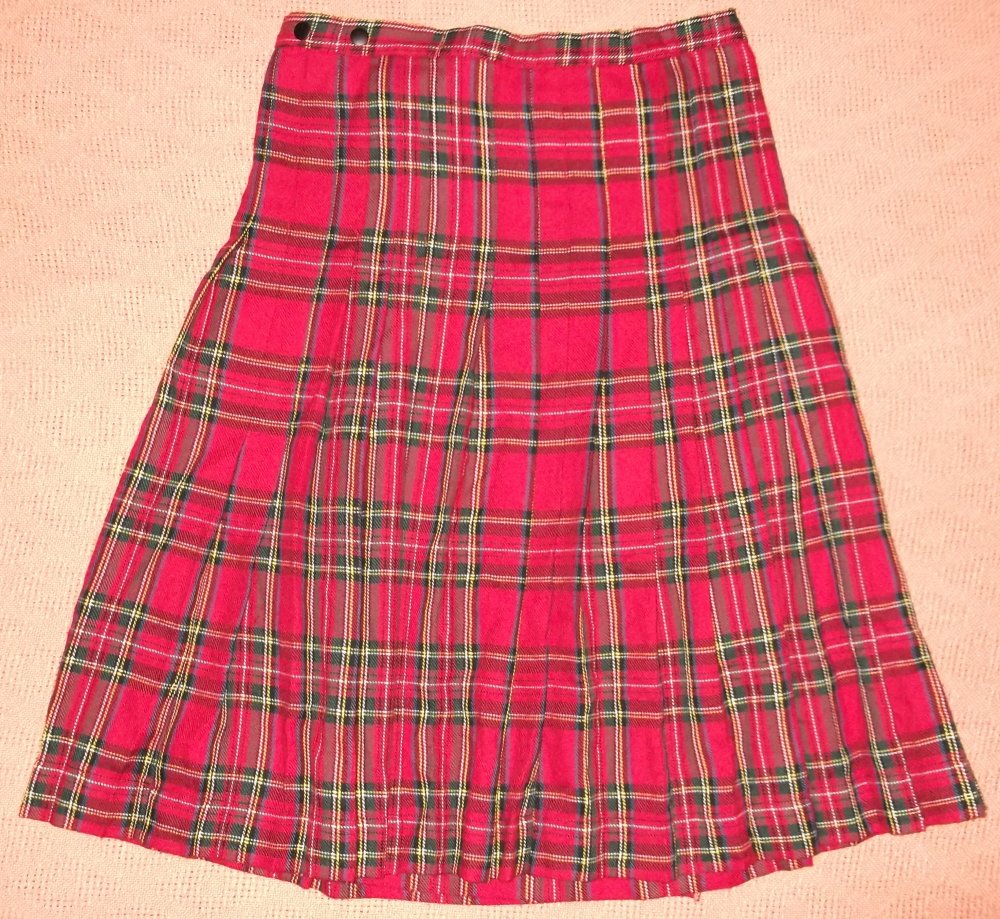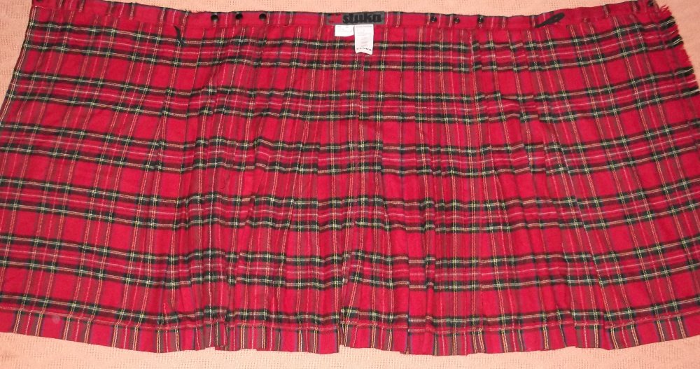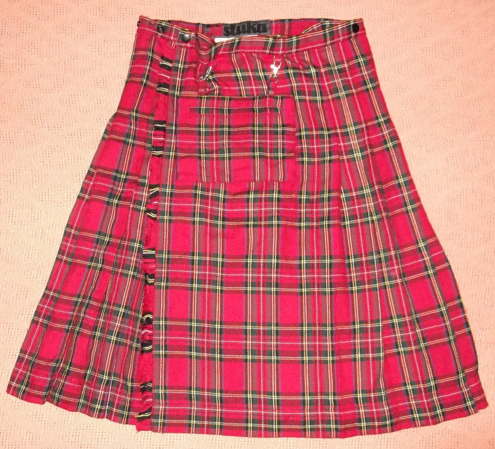 кілт голландської марки Stuka, дизайн "ШОТЛАНДКА", колір червоний (основний), колір клітинок: зелений/синій, лінії жовті/білі/сині, застібається на кнопках. Ззаду кілт гофрований, спереду має сумочку-кишеньку 200 х150 мм. Склад тканини: 65% поліестер, 35% Rayon (віскоза - високоякісний штучний шовк). Стан хороший.