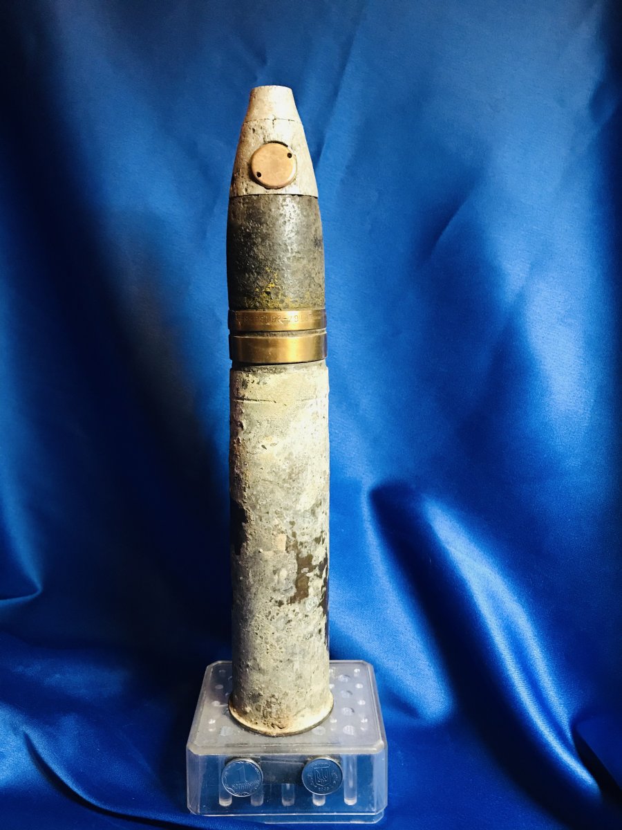 В продаже макет редкого авиационного осколочно фугасного боеприпаса 37мм M4. Гильзу не чистил, имеется трещинка и имеется полоса от лопаты. Резьбы в норме. Взрыватель разбирается и крутиться от руки.