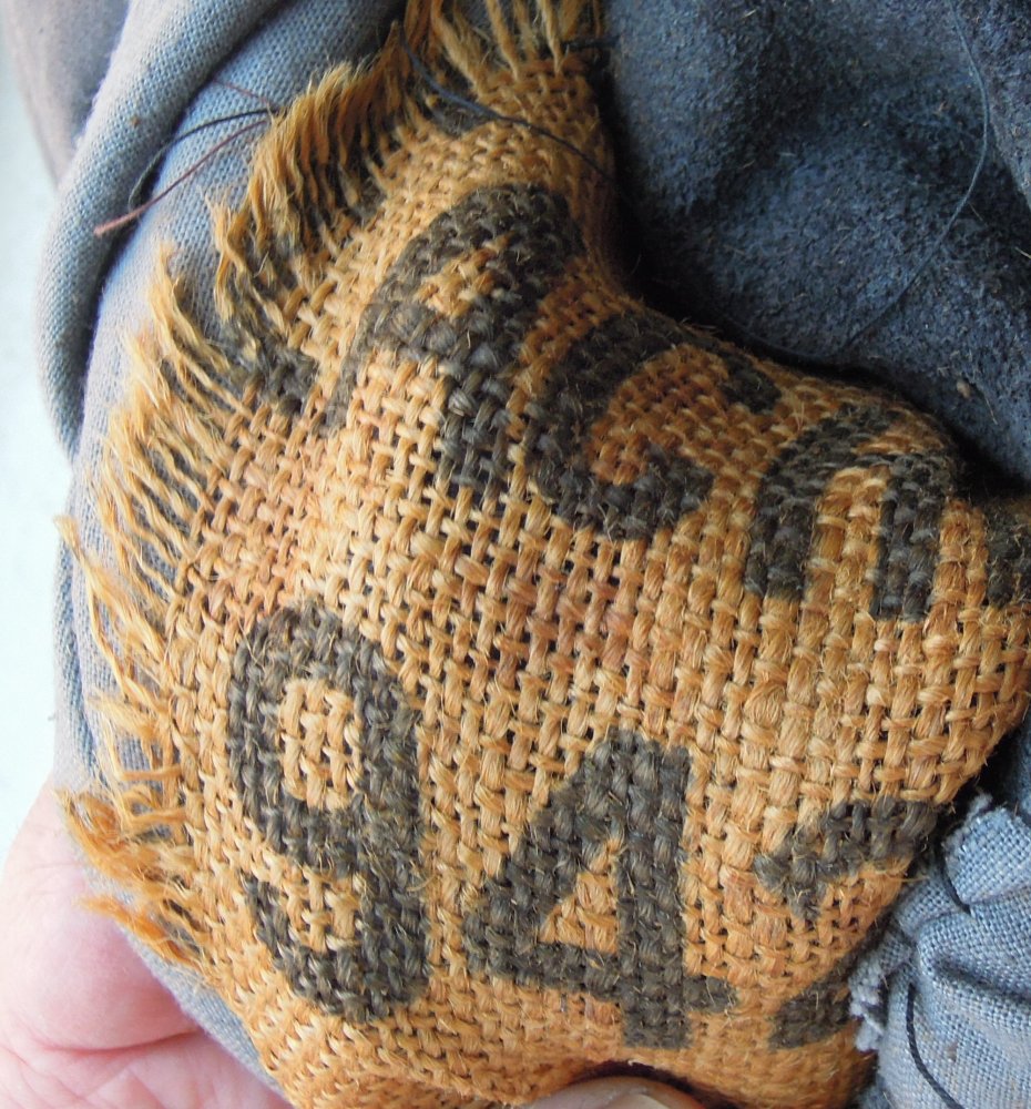 в середине в местах, где пришиваются пуговицы и прорези под них - есть качественная мешковина с частичными надписями