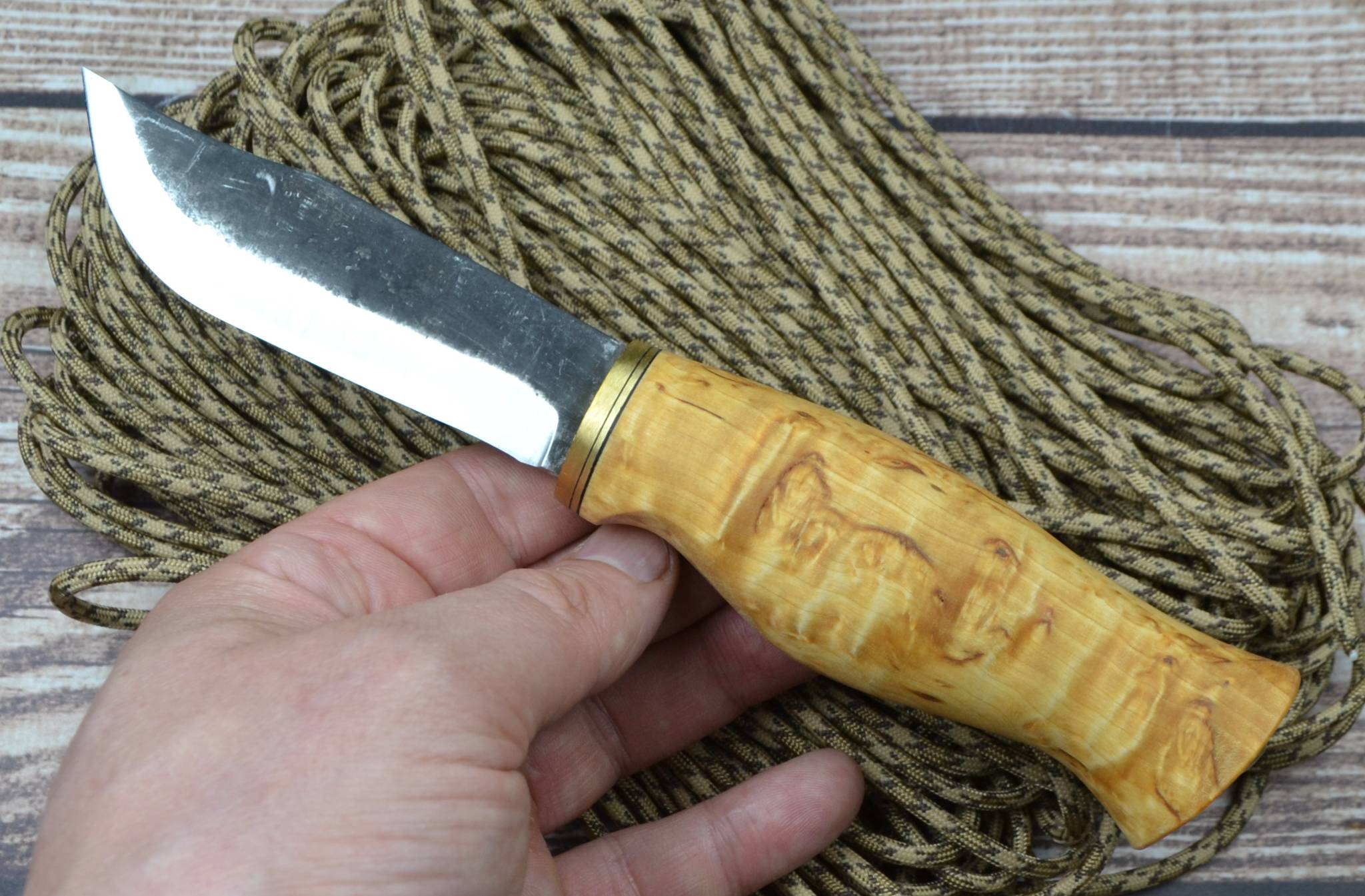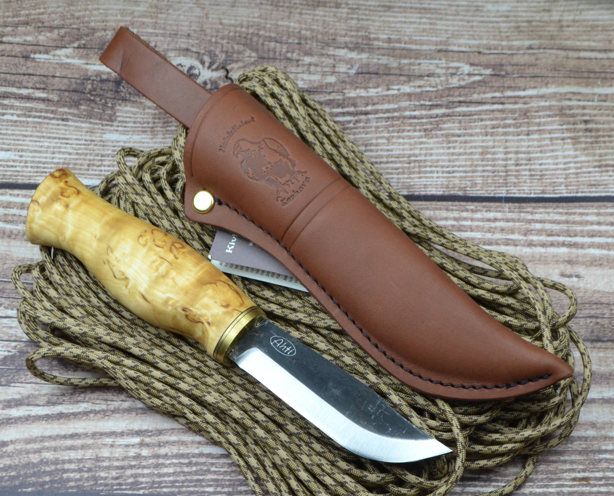 Фигурная рукоять бочкообразной формы позволяет надежно удерживать нож в руке. Выраженный изгиб в основании препятствует опасному соскальзыванию пальцев на клинок. Изготовлена рукоять из карельской березы, имеющей красивый, неповторяющийся узор волокон. Латунный полированный больстер не только служит украшением, но и придает ножу Ahti Jahti 9698 больше прочности.