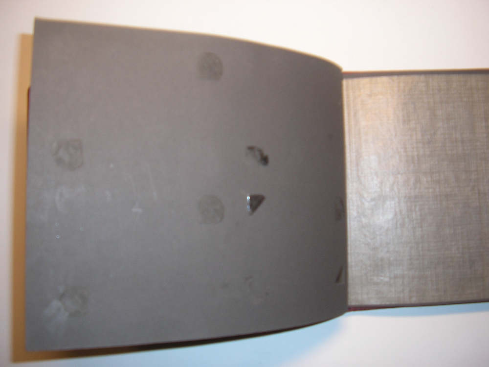 Размер листа – 26 см. х 18,5 см. с учетом 2 сантиметров слева под переплетом. Всего 24 листа (т.е. 48 страниц), плотный картон, темно-серый.