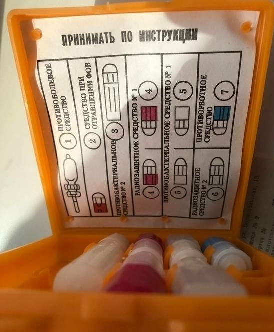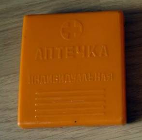 Являє собою оранжеву поліетиленову коробочку розмірів 9 см × 10 см × 2 см з надписом «Аптечка индивидуальная», хрестом у крузі та виступами для утримання. Маса — не більше 115 г. Всередині шптиц-тюбик (відсутній!), різнокольорові пенали з таблетками( удеяких лишились таблетки). Термін придатності становив 3 р.