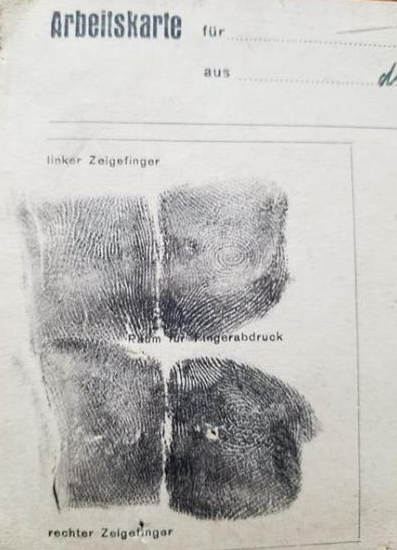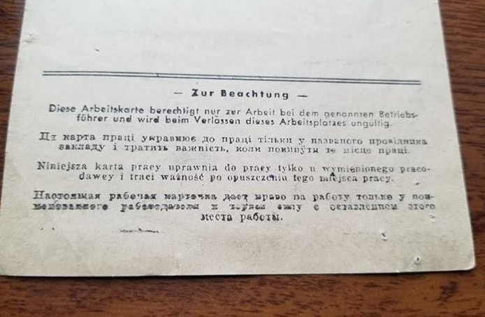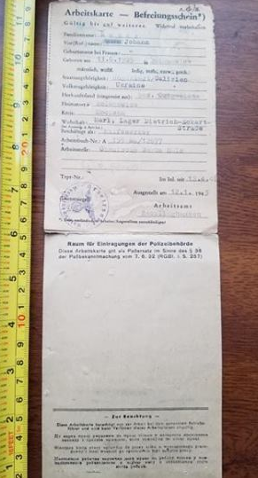 Все, как на фото. Оригинал. Много надписей и штампов. Иван Макар, из Мостиськи, Галиция. Работал с 1942 года - подсобным рабочим на Химзаводе в г. Реклингхаузен. Проживал рядом, в лагере в г. Марль, земля Северный Рейн-Вестфалия.