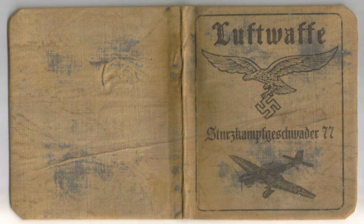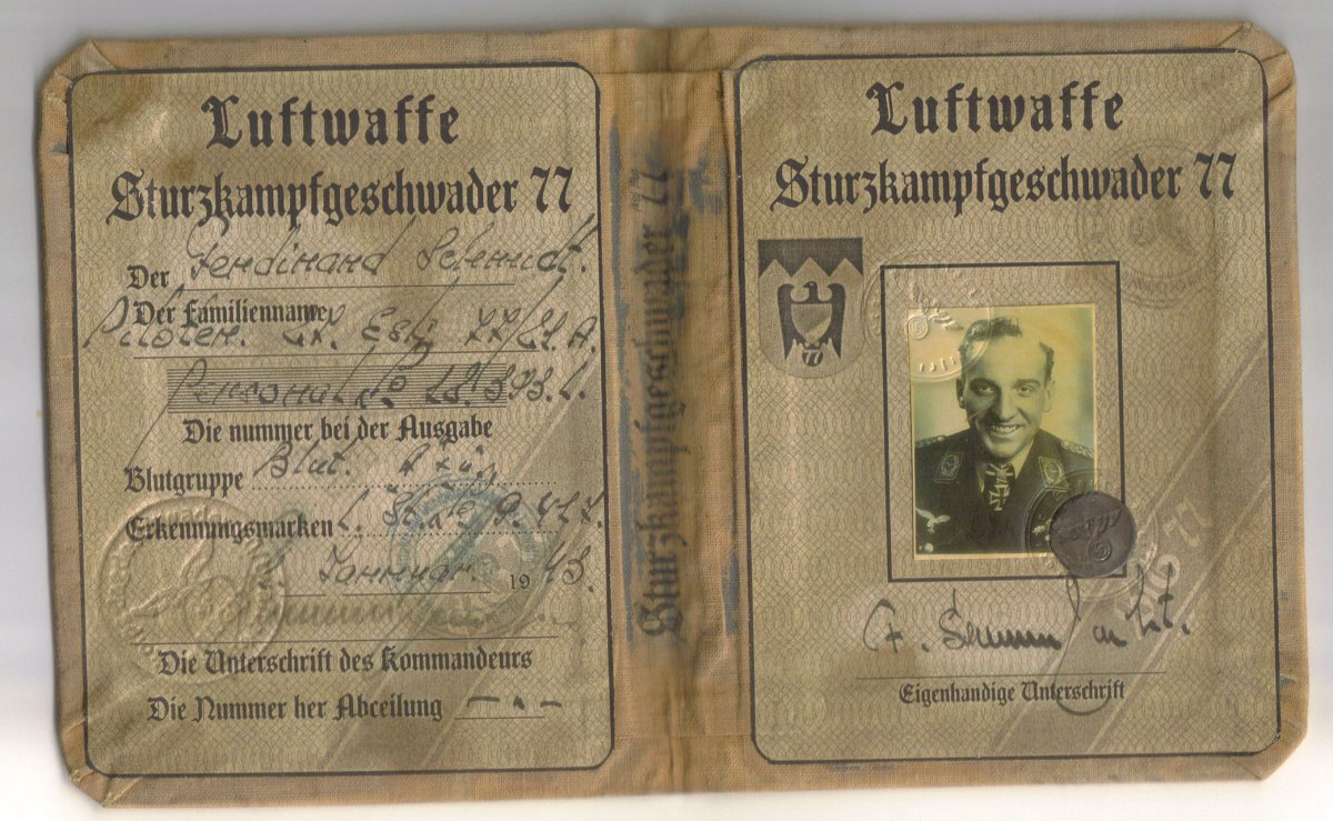 Аусвайс (Ausweis) удостоверение личности пилота Люфтваффе офицера пилот пикирующего бомбардировщика Ю-77 . Третий Рейх, Точная копия.
