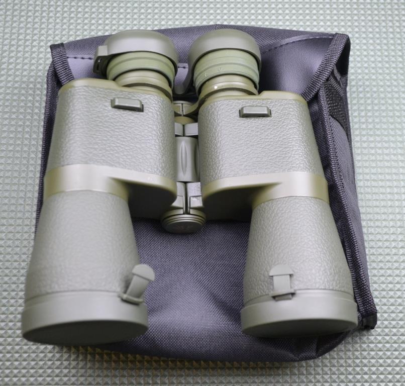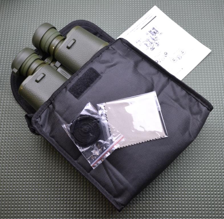 Бинокль Bassell 20x50 укомплектован мягким чехлом-сумкой из черной непромокаемой ткани с ремешком, ремешком для шейного ношения, резиновыми крышками для защиты окуляров и объективов, платком для ухода за оптикой