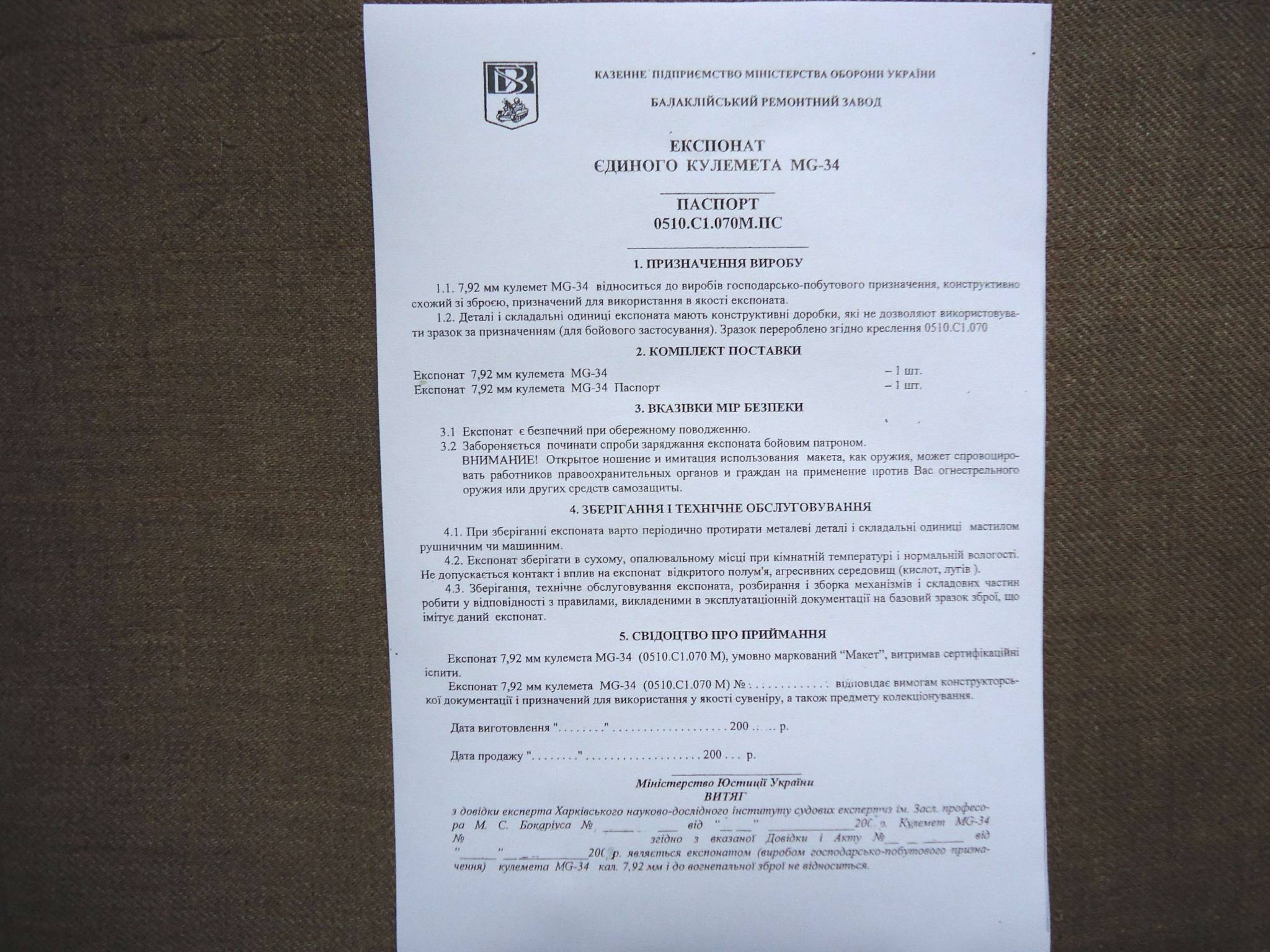 MG-34 Бланк паспорта MG-34 Новий