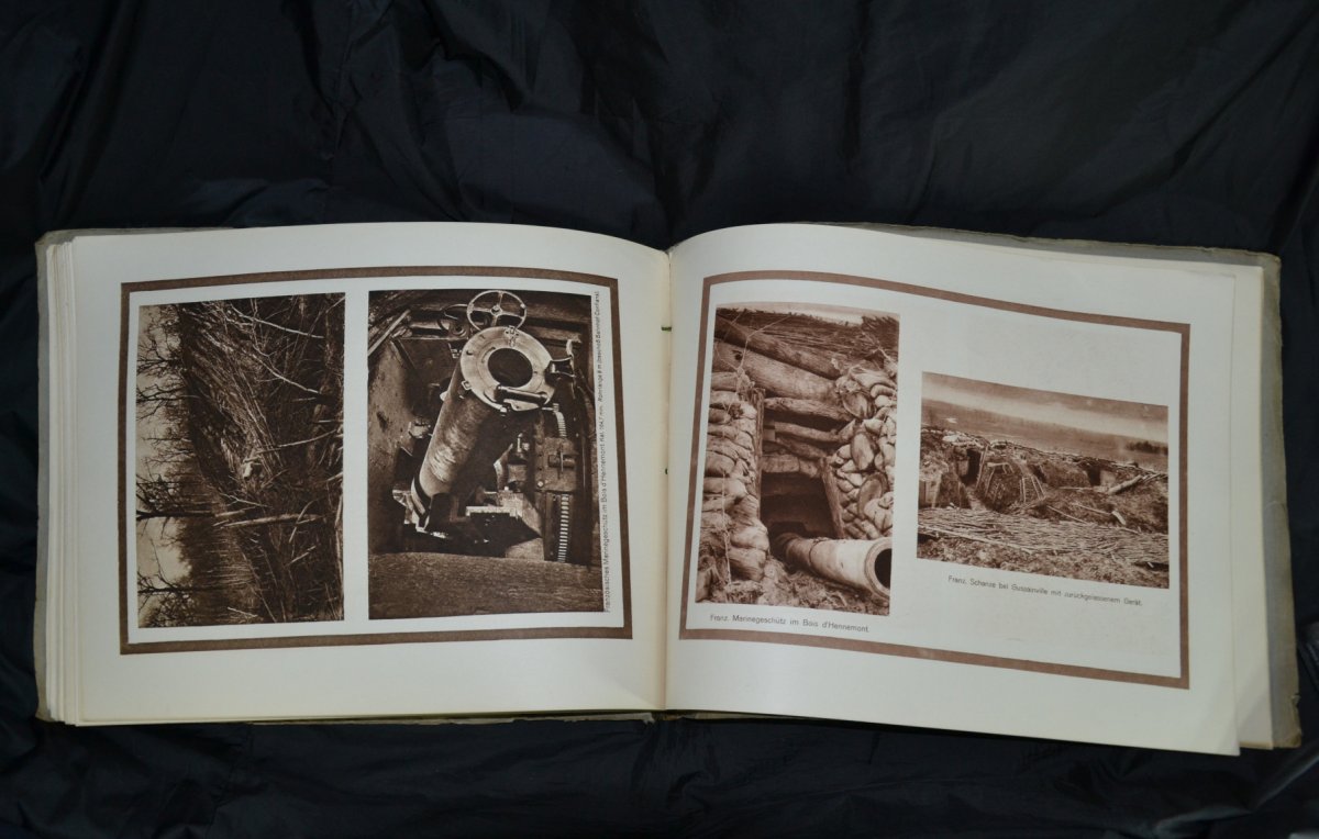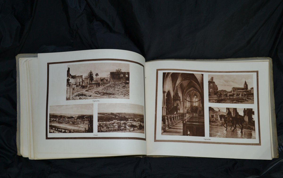 Замечательная фоторабота, содержащая 339 фотогравюр в тонах сепии, сделанных фотографом участком немецкой армии между реками Маас и Мозель, на которых изображены руины, солдаты и различные военные сцены.