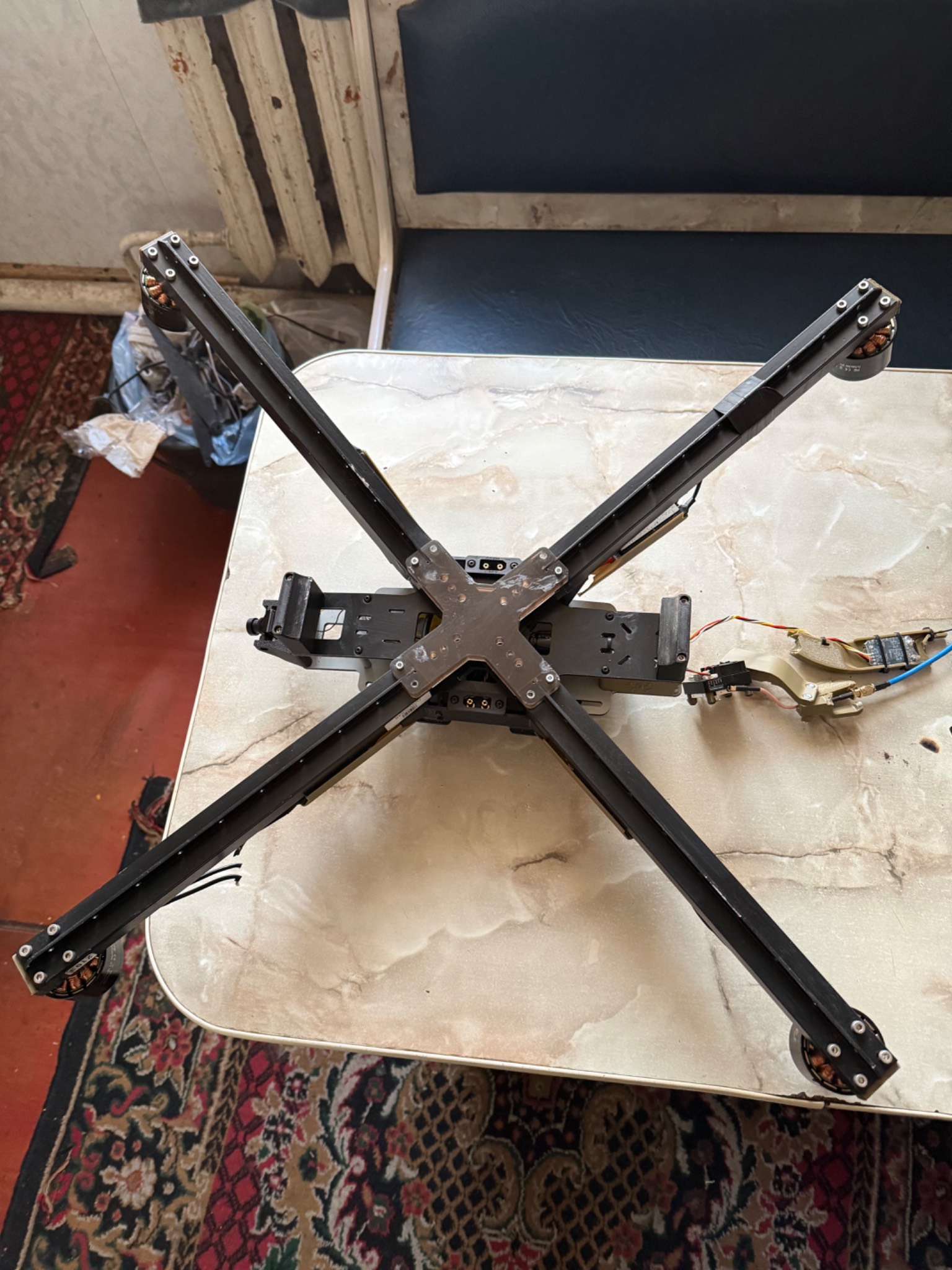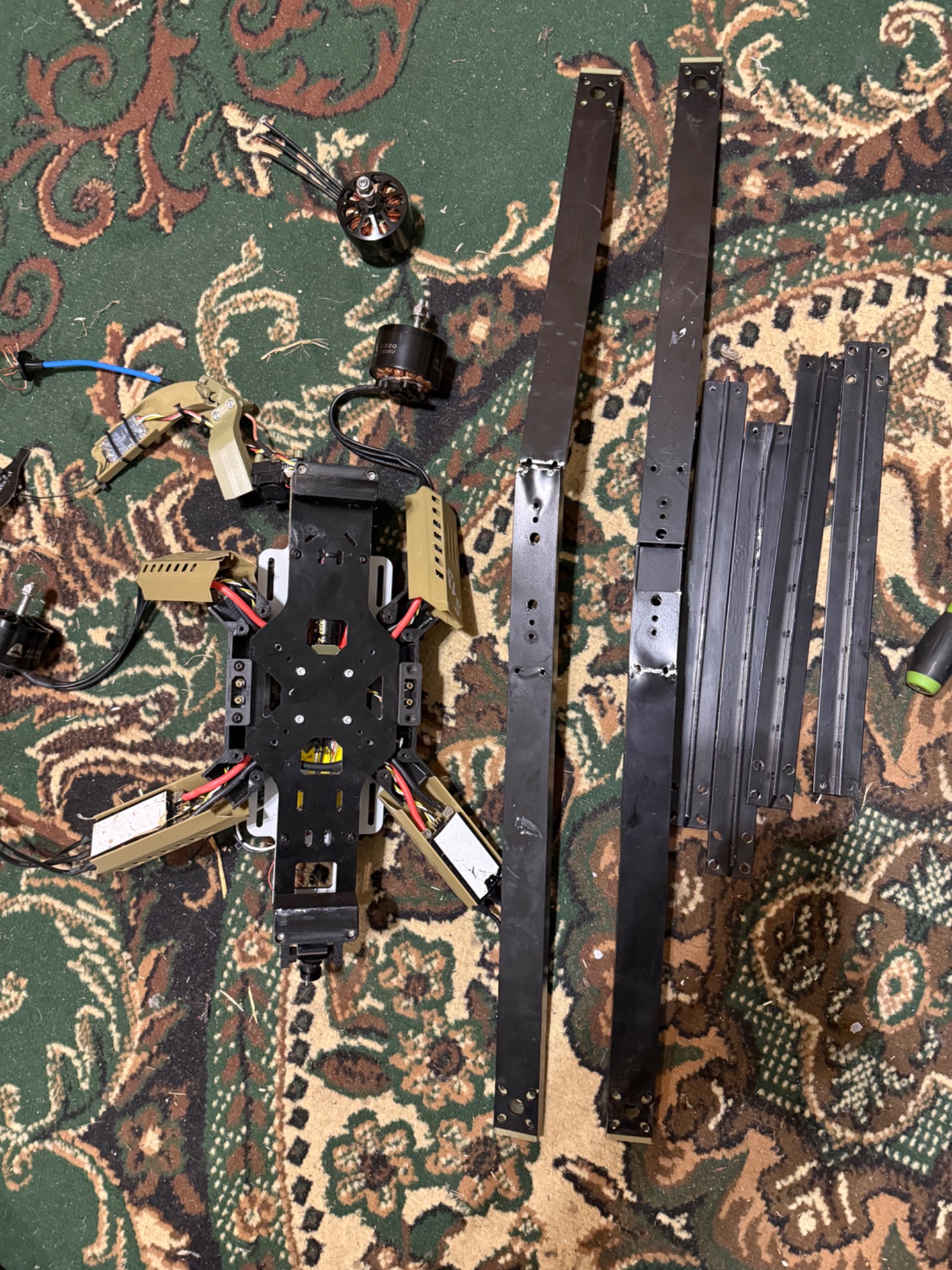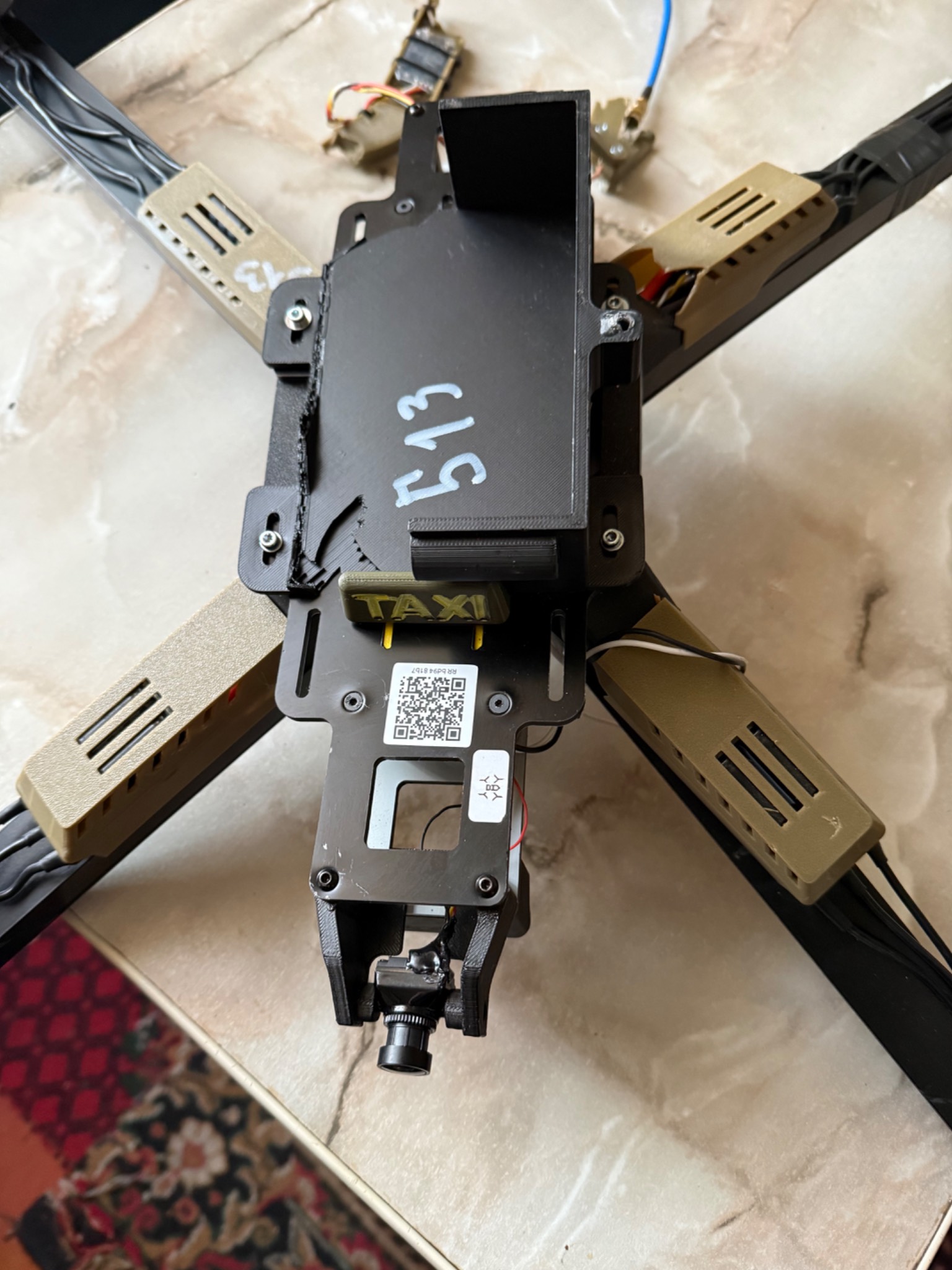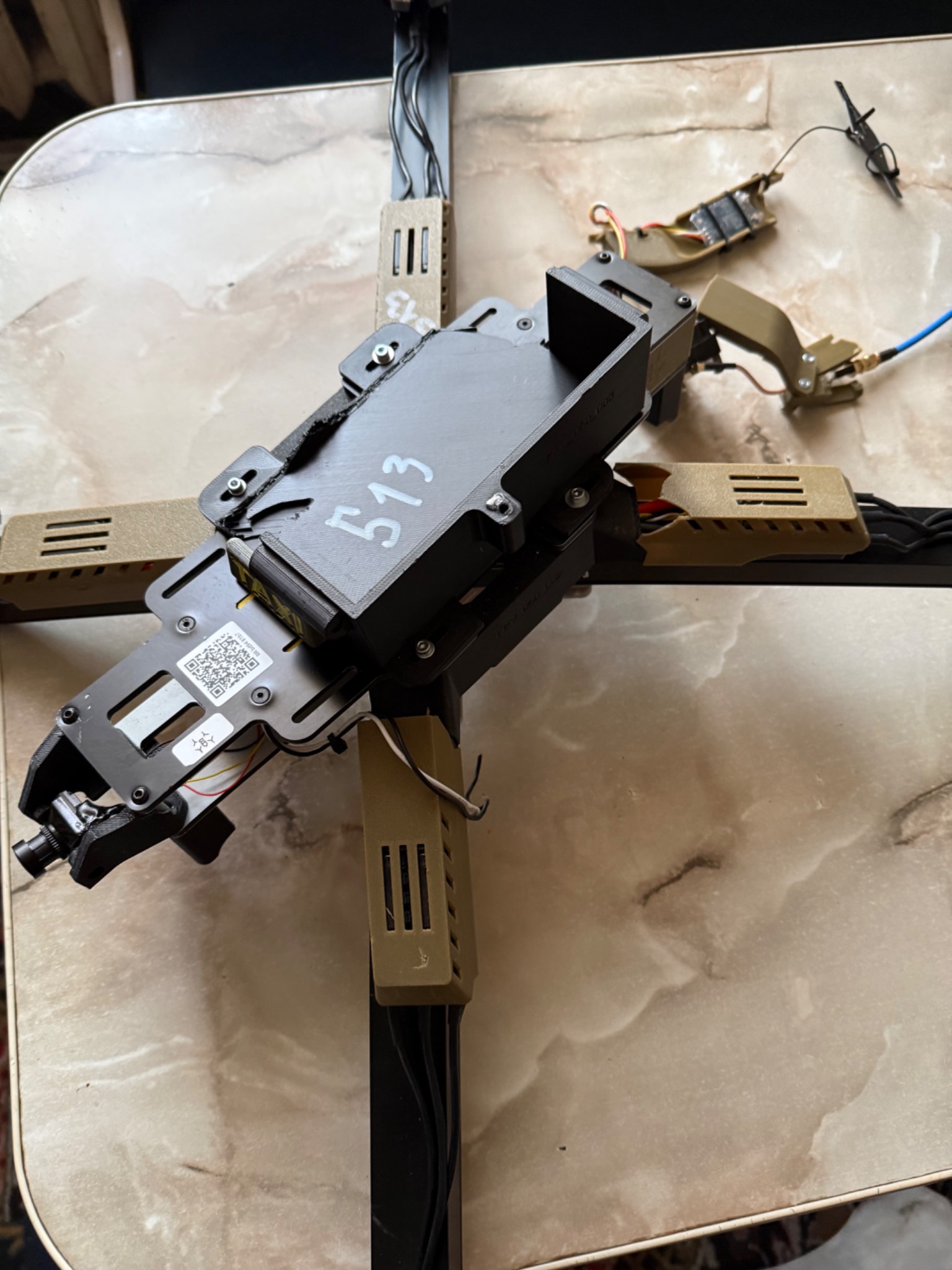 БПЛА з цілою електронікою, та пошкодженою при ударі рамою, яка складається з двох алюмінієвих профілів, де які запчастини надруковані на 3Д принтері теж мають пошкодження, двигуни крутяться, на одному двигуні перебиті провода(на фото). Рама акуратно знята, більше нічого не розбиралось. Всі недоліки на фото!
