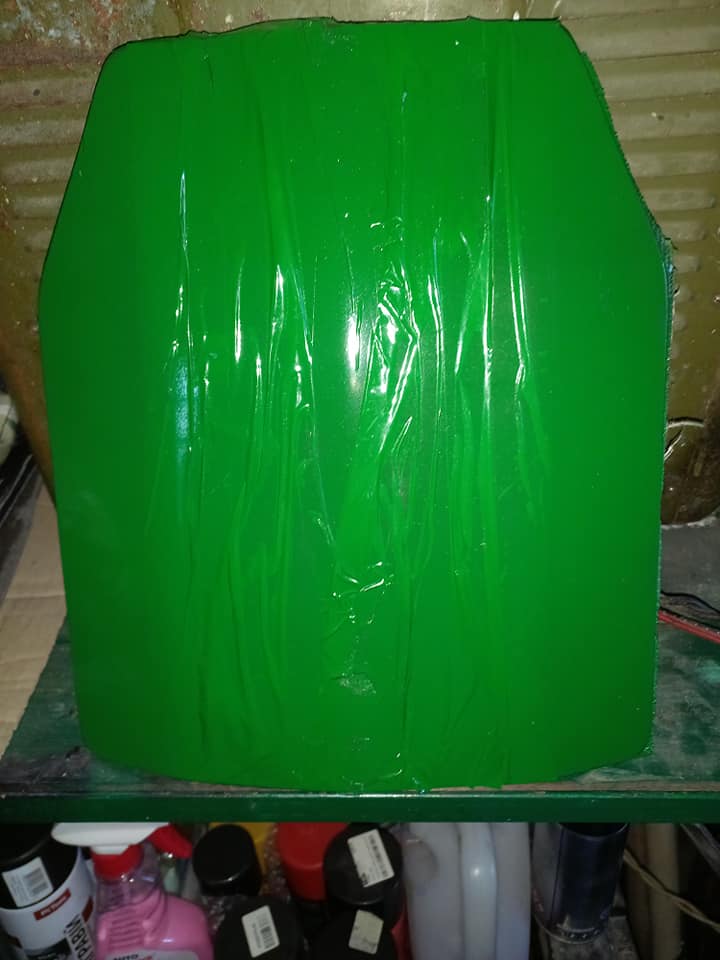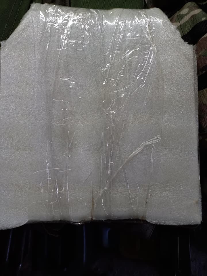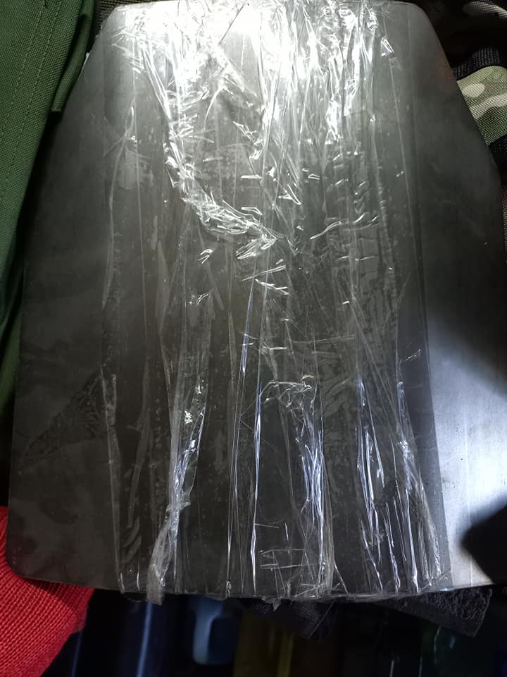 Бронеплити, спарені, складається з двох листів. НЕ сертифікована, але відстріляна. 5.45 тримає, на фото видно, що пробита лише перша плита, куля застрягла між двома плитами. Відстріл проводився з відстані 10 метрів. Вага такої одної спареної плити/броні 8 кг.
