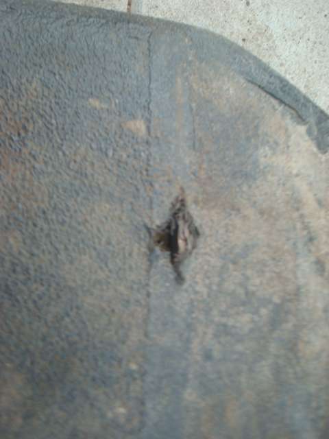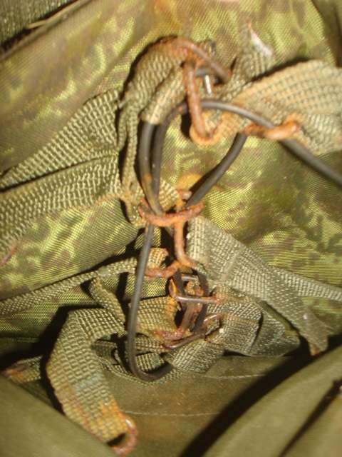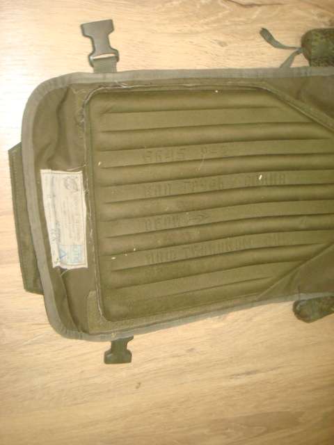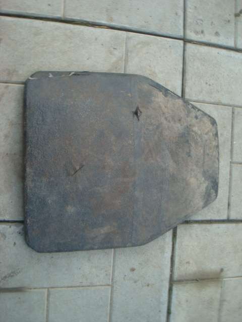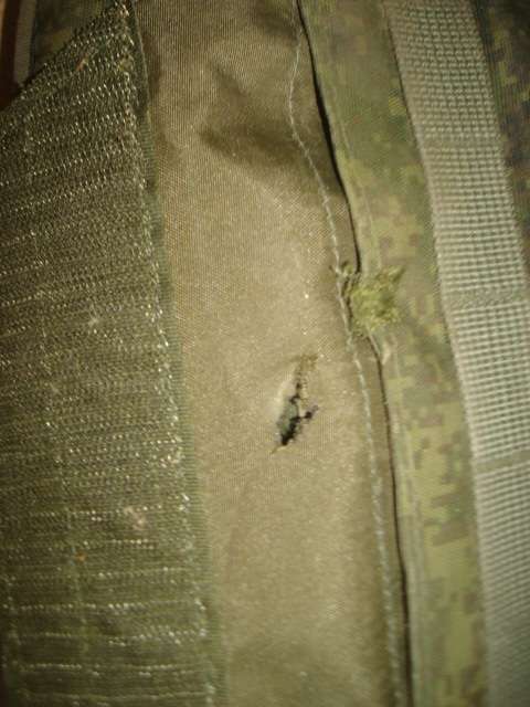 Комплектация полная, но одна из плит имеет повреждения, скорее всего осколочные. Сначала были найдены плиты, а потом бронежилет, так что гарантировать, что они с этого комплекта - не могу. Отдельные части бронежилета тоже имеют осколочные повреждения. Один из осколков застрял в подложке. Еще один, такой же, только без плит, но с подсумками и аптечкой, также с повреждением.