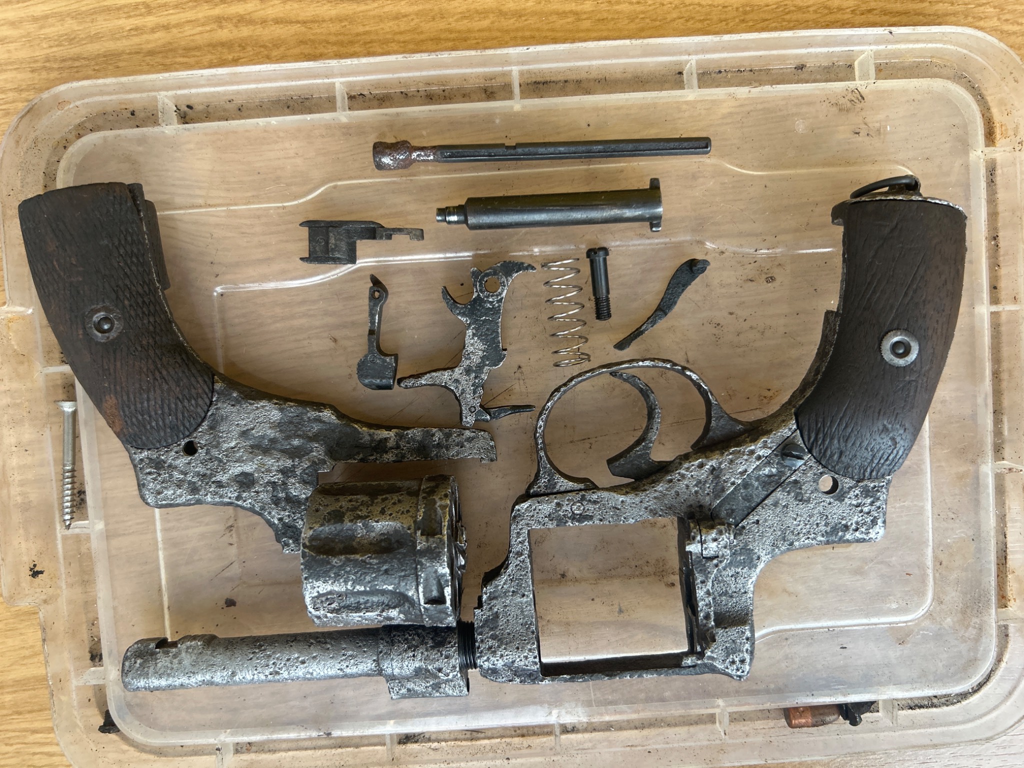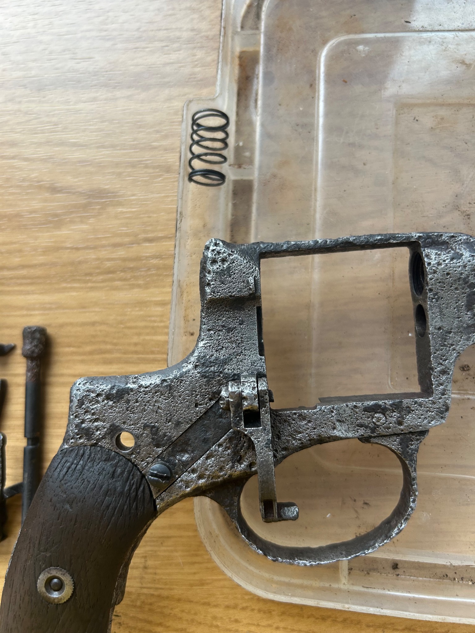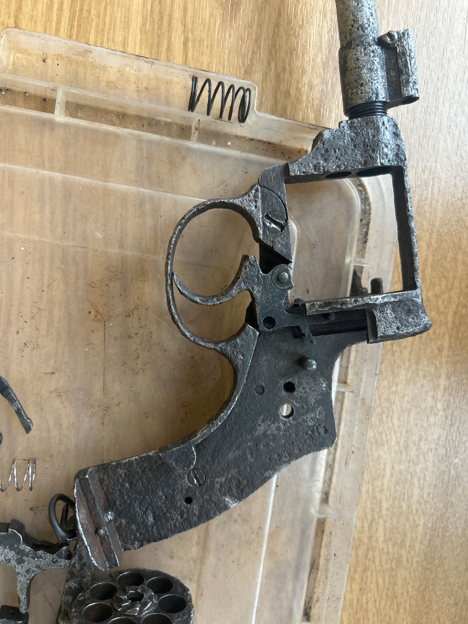 Наган цар солдат на молотках , доволі непоганий стан під схп , комори барабану нові так як був копаний з патронами в барабані - деактив два штифта, один під мушкою , другий під тримачем шомпола