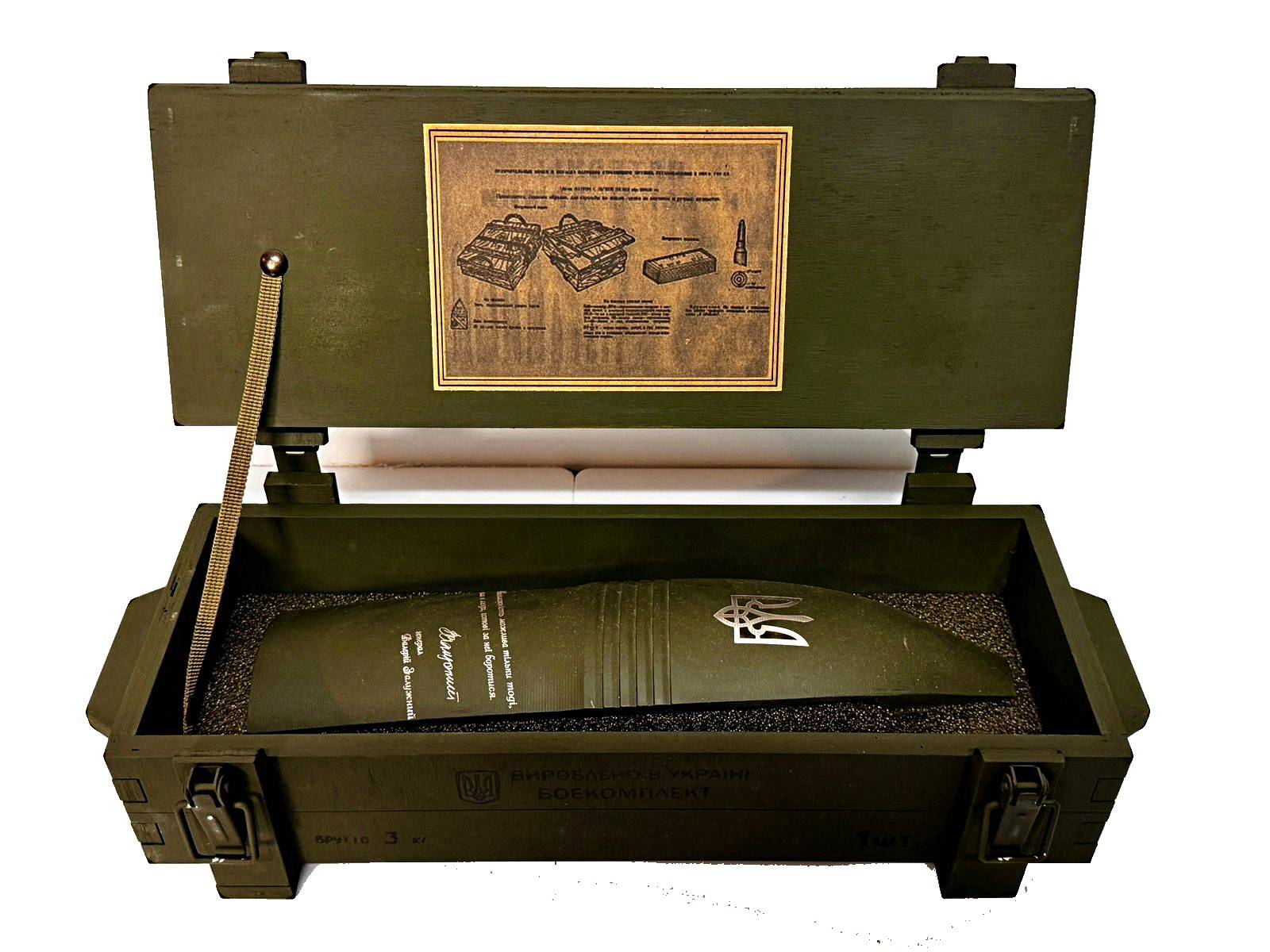 Унікальний лот, який займе гідне місце у Вашій колекції. Композиція складається з частини міни 120 калібру від міномета, на якій лазерним гравіюванням нанесена цитата генерала Валерія Залужного та його електронний підпис, а також скриньки транспортування. 120-й міномет – найбільший розмір у серії цієї зброї. Міномет є різновидом конструкції полкового міномета зразка 1943 року - ПМ-43. Основними нововведеннями стало використання сучасніших матеріалів, що дозволило зменшити загальну масу міномета. Заряджання проводиться з дульного боку. Міномет виконаний за класичною схемою уявного трикутника. Тильна частина упирається у спеціальну опорну плиту. Плита та двонога встановлюються в ґрунт. Ця позиція була доставлена нам із запорізького напрямку. Поставляється в ефектній дерев'яній скриньці оливного забарвлення. Особливо за душу бере фраза Залужного. НАША ЄДНІСТЬ — ЦЕ НАША ЗБРОЯ І НАША СИЛА! Це головне, це постійно має бути в нашій свідомості і визначити наші дії. В умовах війни все це набуло нового сенсу і нового змісту. Саме єдність - це наша головна зброя, яка породжує рішучість, незламність і віру в Перемогу. Бо від цього залежать наша свобода і незалежність.