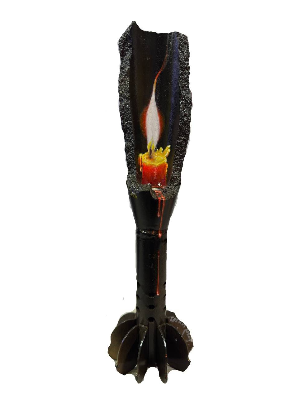 Ще одна експозиція – уламок мінометної міни калібру 82 мм, розмальована в майстерні за допомогою акрилових фарб. Міна, як ефективний артилерійський засіб, є високотехнологічним пристроєм, здатним вражати цілі на значній відстані. В основі її конструкції лежать складні інженерні рішення, що дозволяють забезпечити максимальну точність та руйнівну силу. Міномет, у свою чергу, є основним носієм цієї бойової установки, здатним стріляти як осколковими, так і фугасними снарядами, що робить його універсальним інструментом в арсеналі збройних сил. Коли мінометна міна встановлюється в ствол міномета, починається процес, який звучить як симфонія війни. Важливо, що правильний розрахунок кута нахилу та початкової швидкості пострілу визначає успіх пострілу. З моменту, коли міна залишає дуло, вона піднімається в повітря, долаючи інерцію, і, слідуючи заданій траєкторії, обрушується на ворога, викликаючи руйнування та панічні настрої серед противника. Сучасні технології, такі як GPS-навігація та автоматизовані системи керування вогнем, значно підвищують ефективність мінометних стрільб. Таким чином, мінометна міна залишається одним із ключових елементів у контексті сучасних бойових дій. Ця експозиція несе в собі виключно декоративний характер, тому що внутрішній механізм, запал та детектор прибрані.