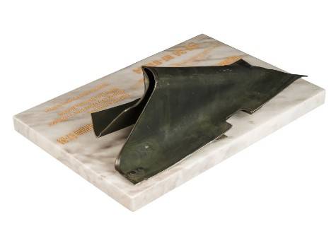 Ця експозиція є частиною турбіни збитого надзвукового бомбардувальника СУ 34, збиття якого сталося біля села Глібовка Черкаської області на початку березня 2022 року. На гранітній підставці розташована сама деталь, зображено корпус літака, вказано місце збиття, дату та координати, а також бортовий номер. Надзвуковий винищувач-бомбардувальник СУ 34 призначений для завдання ударів авіаційними засобами ураження по цілях на видаленні 150-600км. росія активно застосовує авіацію під час повномасштабного вторгнення по всій лінії фронту, обстрілюючи населені пункти та позиції військовослужбовців ЗСУ.