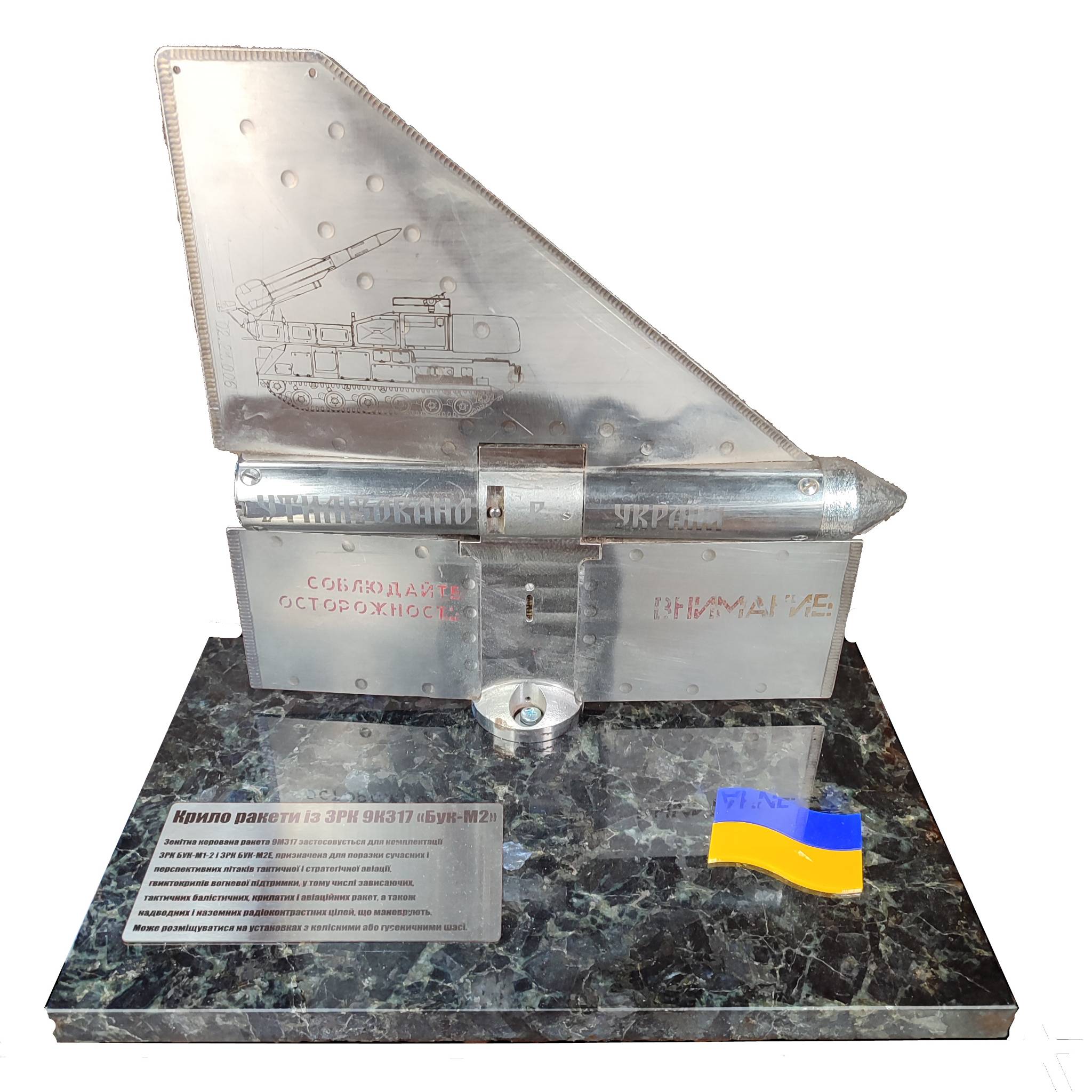 Черговий лот – крило ракети ЗРК Бук. Зенітно-ракетний комплекс (ЗРК) Бук – одна з найвідоміших систем протиповітряної оборони. З моменту свого створення комплекс пройшов безліч модифікацій, підтвердивши свою ефективність у різних умовах бойових дій. Бук використовує кілька типів ракет, кожна з яких має свої характеристики та призначення. Основні ракети, які у цьому комплексі, – 9М38 і 9М317, кожна з яких розроблялася з певними тактичними завданнями. Ракета 9М317, крило від якої закріплене на даній експозиції, є більш сучасною модифікацією, яка була розроблена в 1990-і роки. Вона має покращені характеристики, включаючи дальність дії до 50 км і можливість ураження високошвидкісних цілей. 9М317 також має складніші системи самонаведення, що збільшує шанси на успішне знищення цілі. Ця ракета була розроблена з урахуванням нових загроз, таких як крилаті ракети та безпілотники, що робить ЗРК Бук дуже ефективним та актуальним навіть в умовах сучасної війни, дозволяючи максимально ефективно захищати повітряний простір нашої країни.