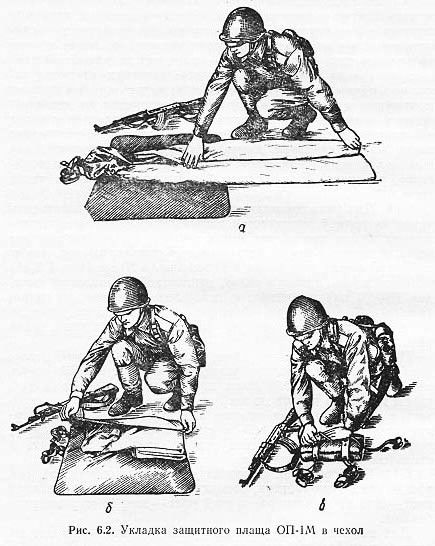 - завернуть боковые стороны чехла, скатать плащ вместе с чехлом и застегнуть хлястики чехла (рис. в).