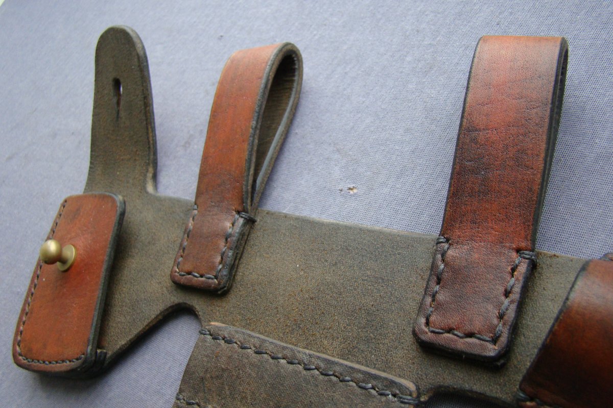 Чехол выполнен из натуральной кожи КРС (чепрак хромового дубления). Толщина кожи 4 мм. Прошит натуральной кручёной и вощёной нитью. Шпенёк латунный, на закрутке. Внешний вид немного застарен. Полностью пригоден для использования по прямому назначению.