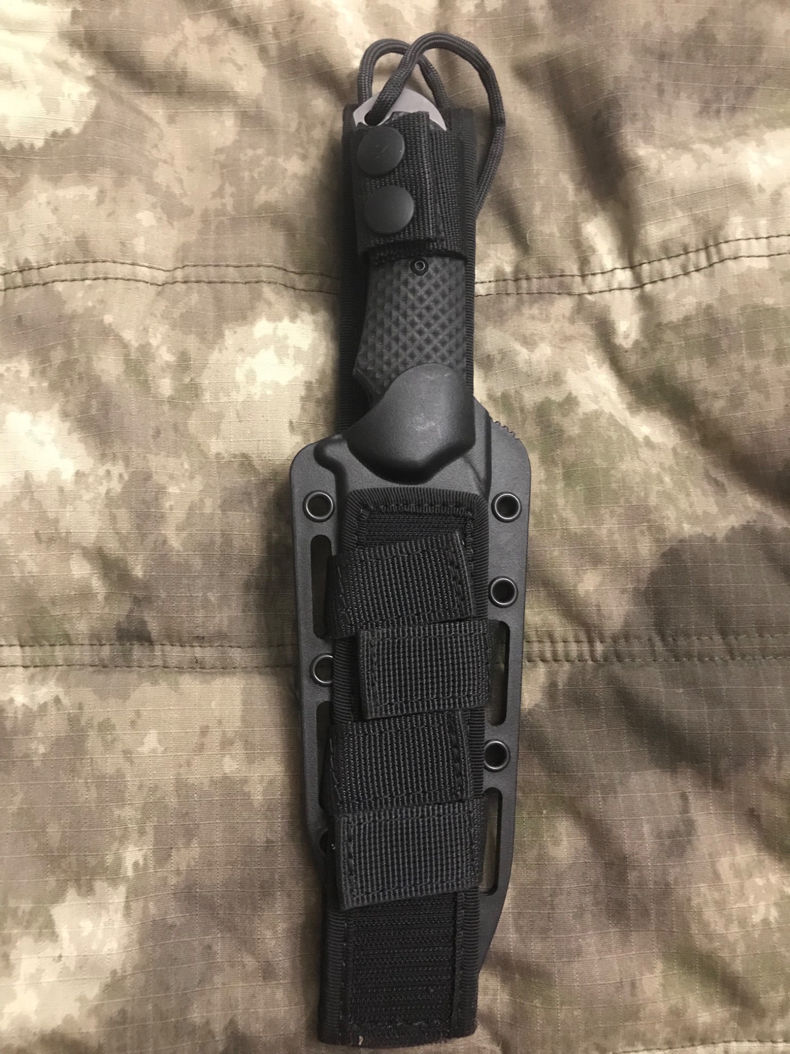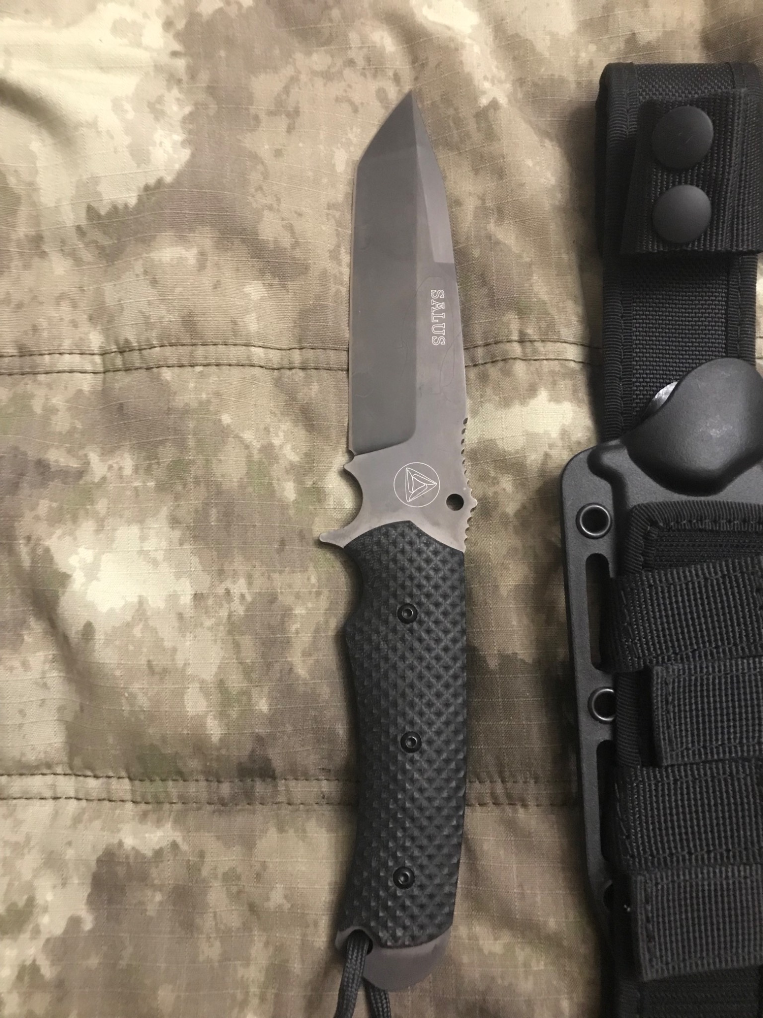 В комплекте вместе с ножом Combative Edge SALUS поставляются ножны и крепление которое позволяет закрепить ножны на ноге или руке. Ножны выполнены из термоформованного пластика kydex и Cordura.