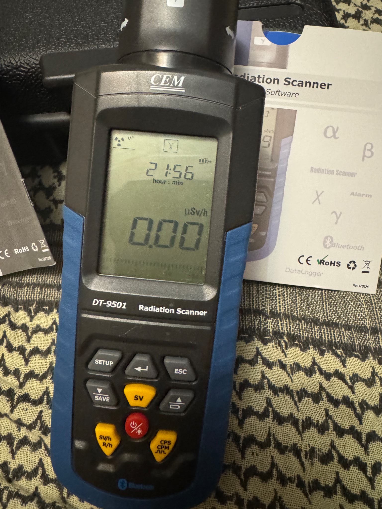 Портативний дозиметр моделі DT-9501 призначений для вимірювання рівня іонізаційного випромінювання, накопиченої дози, виконання моніторингу умов робочих місць та інших об'єктів. Дозиметр DT9501 є високоточним приладом, що вимірює різні типи іонізуючого випромінювання: альфа-, бета- та гама-випромінювання, рентгенівське випромінювання. Висока чутливість дозиметра DT-9501 забезпечується газорозрядним детектором. Функціонально дозиметр дозволяє працювати в декількох режимах: режимі вимірювання рівня іонізуючого випромінювання, режимі накопиченої дози, режимах лічильника імпульсів та реєстратора виміряних значень.Великий дисплей забезпечує відмінну читаність результатів вимірювань та режимів роботи. Користувач може встановити рівні тривоги, при порушенні яких дозиметр сповістить сигналом тривоги, звуковою та візуальною індикацією. Дозиметр DT-9501 здатний працювати в режимі реєстратора (пам'ять на 4000 вимірів). Результати можуть бути надіслані через бездротовий інтерфейс Bluetooth. Гейгера)• Інтерфейс: Bluetooth• Вбудована пам'ять на 4000 вимірів• Великий дисплей, що добре читається• Мале енергоспоживання.ТЕХНІЧНІ ХАРАКТЕРИСТИКИ• лічильник Гейгера, галогенонаповнена• Діапазон вимірювання (повний автомат): від 0,001 мкЗв/рік до 1000 мкЗв/рік• Акумульована доза: від 0,001 мкЗв до 9999 мкЗв• Час усереднення: від 2 до 12 с.• Чут МеВ- бета: від 0,2 МеВ- Гама: від 0,02 МеВ- рентгенівське: від 0,02 МеВ• Рівні тривоги: настроювані• Похибка виміру: 10%• Функція реєстратора: дата, година, результат вимірювання• Інтерфейс: Bluetooth • Об'єм пам'яті: 4000 вимірювань, режим запису: авто/ручний.