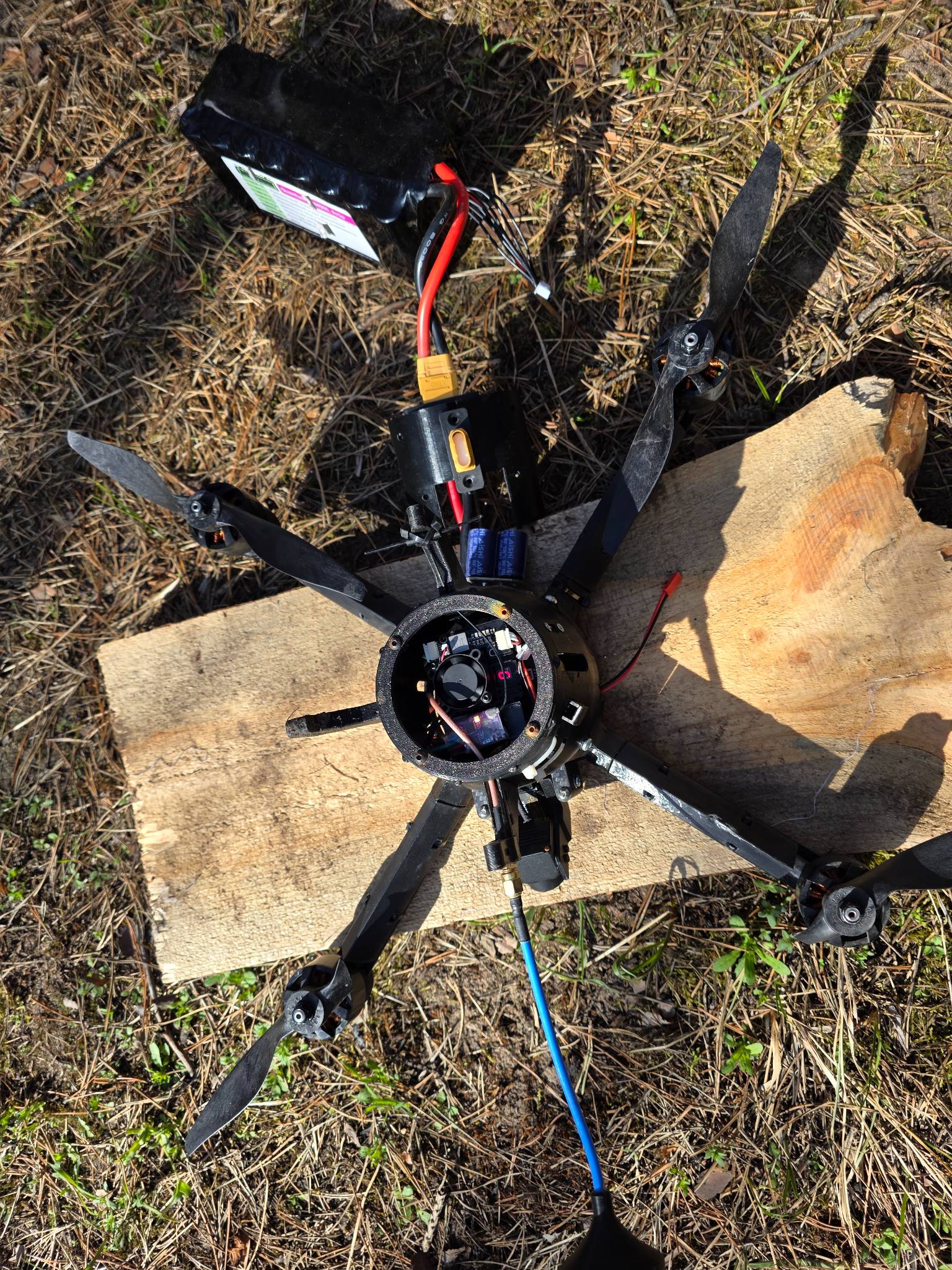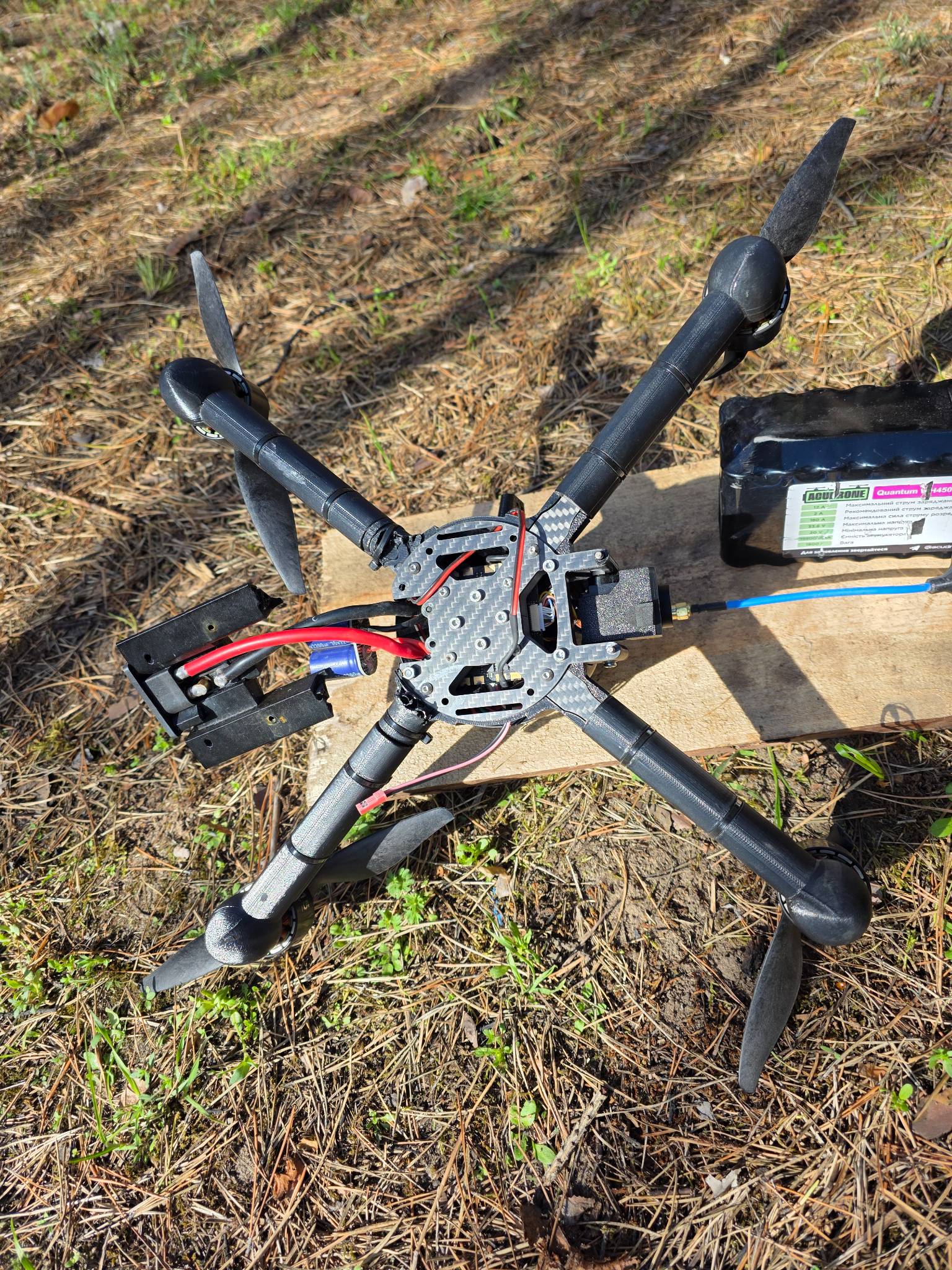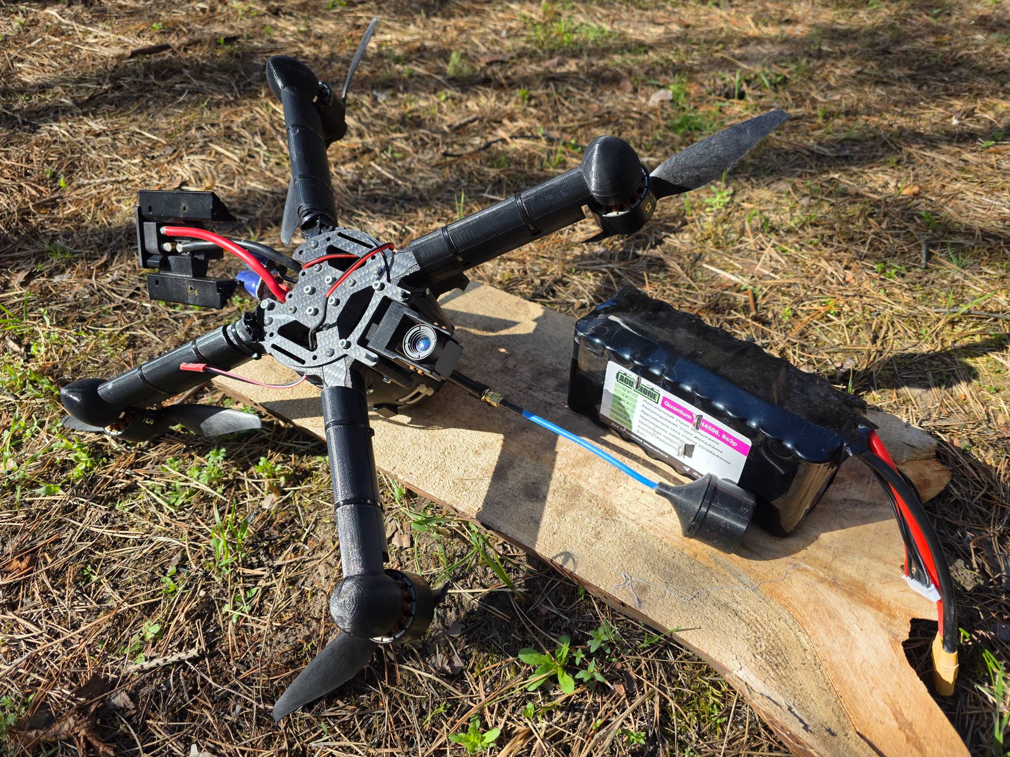 Дрон перехоплювач з тепловізійною камерою, повністю робочий але без елементів корпусу, рама ціла. Через бетафлай все бачить, калібрує, мотори жучать. Батерея робоча повністю, збалансована. Чуть допрацювати корпіс і можна леліти.