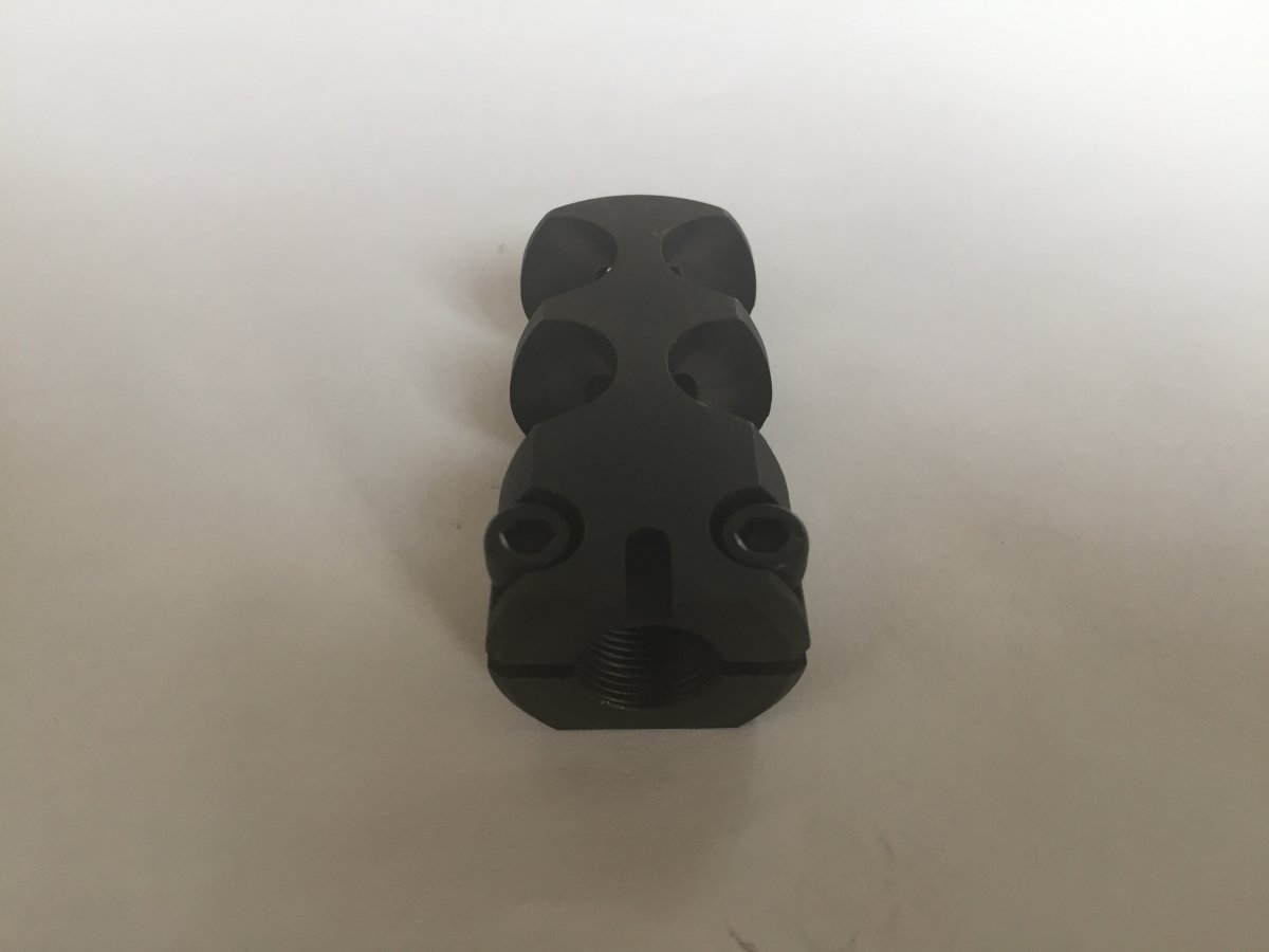 Реактивного типа. На тестах получил очень хорошие отзывы. Потенциально позволяет не только полностью компенсировать силу отдачи, но и полностью убрать звук в стороны.