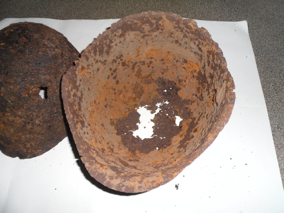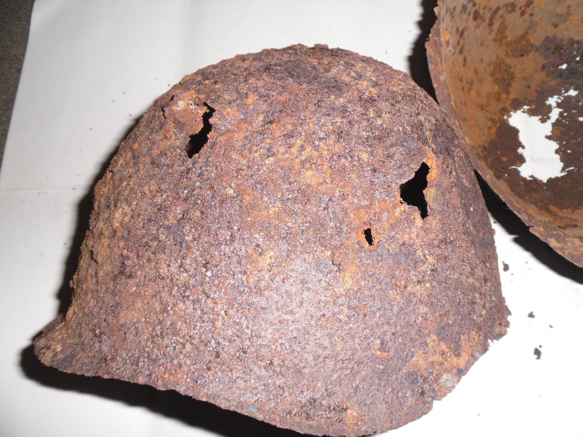 Две советские антуражные СШ-40. Потери от ржавчины. Копанные. У одной осколочное отверстие в височной области.