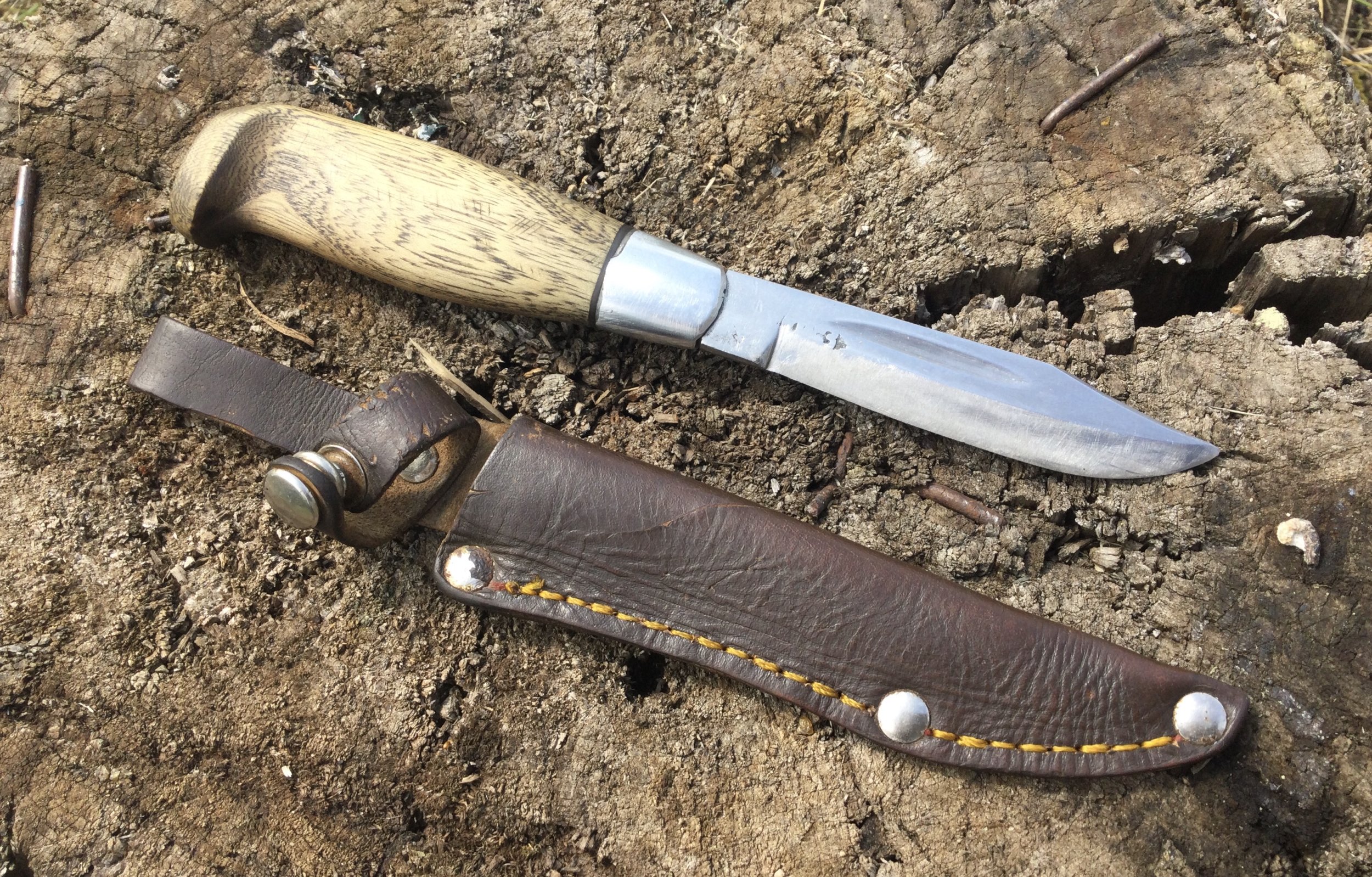 Клинок когда то был советским гаечным ключом. Клинок ромбовидный с долами, длинна 9см, толщина 5мм у пяты. Больстер алюминиевый, ручка из клена ничем кроме масла не пропитывал. Монтаж рукояти всадной, (к сожалению на классический вариант сквозной с расклёпом не хватило длинны заготовки) общая длинна ножа 19см. Ножны кожаные от какого то древнего ножа.