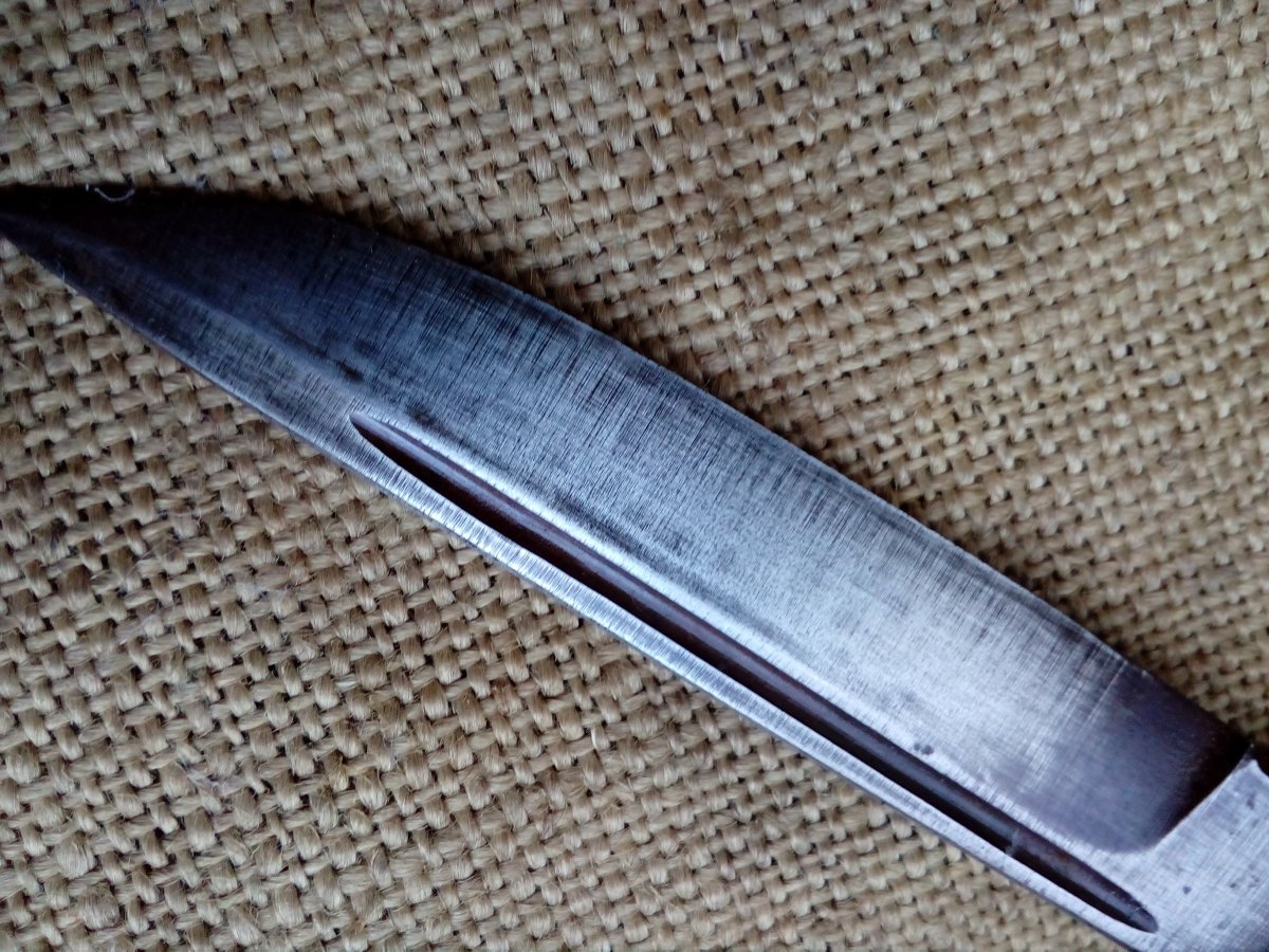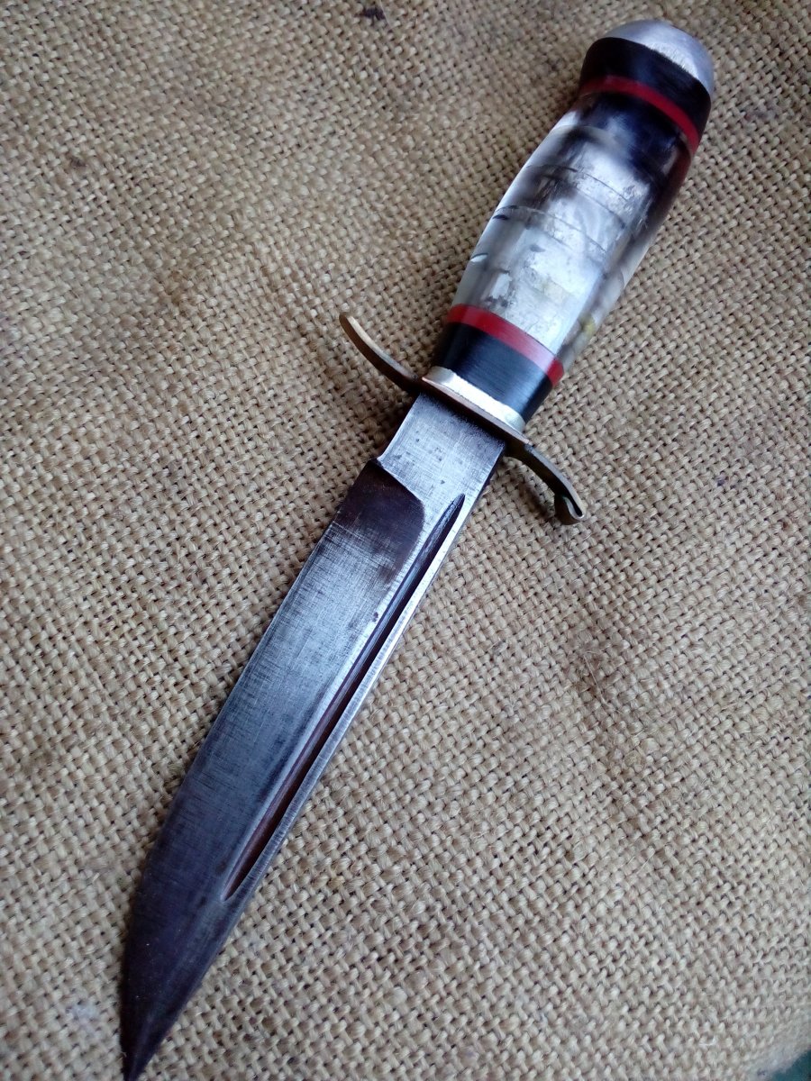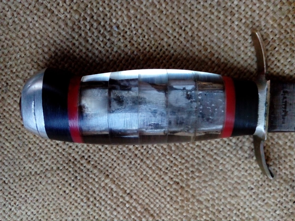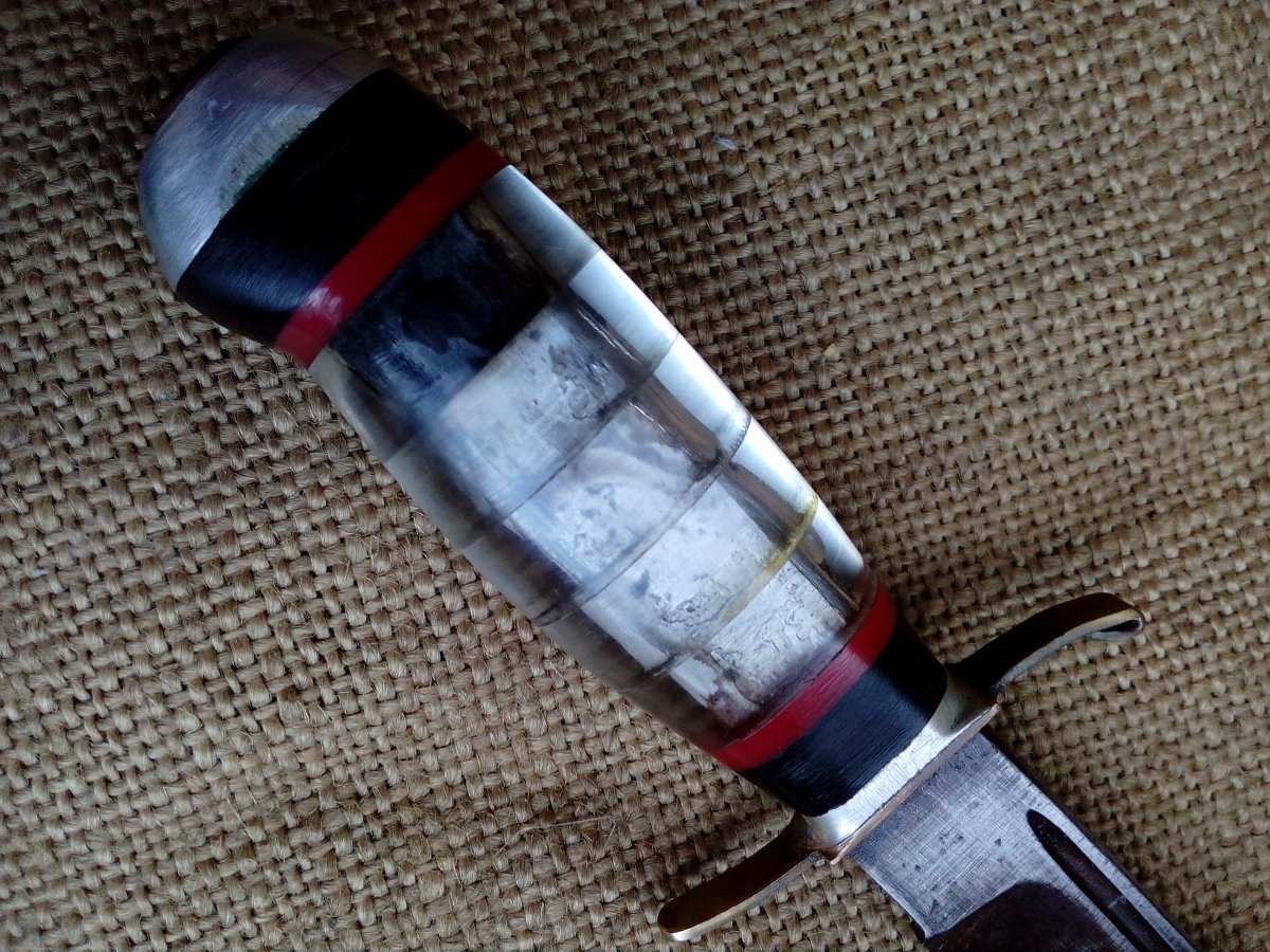 Финка с наборной ручкой. Клинок отлично держит заточку, очень крепкий. Длина 125 мм. Толщина у гарды 4,5 сведена к острию клином. Ножен нет.