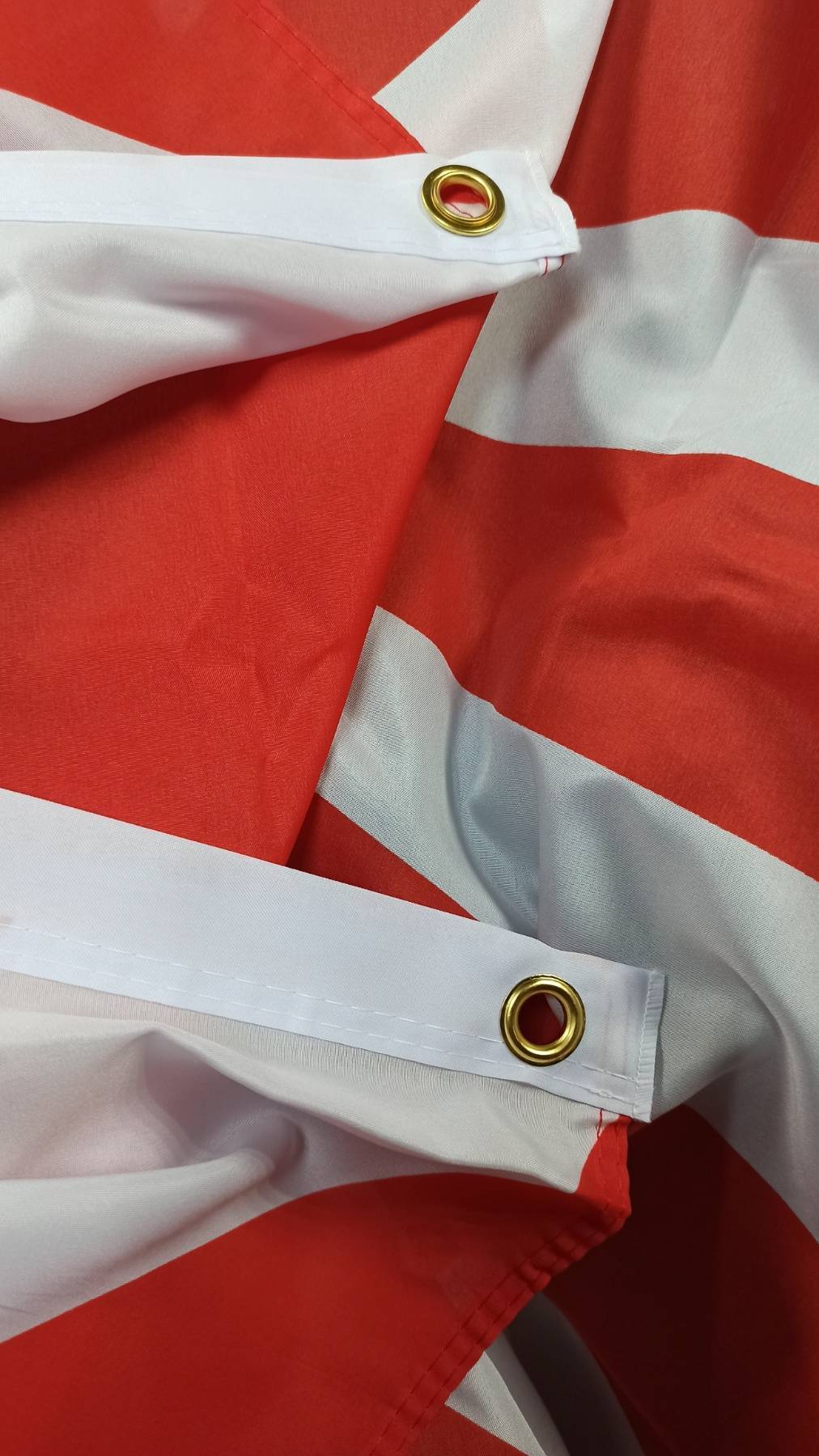 Флаг с очень хорошим качеством, изготовлен из ветрозащитной и атмосферостойкой полиэфирной ткани, цветостойкий, края обработаны двойным швом, с двумя латунными накладками для подвешивания, обеспечивают надёжность и безопасность
