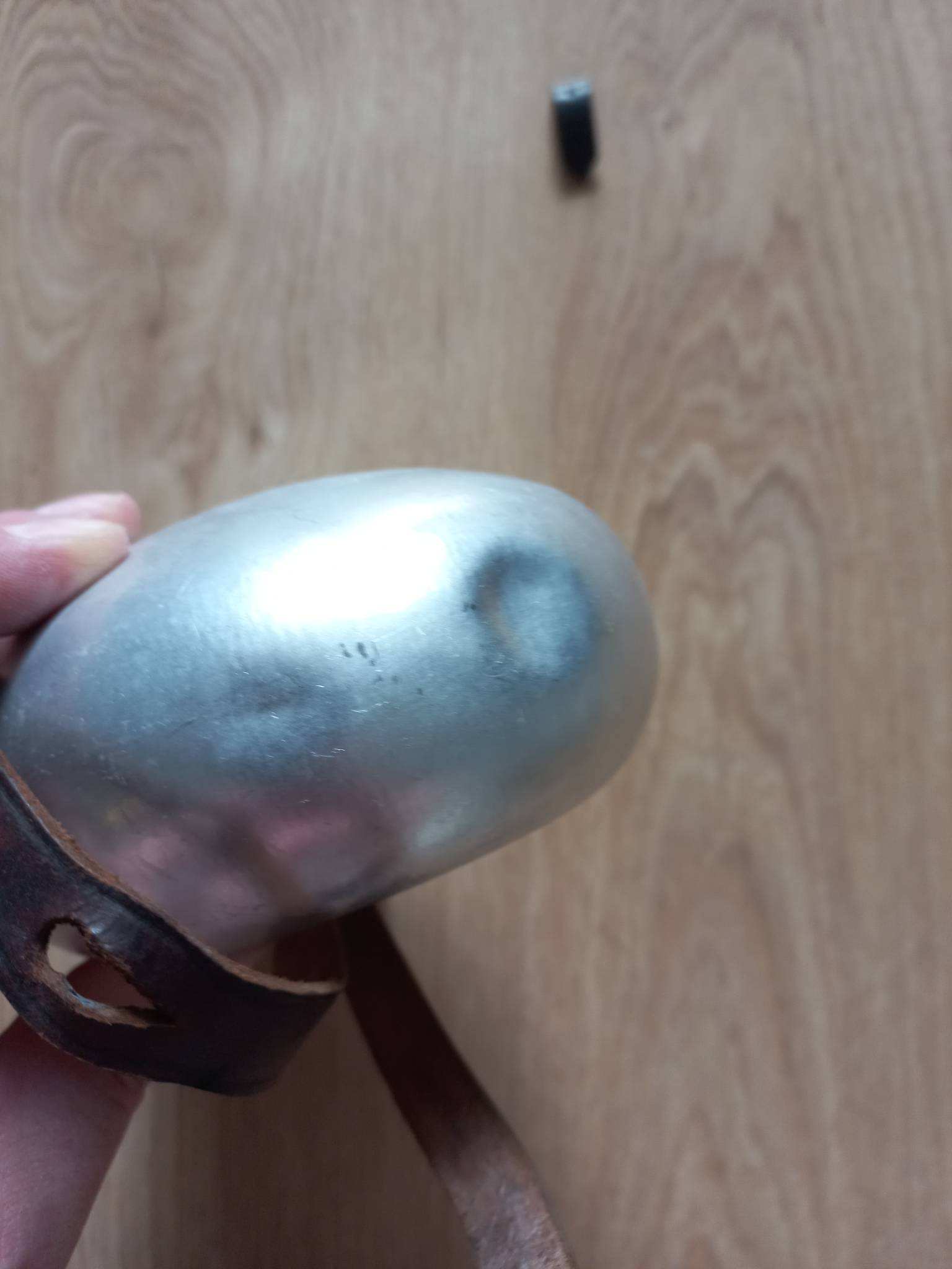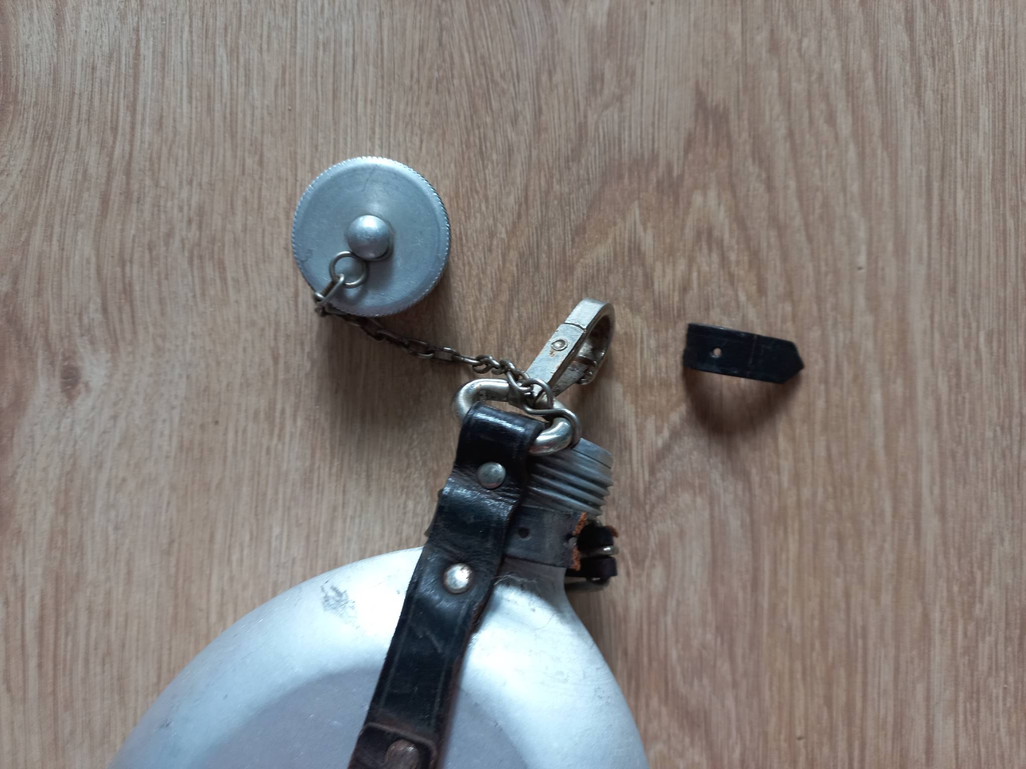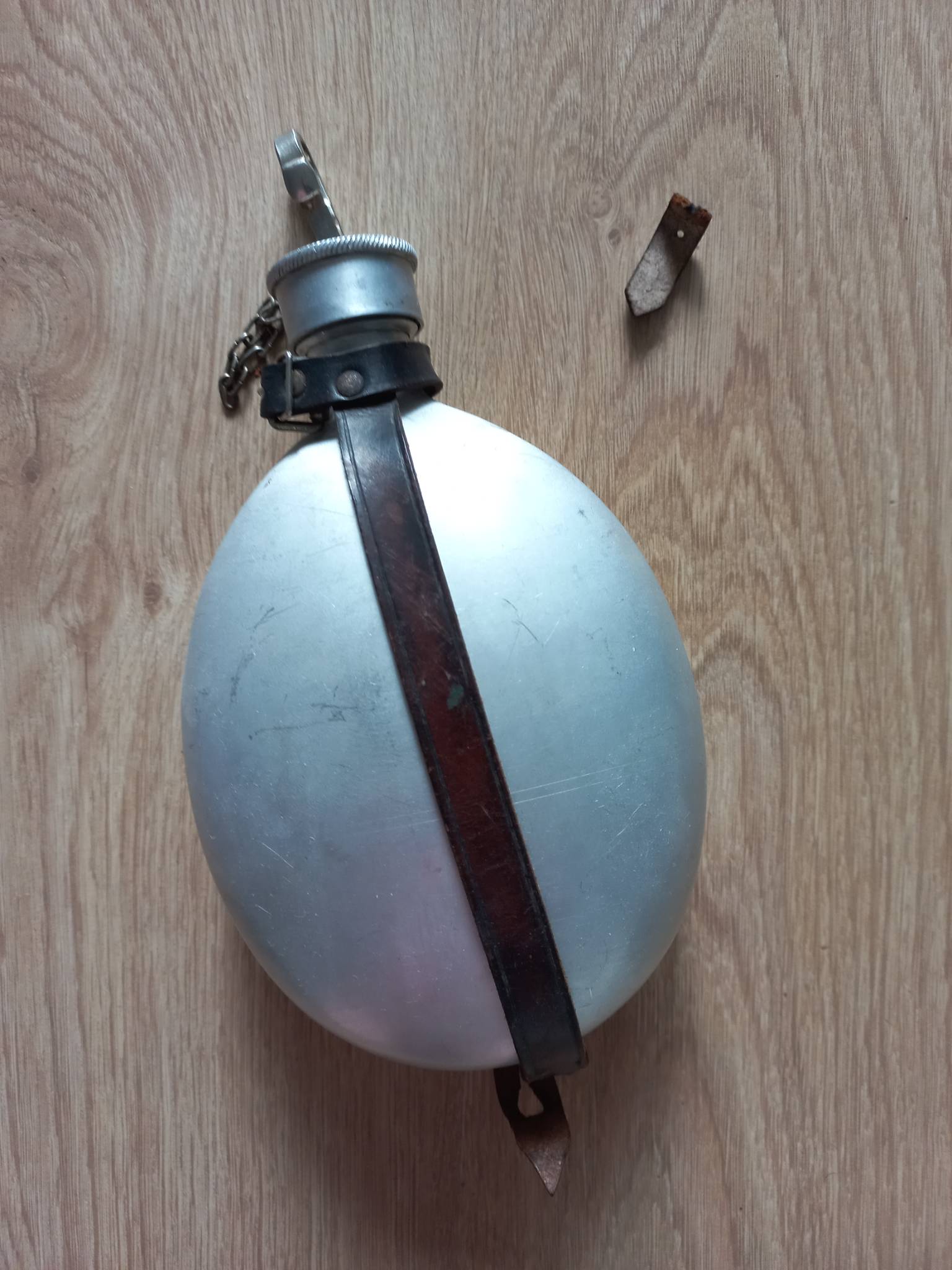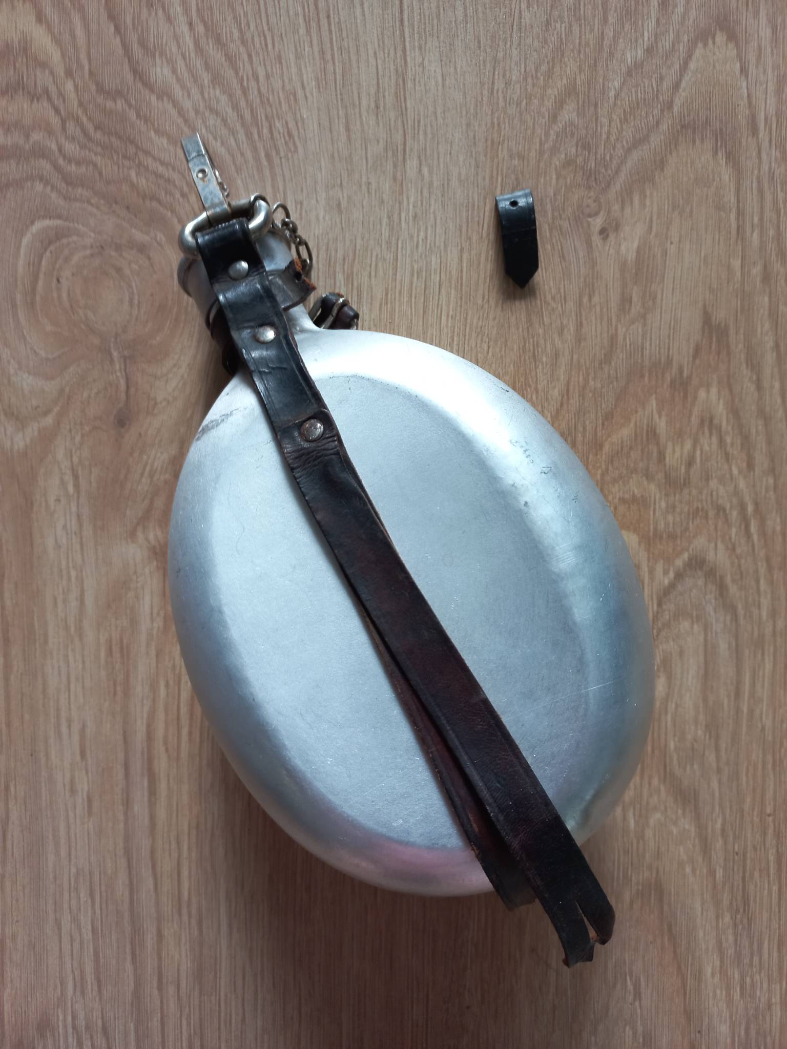 Скоріше за все, післявоєнна фляга. Колба в дуже хорошому стані, лише одна вм'ятинка. Шкіра пересохла. Клейм нема.