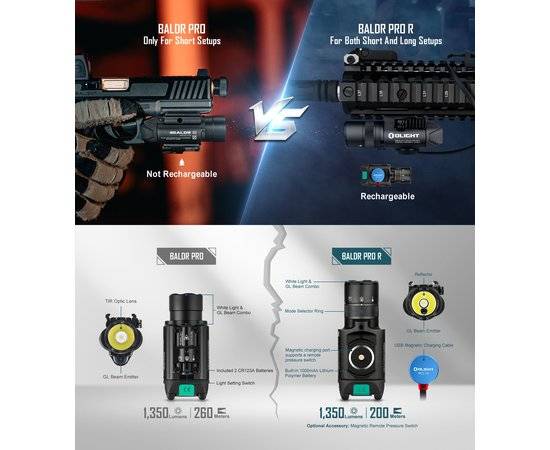 Ліхтар Olight Baldr Pro R є удосконаленою версією популярної підствольної моделі Baldr Pro. Основною відмінністю є можливість заряджання, без знімання акумулятора.