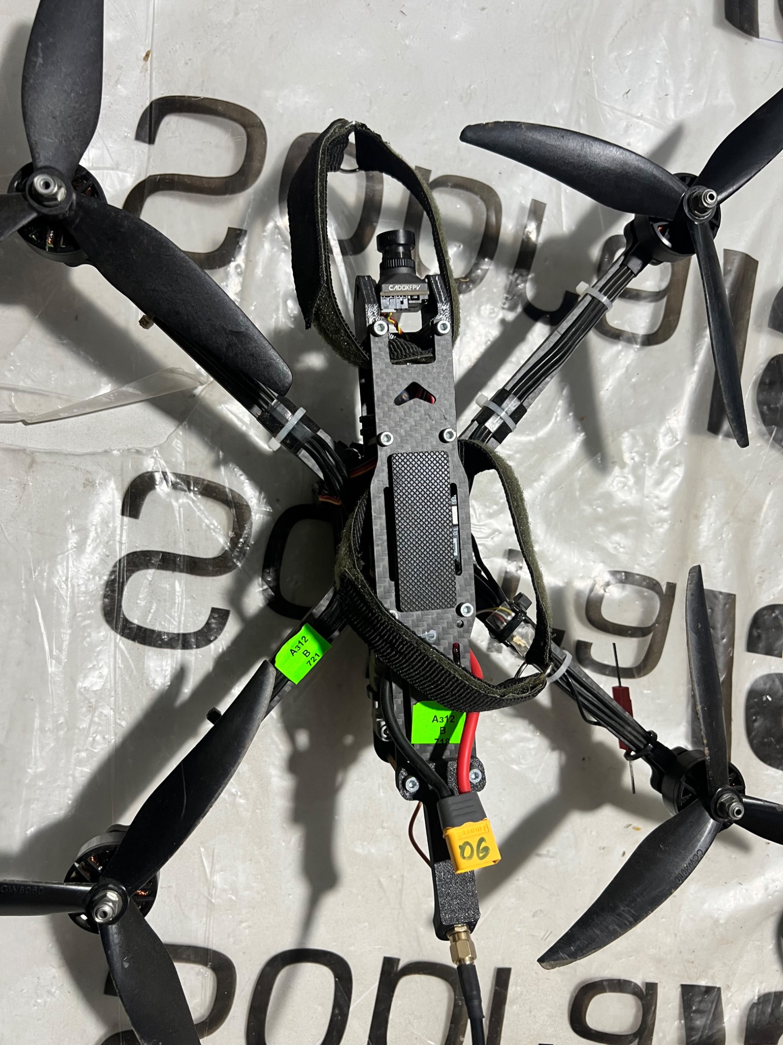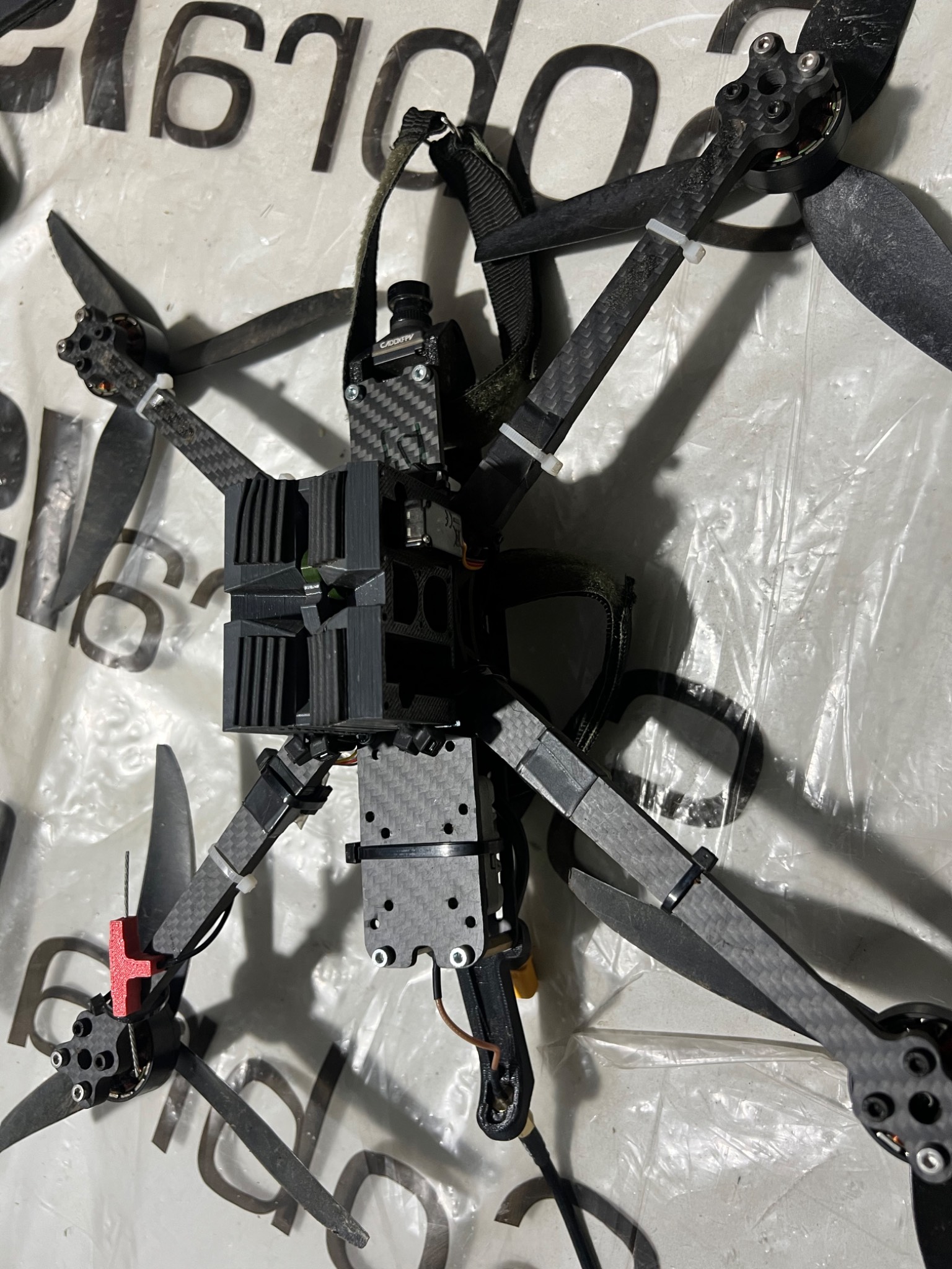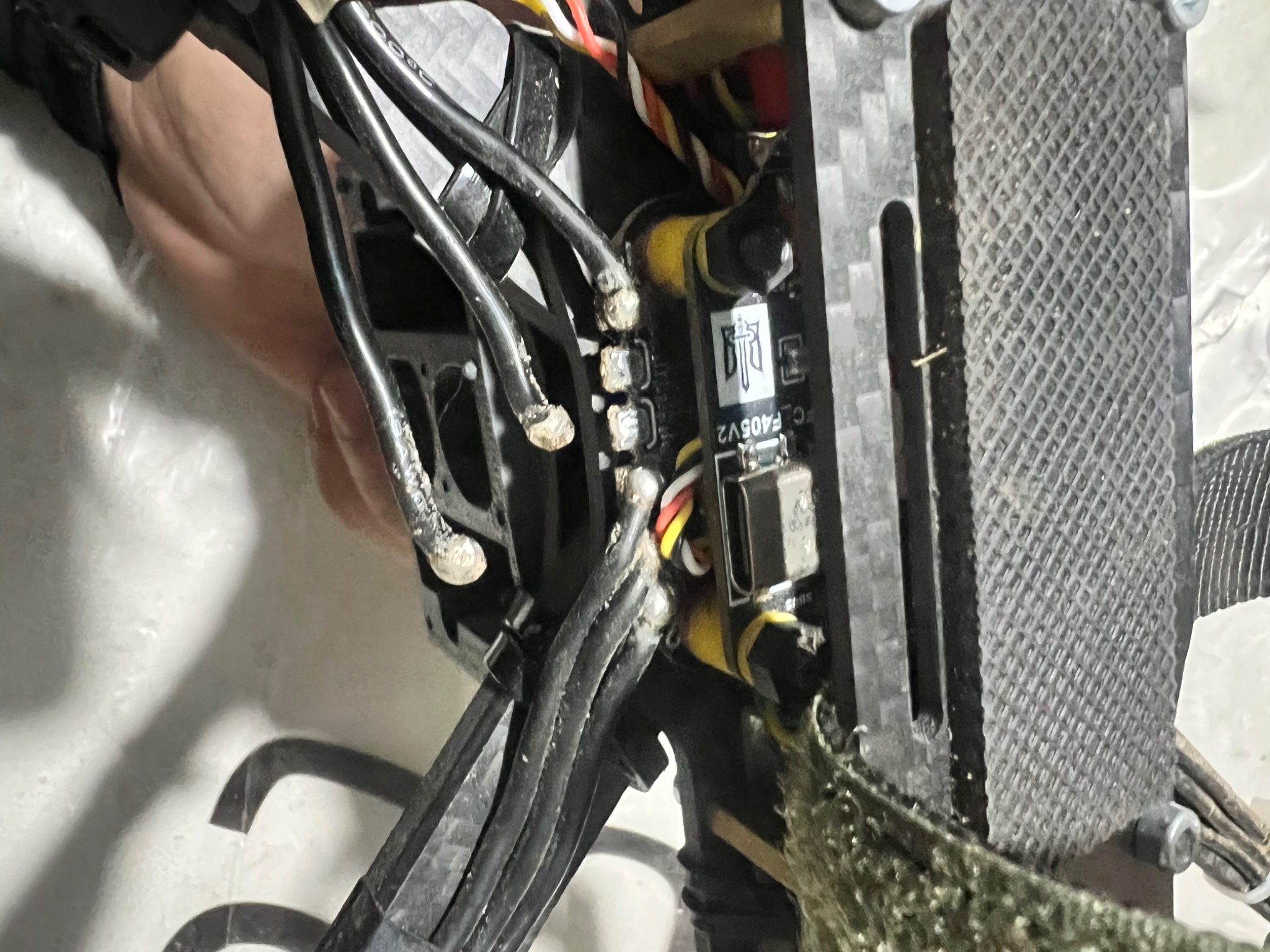 Фпв дрон з системою скиду. На підключення батареї реагує, світяться діоди й видає звукові сигнали. Двигуни не заклинені й вільно обертаються.