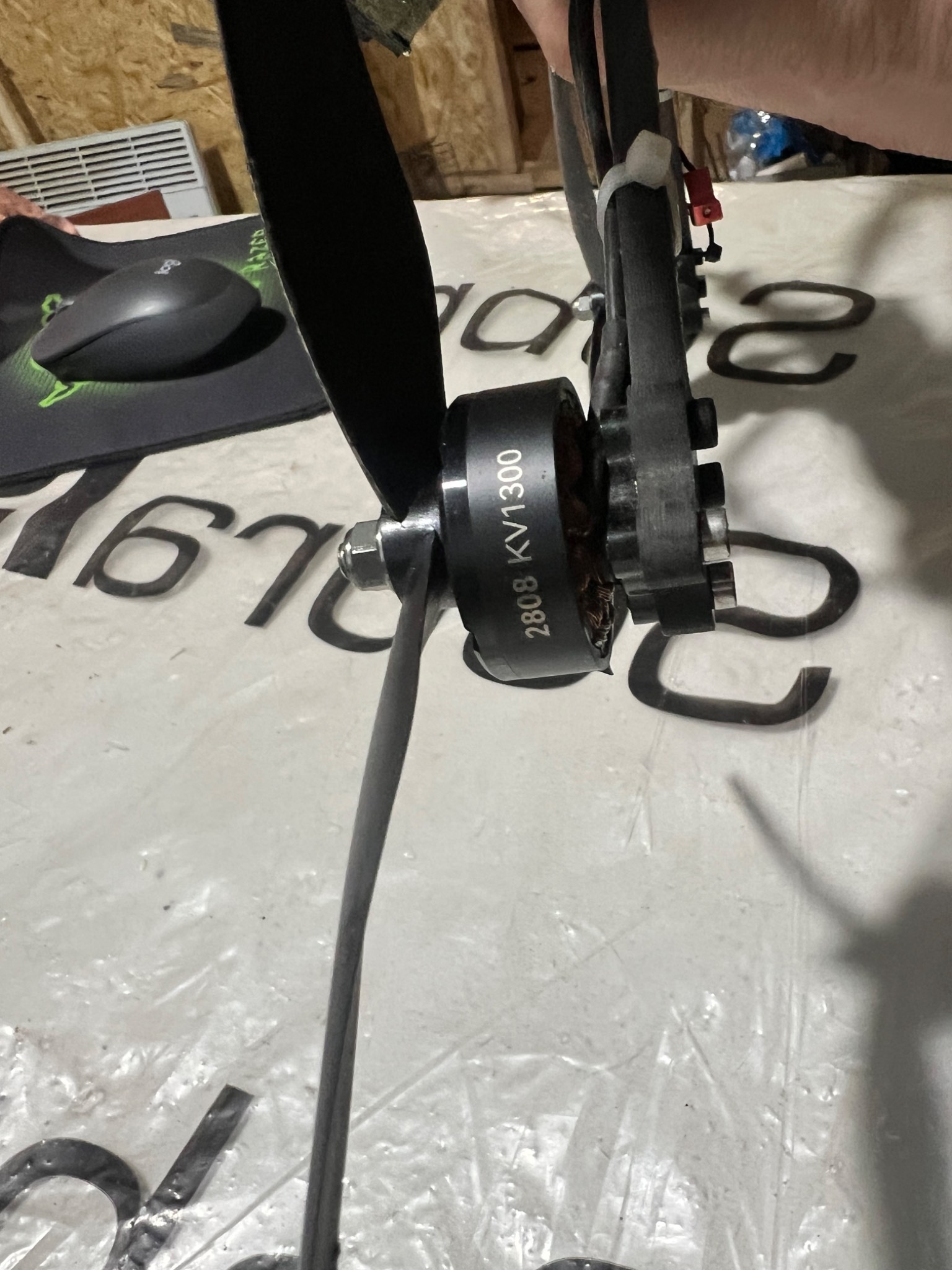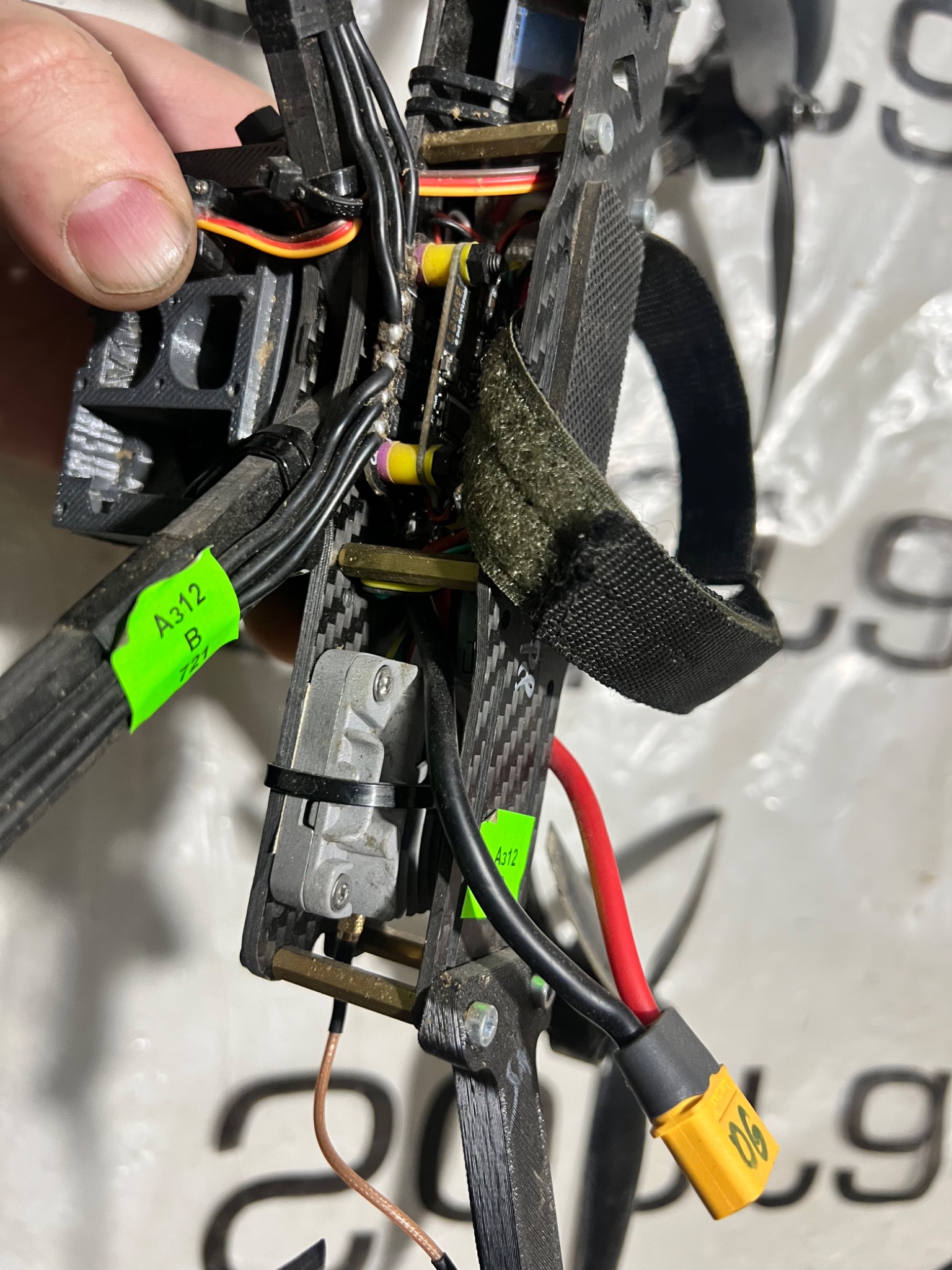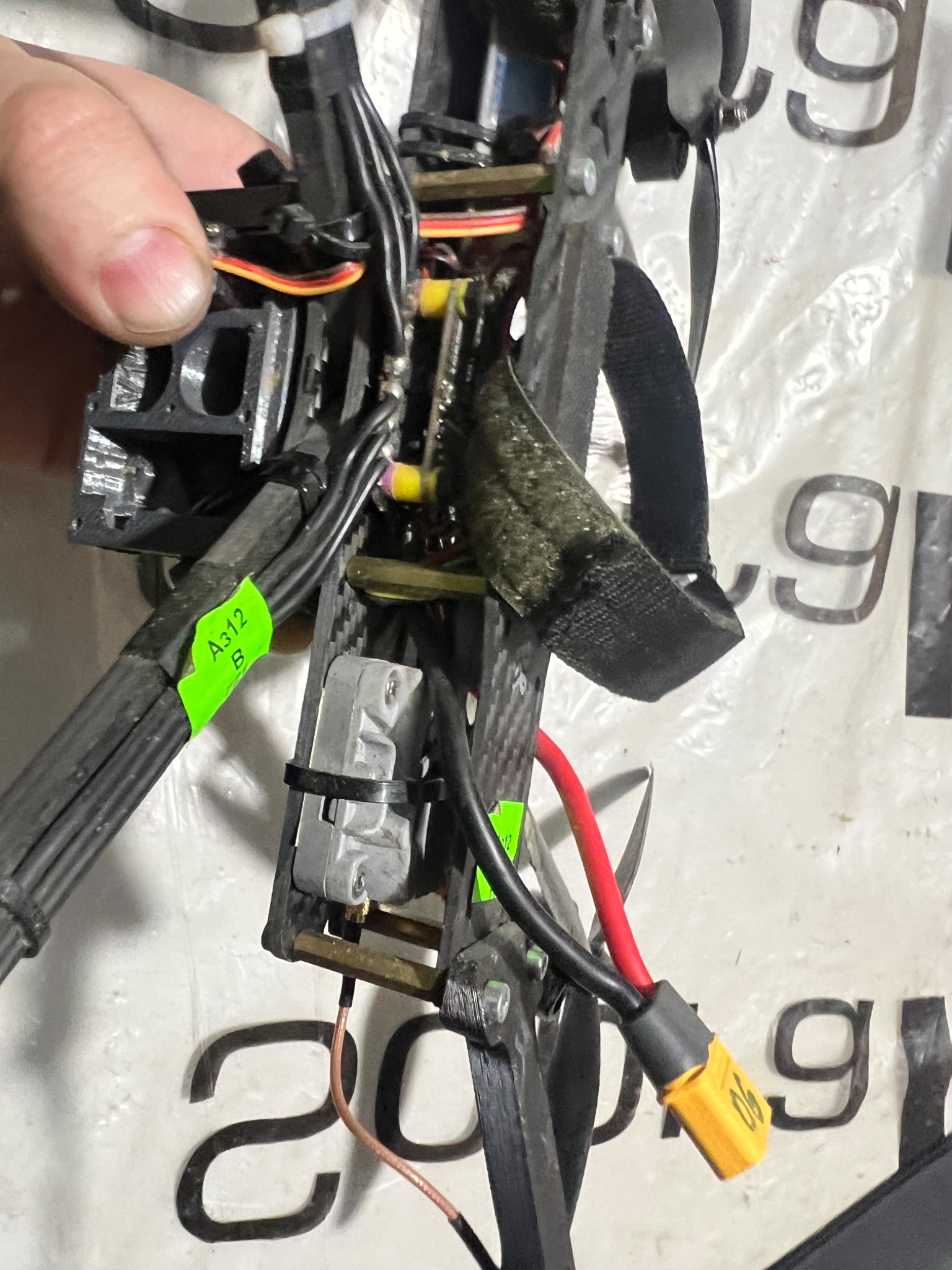 Фпв дрон з системою скиду. На підключення батареї реагує, світяться діоди й видає звукові сигнали. Двигуни не заклинені й вільно обертаються.