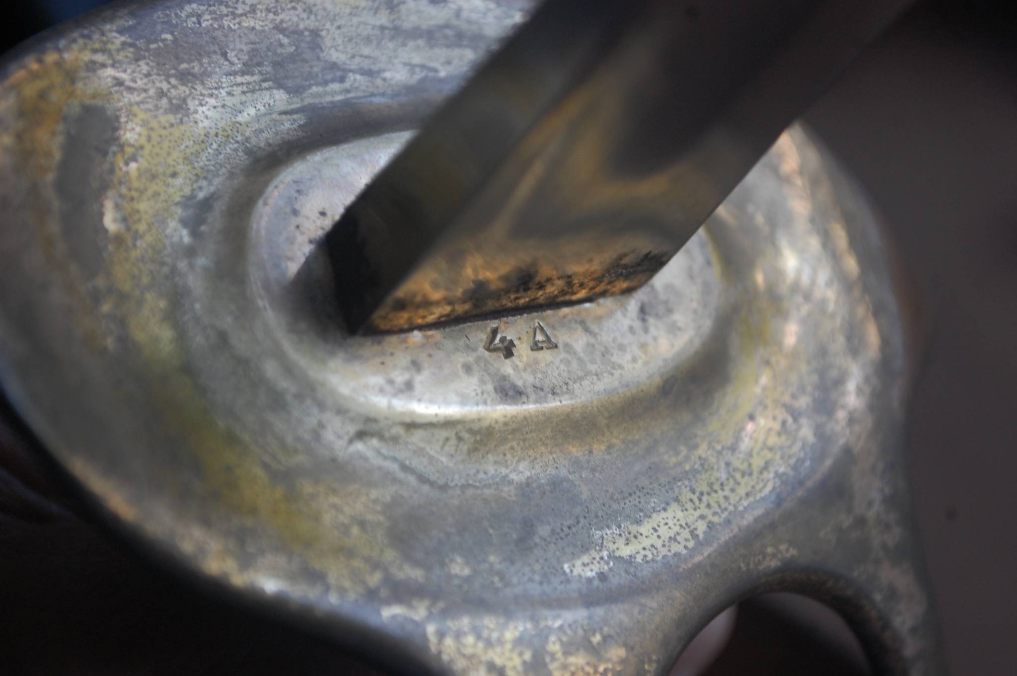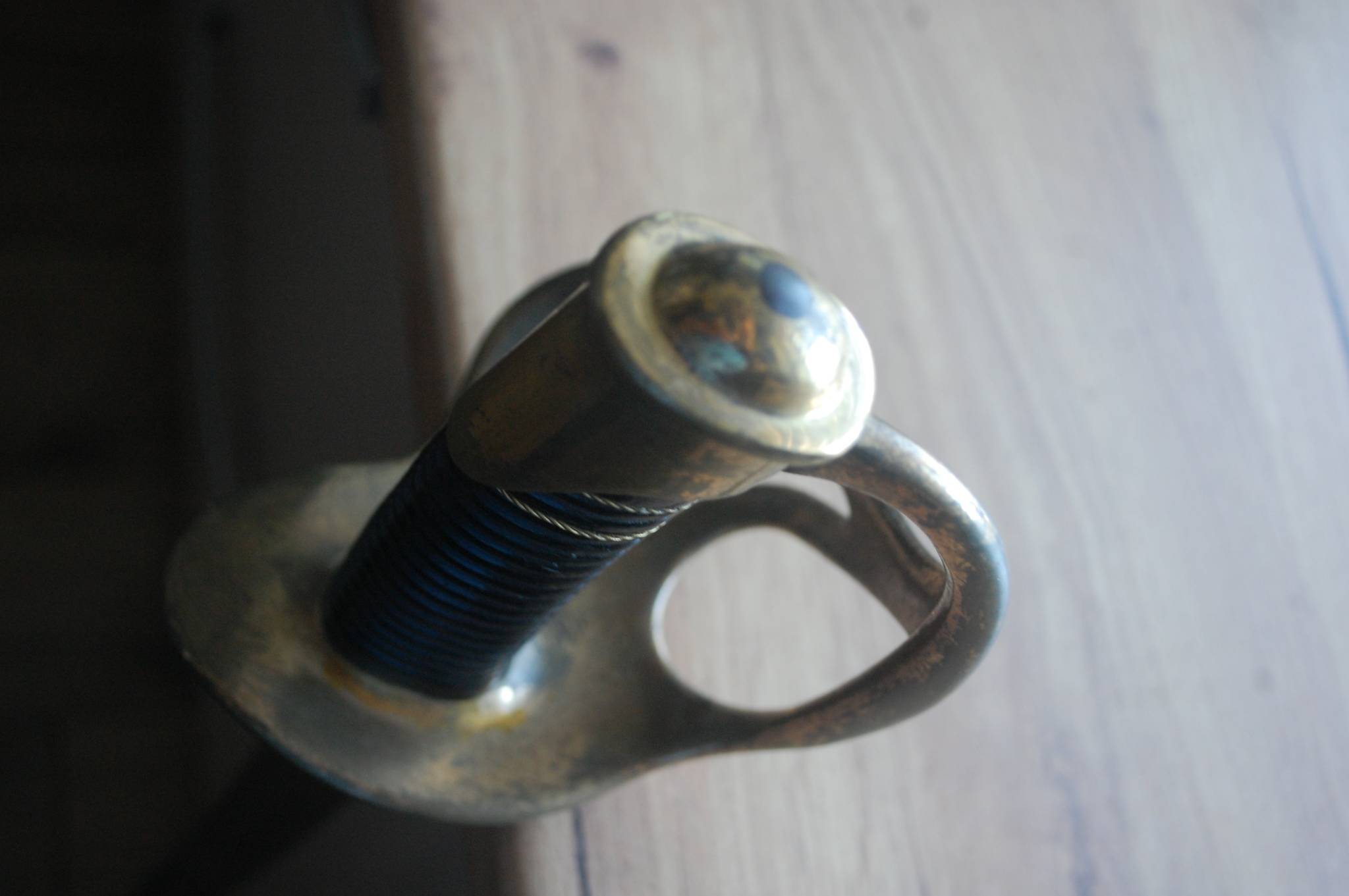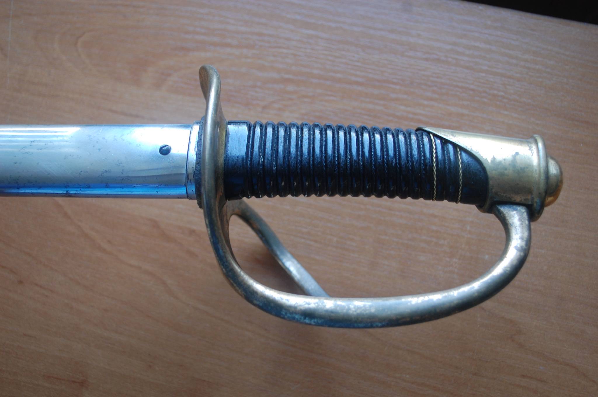Відсутня частина дроту на руківї і трохи потертий хром на піхвах (в місці за кільцем, де тримали рукою при носінні)