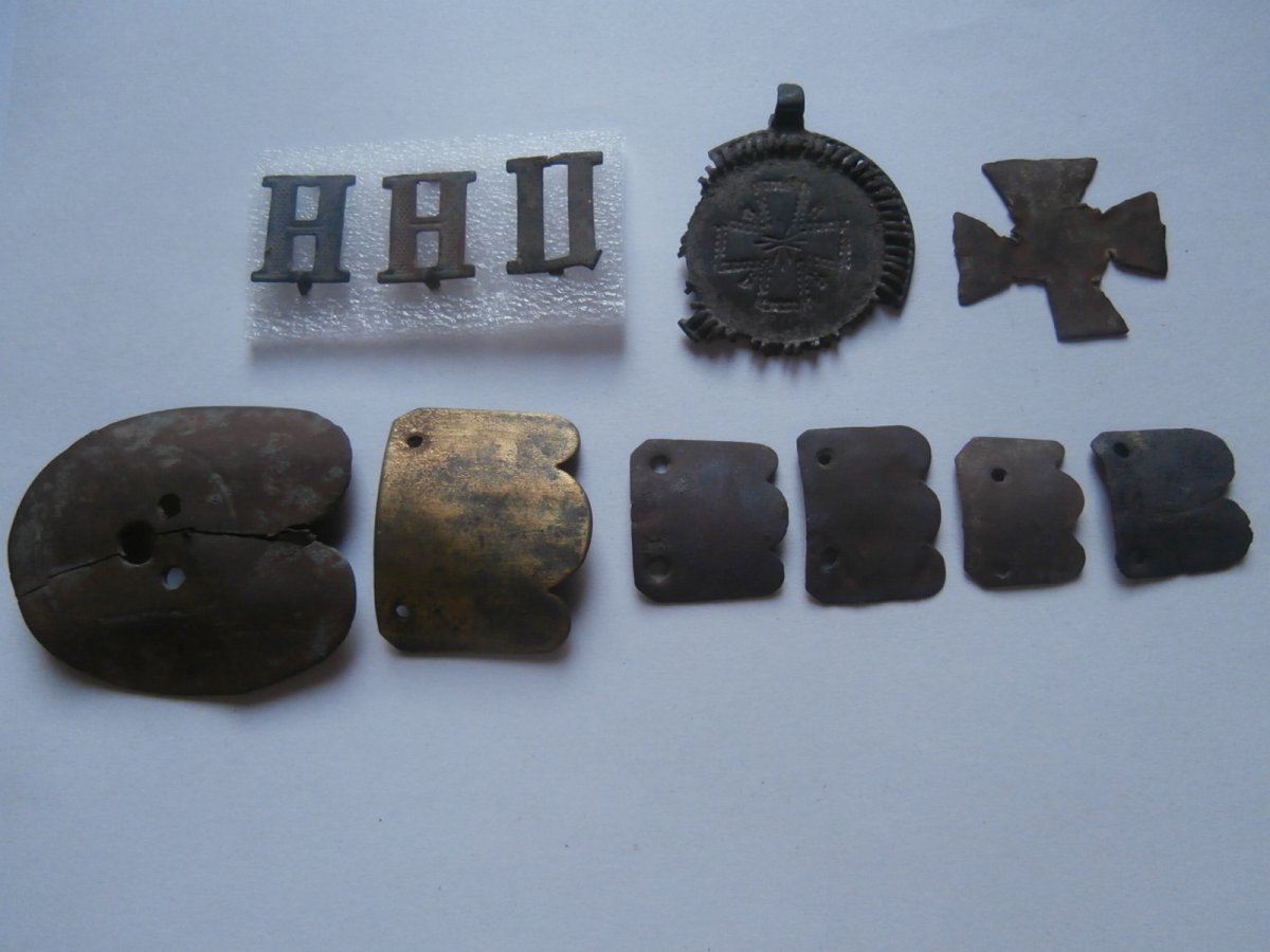 Коп . 3 буквы с погон российского императорского солдата , детали подбородочного ремешка , дукач и крест наградной ( окопное творчество )