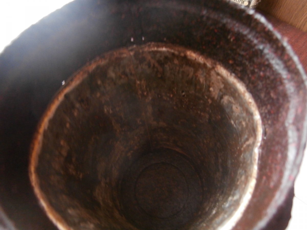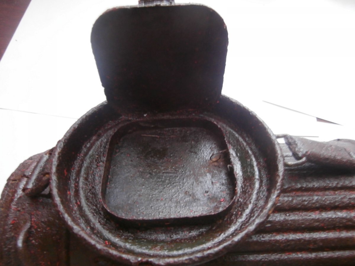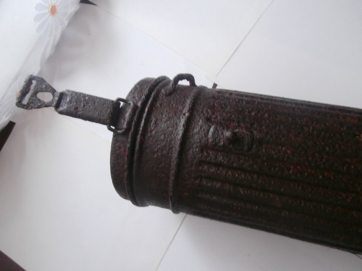 Высота = 280 мм . Домашнее хранение на воздухе . Металл крепкий - не сыпется . Не чищен - слегка протерт маслом . Есть не много маленьких отверстий в корпусе - до алюминия . Внутри сохранилась алюминиевая вставка . На крепкой уличной защелке - 2 бронзовых кольца . Внутри сохранилось немного родного покрытия .