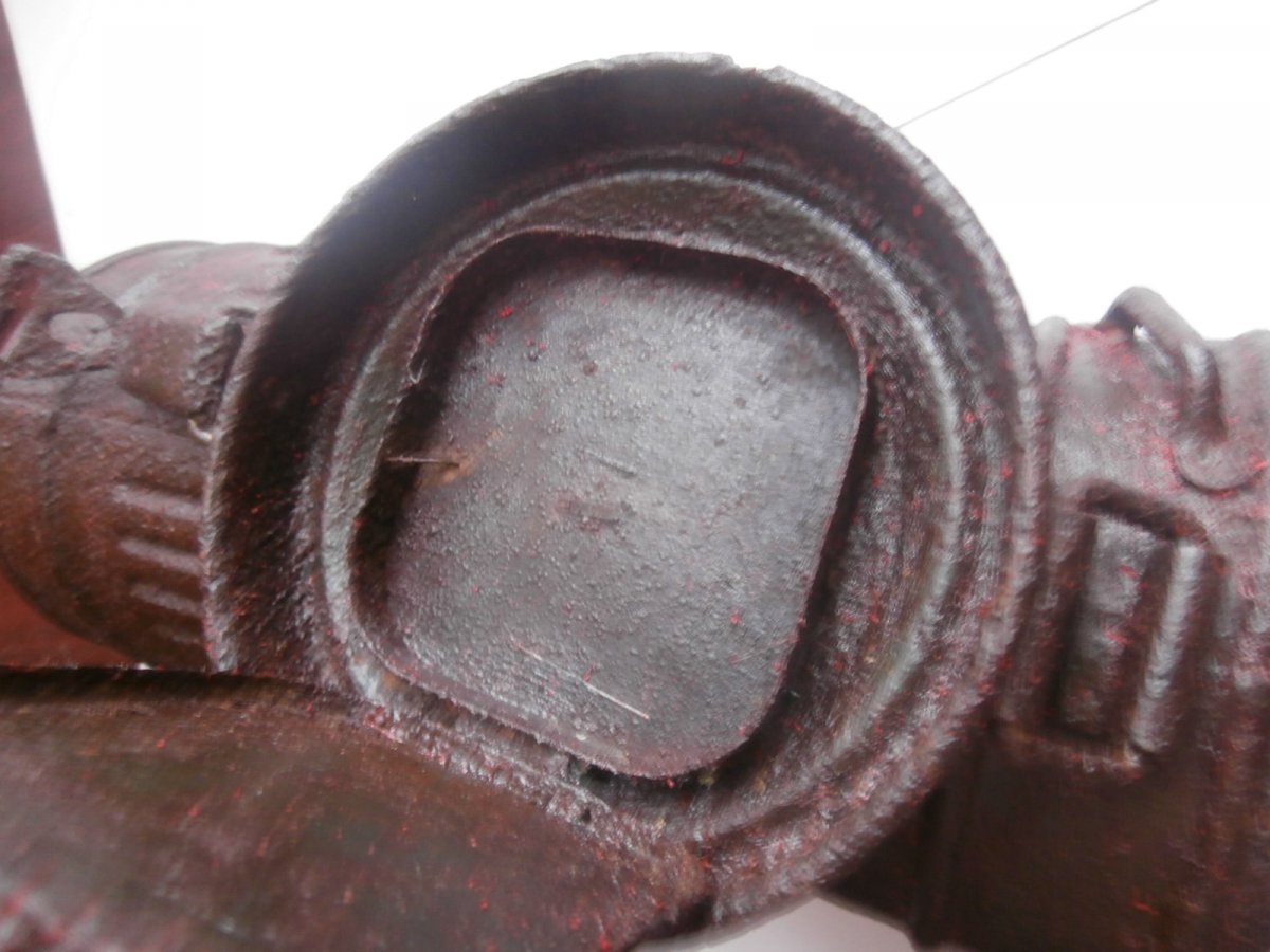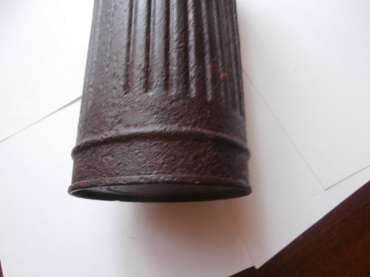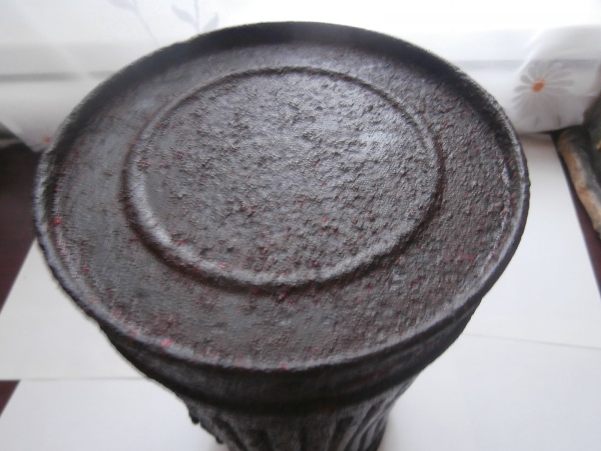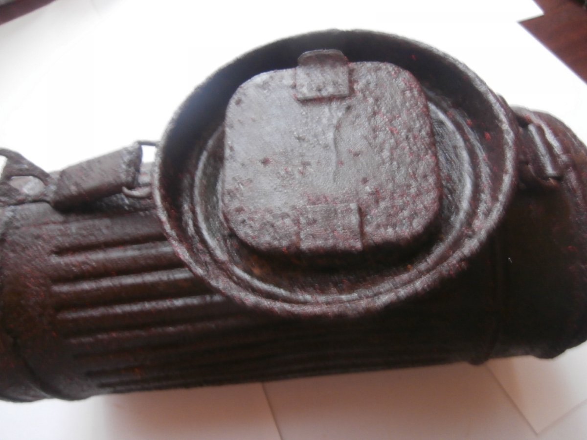 Высота = 280 мм . Домашнее хранение на воздухе . Металл крепкий - не сыпется . Не чищен - слегка протерт маслом . Есть не много маленьких отверстий в корпусе - до алюминия . Внутри сохранилась алюминиевая вставка . На крепкой уличной защелке - 2 бронзовых кольца . Внутри сохранилось немного родного покрытия .