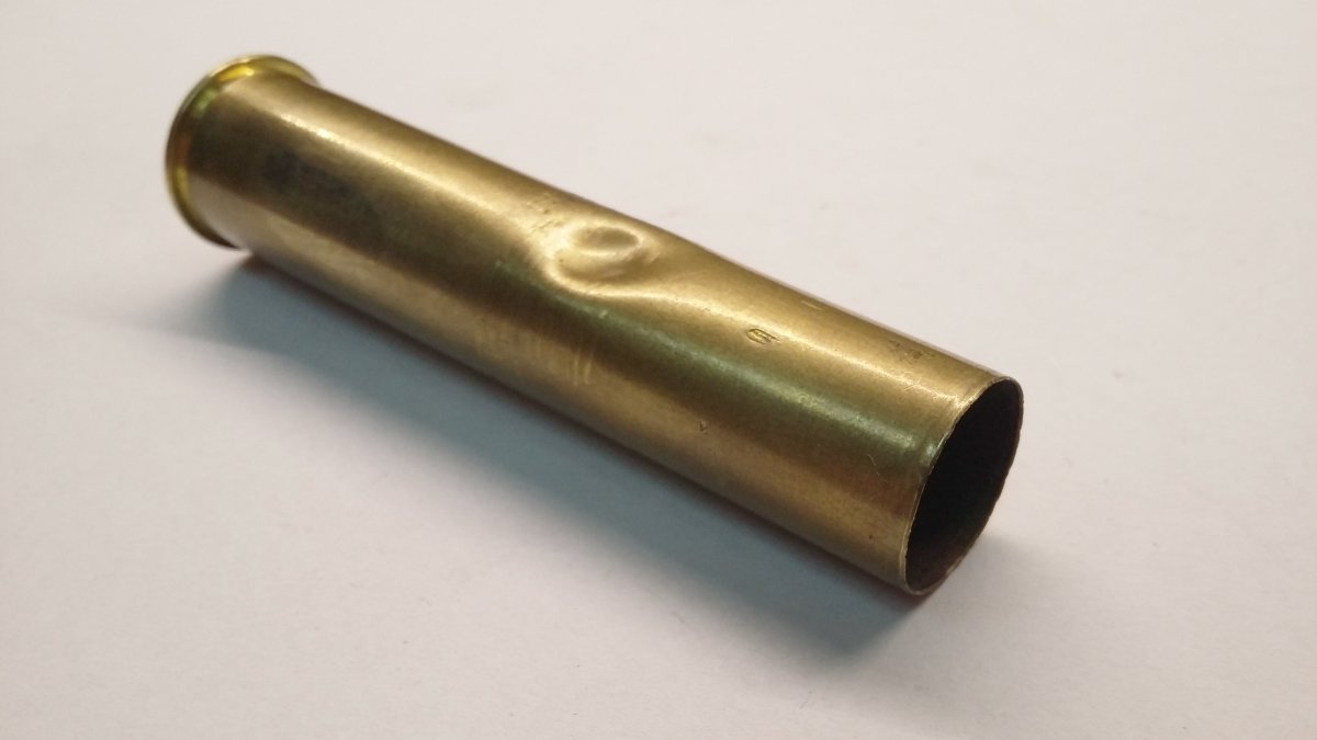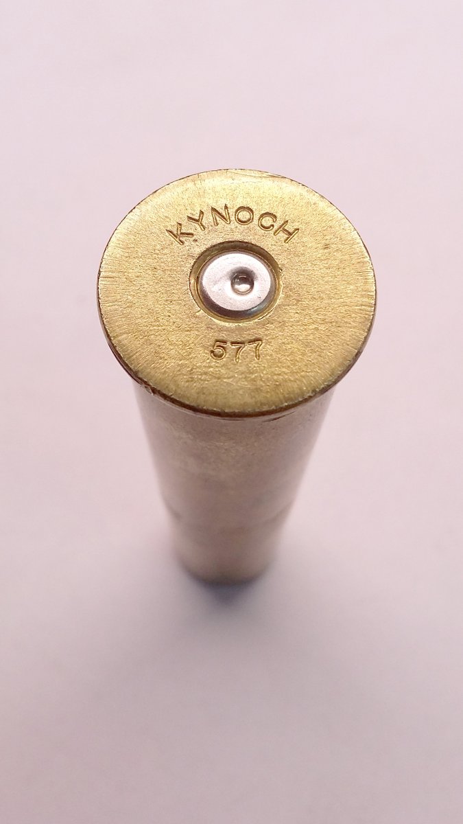 Гильза патрона .577 KYNOCH. Латунь, стреляная, с одной стороны имеется вмятина. На клеймо.