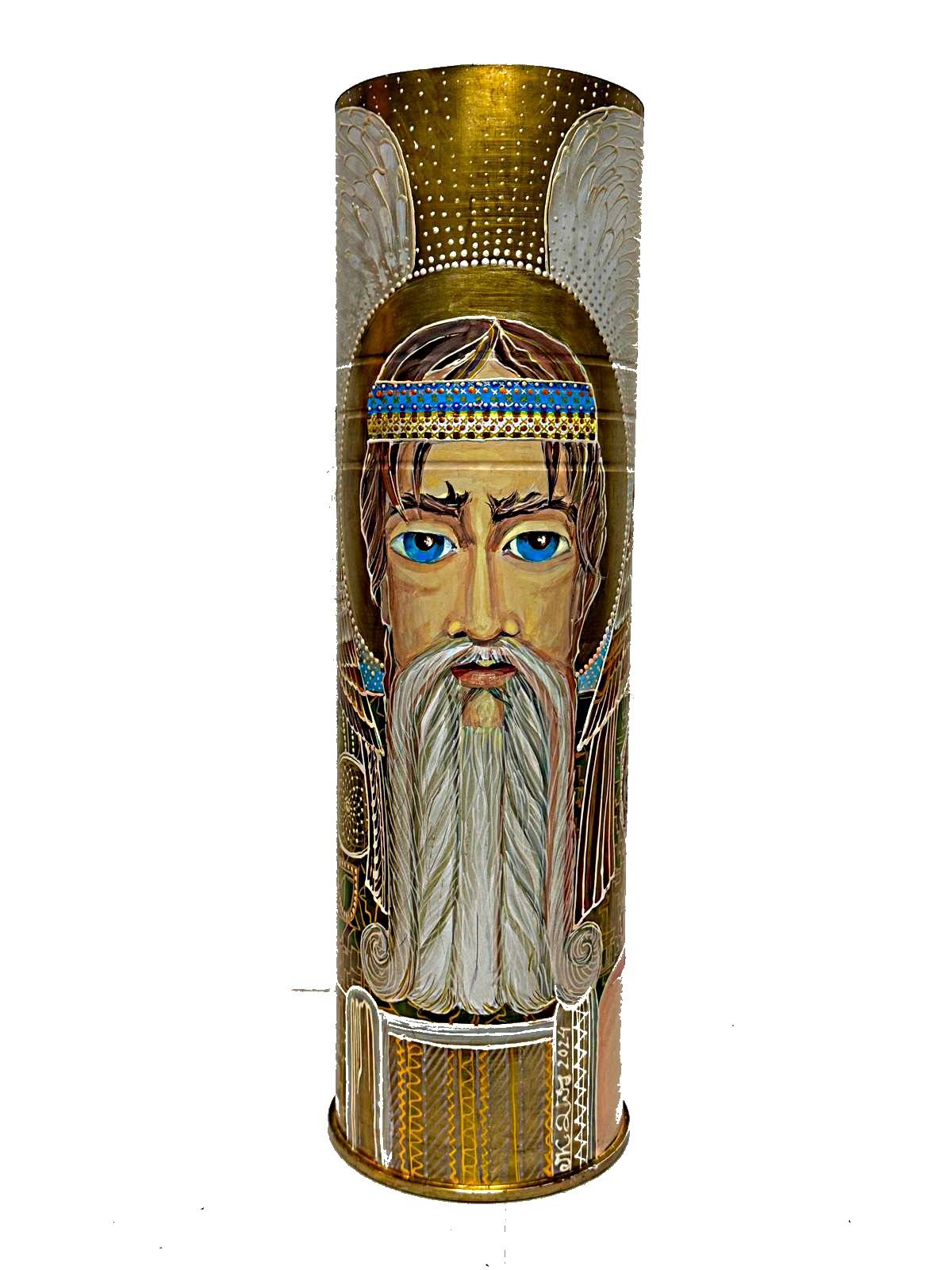 Перед вами – відстріляна гільза калібром 122мм від гаубиці Д-30, що буксується. Гаубиця складається із ствола, противідкатних пристроїв, лафету та прицільних пристроїв. Гаубиця Д-30 призначена для знищення та придушення живої сили та вогневих засобів піхоти супротивника, відкритих та тих, що знаходяться в укриттях польового типу, руйнування ДЗОТів та інших споруд польового типу, боротьби з артилерією, мотомеханізованими засобами та танками супротивника. Дальність прямого пострілу становить 850 м, максимальна дальність - 15300 м. Особлива увага даного експонату - у високоякісному художньому розмалюванні гільзи. На ній зображений Перун - верховний східнослов'янський бог грози, а також бог війни, який приглядає за воїнам і князем, і бог родючості, що насилає дощ на поля. Він символізує міць та силу. Його зображували як чоловіка у похилому віці з великою бородою, одягненого в кольчугу. Перуну були підвладні небесні стихії, наприклад, грім та блискавка, а за його спиною можна було часто побачити бурхливу грозу. Даний лот - єдиний у своєму екземплярі, він унікальний і неповторний. Експозиція займе гідне місце у вашій колекції.