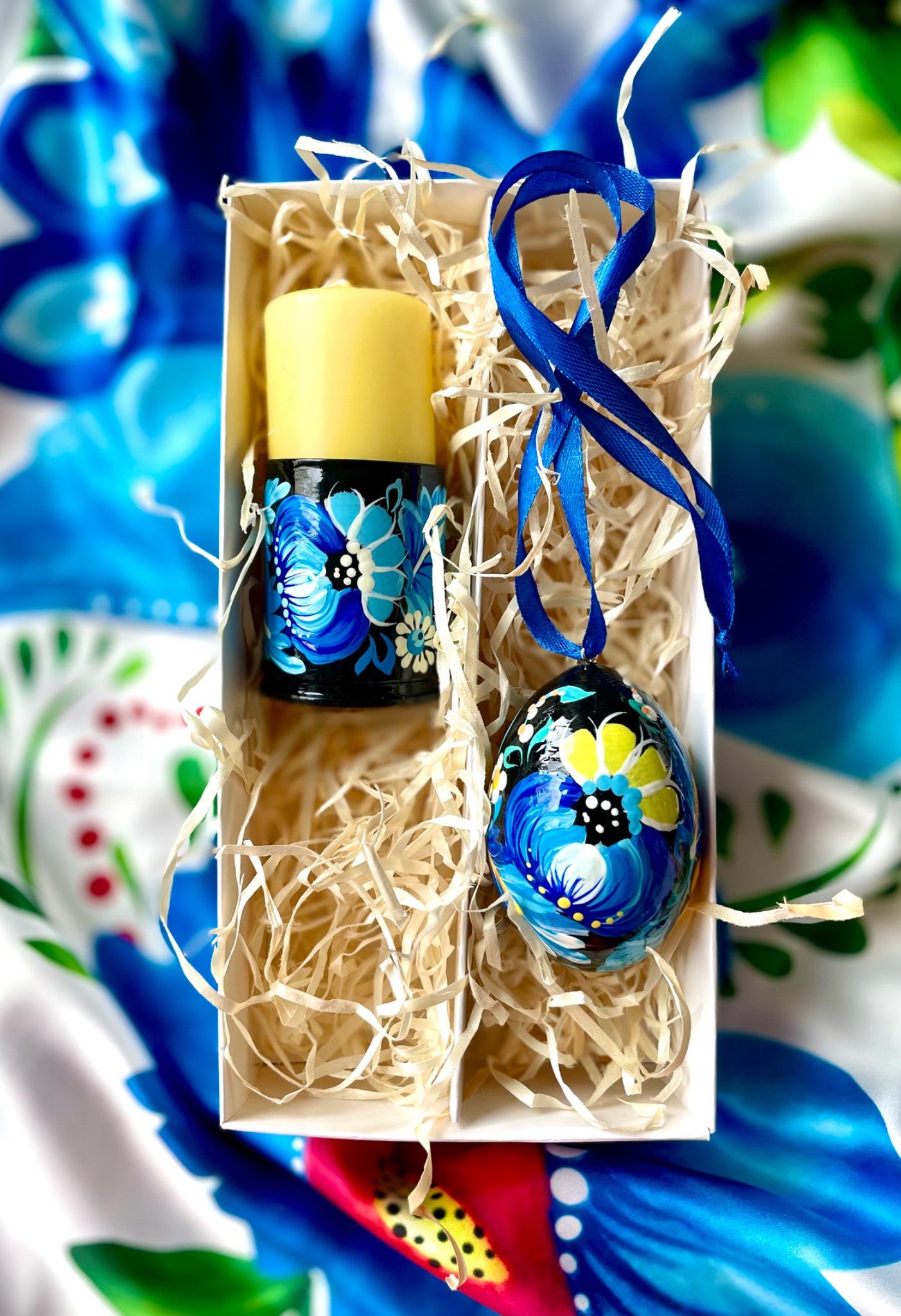 До складу цього яскравого набору, виповненного художницею Петриківским розписом входять гільза 40*53мм від гранати М430А1 HEDP (High Exsplosive Dual Purpose) до автоматичного гранатомету (підсвічник) та деревʼяна крашенка.