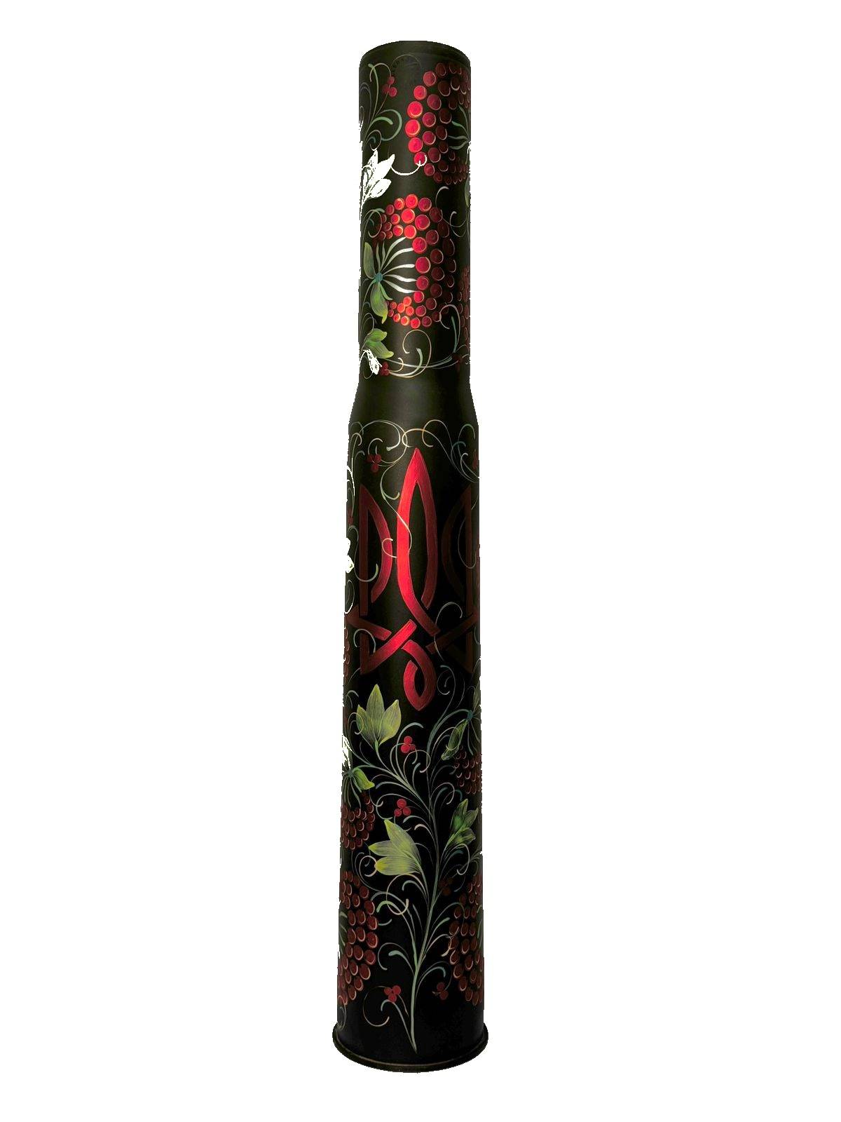 Перед вами – гільза від протитанкової гармати калібром 100 мм, яка була передана нам Захисниками з запорізького напрямку. Лот був прикрашений в майстерні, на гільзі нанесено Тризуб, навколо якого зображена грона калини. Калина в символіці України має велике значення та особливе місце в серцях українців. Ця рослина є однією з найбільш поширених та улюблених українських символів, яка втілює в собі багато значущих понять та ідей. Перш за все, калина символізує красу та життєву силу. Її яскраві червоні ягоди та зелене листя надають їй неповторний вигляд, що привертає увагу та вражає своєю енергією. Також калина вважається символом любові та родинного щастя. Українці вірять, що там, де росте калина, панує гармонія та злагода. Крім того, калина є символом національної єдності та духовності. Вона є невід'ємною частиною української культури та традицій. Її зображення можна знайти на національних вишиванках, вишитих рушниках та інших народних виробах. Крім того, калина часто використовується у народних піснях та легендах, що підкреслює її важливе значення для українського народу. Також ця ягода є символом відваги та витримки. Вона росте на найнепридатніших для цвітіння місцях, але при цьому залишається сильною та непохитною. Це символізує національну гордість та волю українського народу. У загальному, значення калини в символіці України вкладає в себе багато понять та ідей, які є важливими для українського народу. Вона є не тільки красивою рослиною, але й символом національної ідентичності та духовності, який об'єднує українців та надихає на досягнення нових вершин.