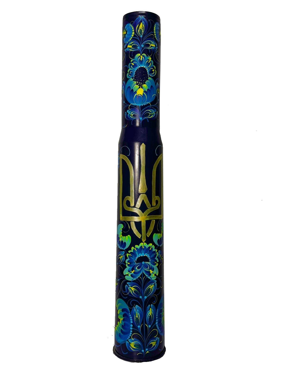 Чергова експозиція – відстріляна на запорізькому напрямку та передана нам гільза від протитанкової гармати МТ-112 «Рапіра» калібром 100 мм. Особливістю даного лоту є унікальний розпис в майстерні з використанням акрилових фарб та лаку. В центрі композиції – Тризуб, герб України, а навколо – волошки. Ці квіти в українській символіці мають багатозначне значення і відображаються у різних аспектах культури та історії України. Перш за все, волошки є одним з найпоширеніших квітів на українських землях і символізують красу та непорушність природи. Вони також є символом весни та відродження, оскільки ці квіти з'являються на початку теплого сезону після зимової сплячки. У народних традиціях волошки часто використовувалися для прикрашання вишиванок та іншого народного рукоділля. Вони також були важливим елементом українського весільного обряду, де використовувалися як символ любові та плодючості. У політичній символіці волошки також мають своє місце та значення. Вони стали одним з основних символів українського націоналізму та боротьби за незалежність. Їх зображення часто використовувалося на прапорах та емблемах українських політичних партій та організацій. Крім того, волошки є символом жіночої краси та ніжності. Вони часто асоціюються з українськими жінками, які відображають силу та витривалість у важких умовах, але при цьому залишаються ніжними та прекрасними. Значення волошок в українській символіці є багатогранним та відображає різні аспекти української культури та історії. Волошки є не тільки прекрасними квітами, але й символом національної ідентичності та патріотизму. Таким чином, волошки є важливою частиною української символіки та відображають багатогранність та багатство української культури