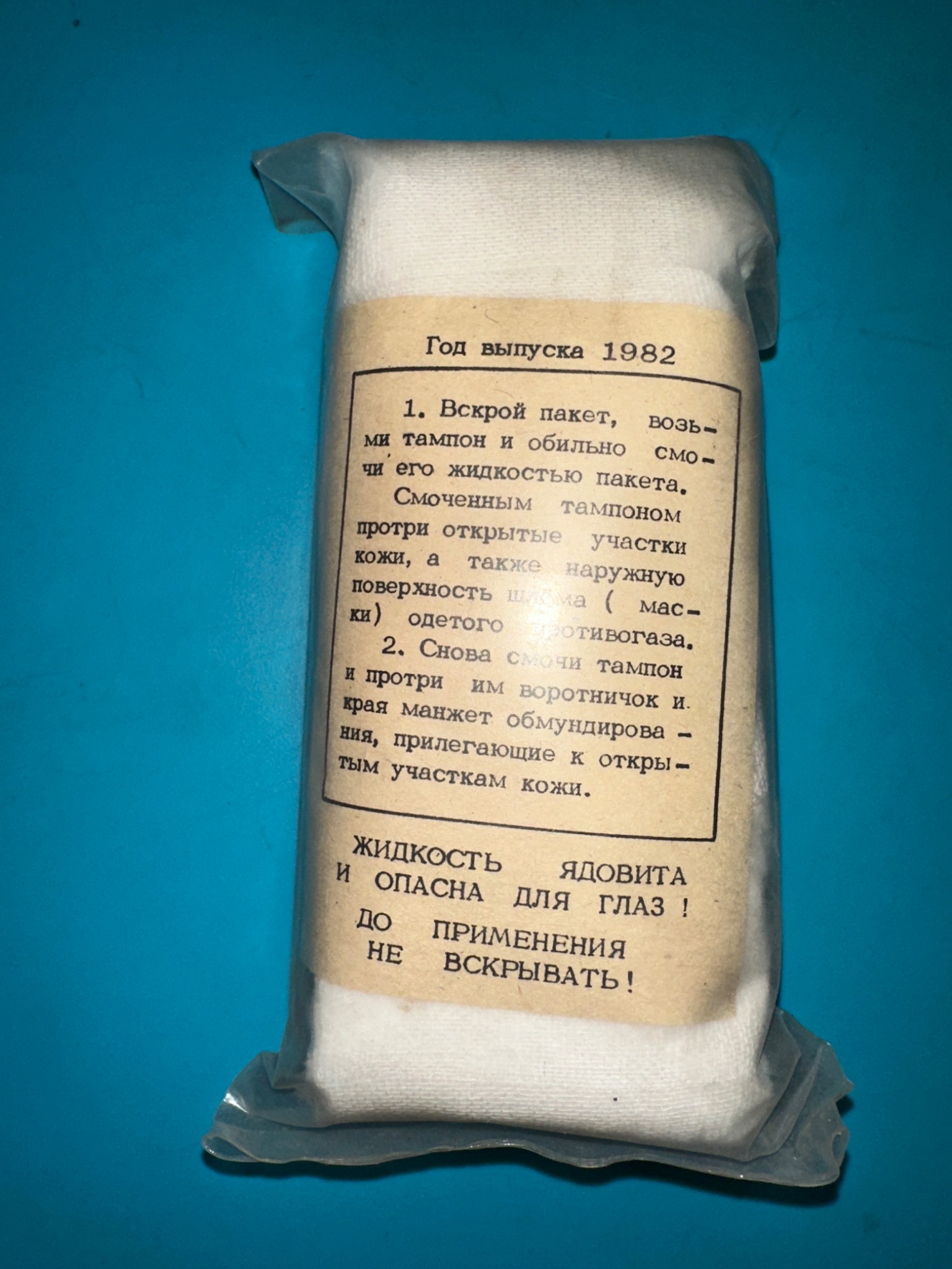 На зображенні показано індивідуальний протихімічний пакет (ІПП) з інструкцією із застосування, виготовлений у 1982 році. Цей пакет призначений для знезараження шкіри та обмундирування після впливу хімічних речовин
