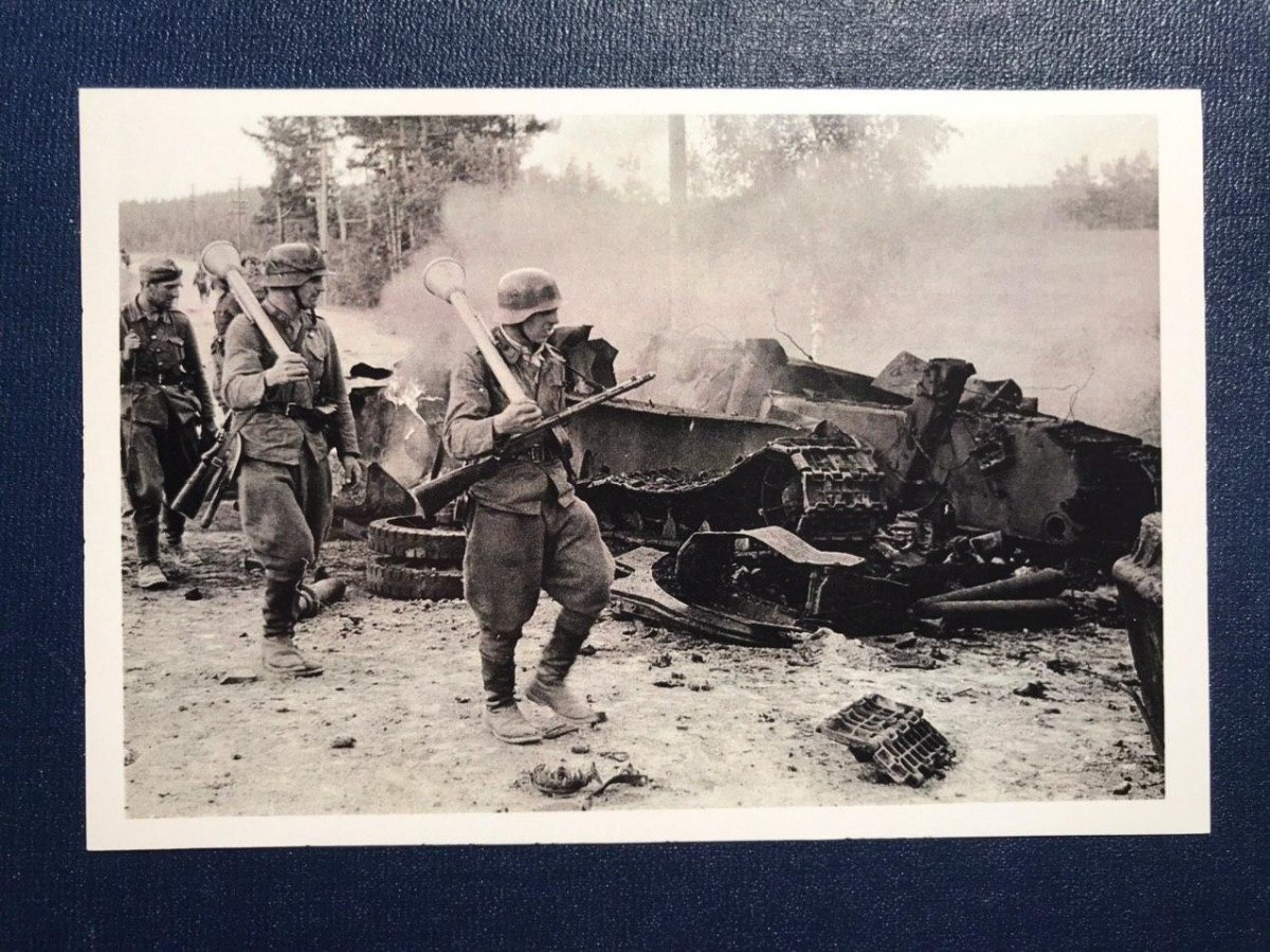 Истребители танков с фаустпатронами проходят мимо подбитого танка.